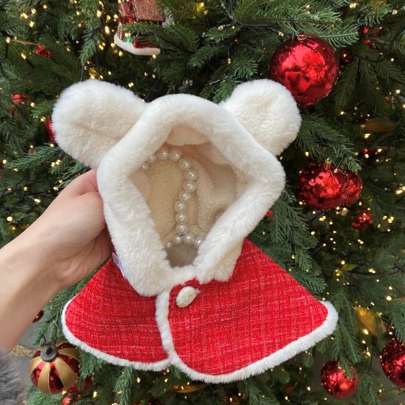 肌寒い冬に嬉しいファーケープがクリスマスにぴったりのとっても可愛いカラーリングにクマ耳フードをプラス♡