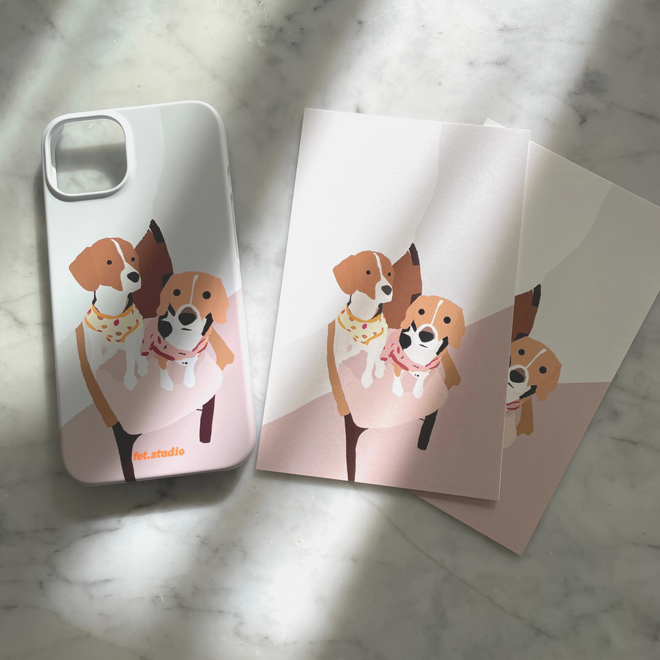 韓国で大注目のデザインスタジオ 『fet.studio』とコラボレーションした「iPhoneケース」「ポストカード」「デコレーションシール」の2匹用SETです。