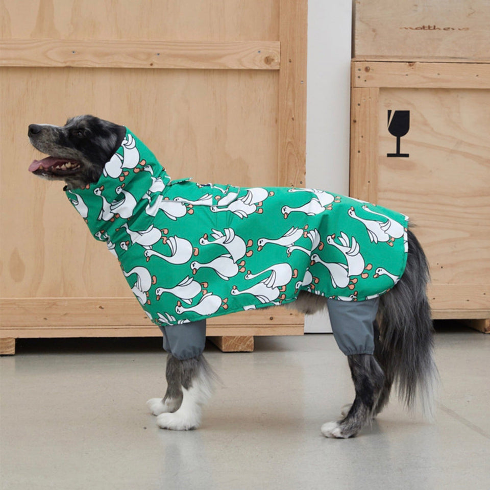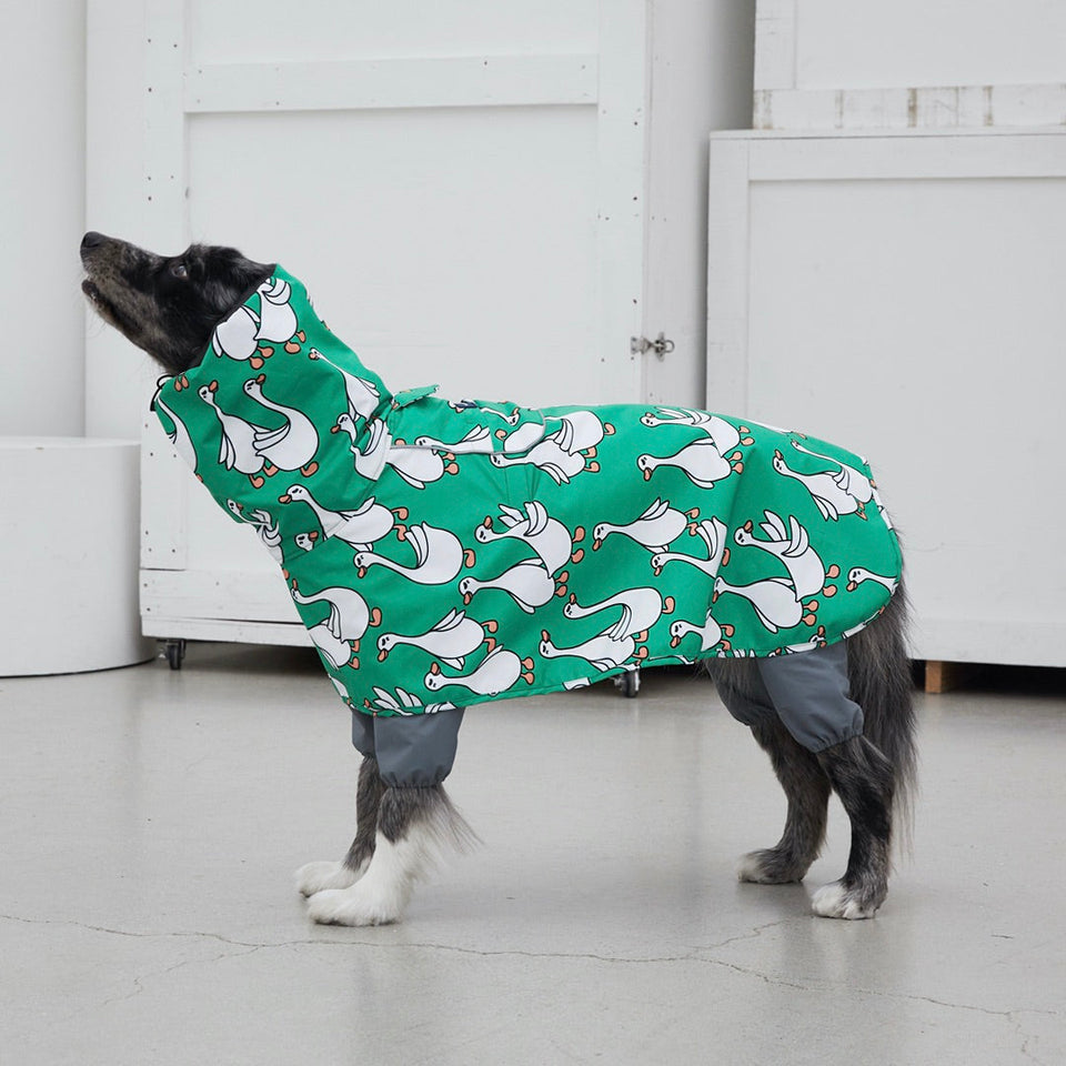 生地には高密度100%防水生地を使用し、愛犬の体型に配慮したパターンでお尻までしっかり雨から守ることが可能。