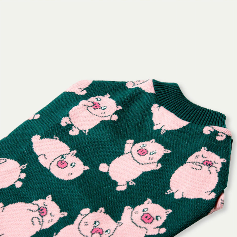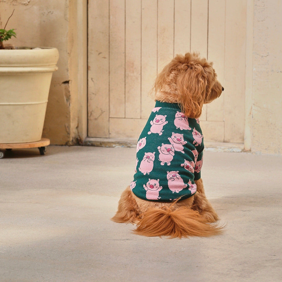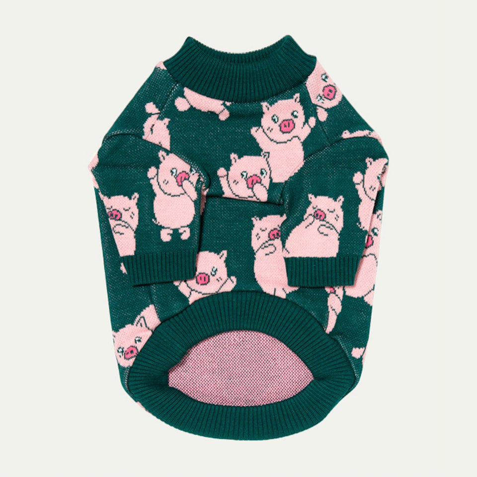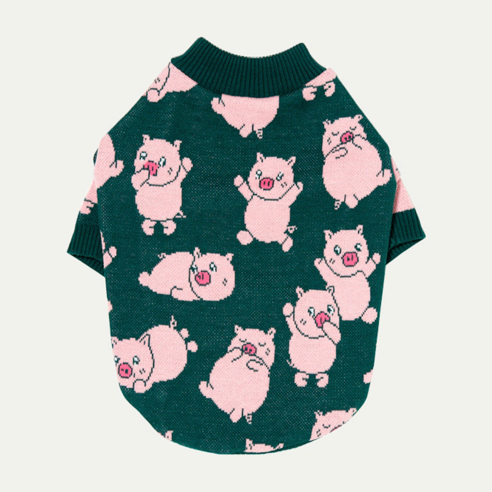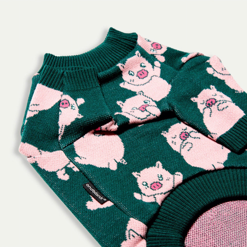 POPなアイコンと独自のデザインセンスで高品質な商品が大人気な韓国ブランド"andblank"のティールグリーンのボディに豚のイラストが可愛いニットです。