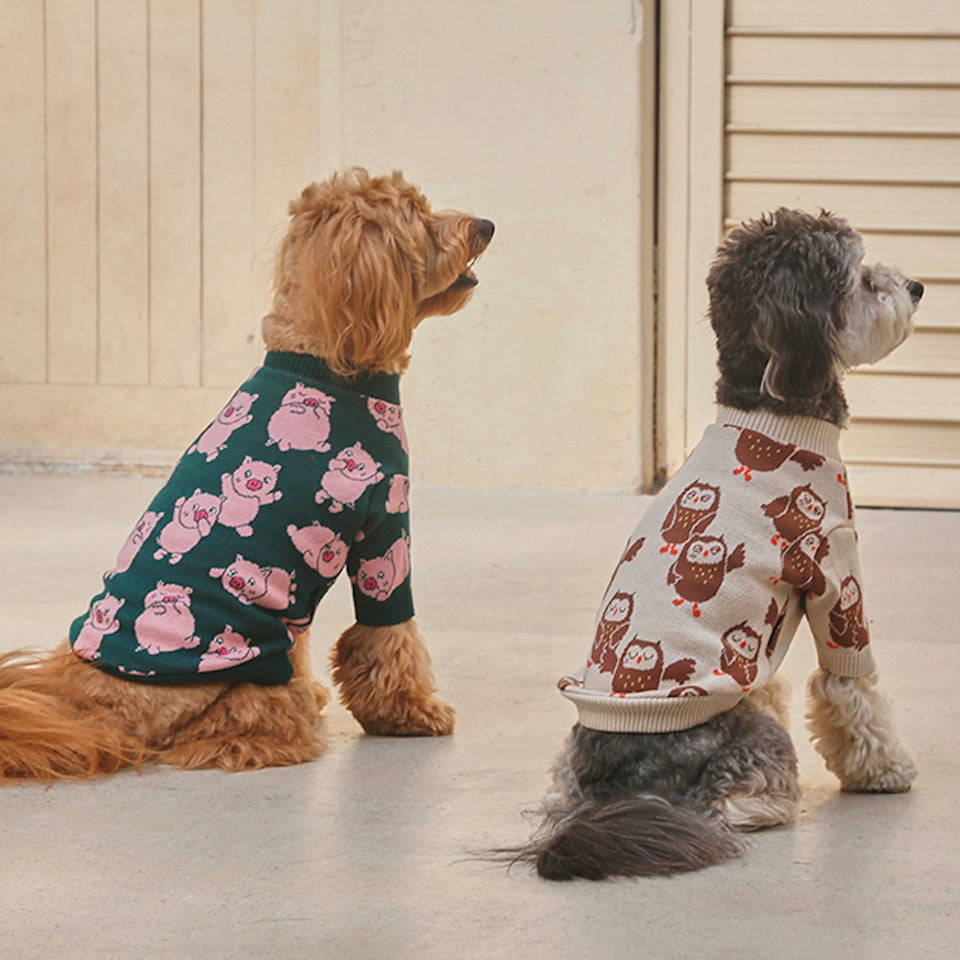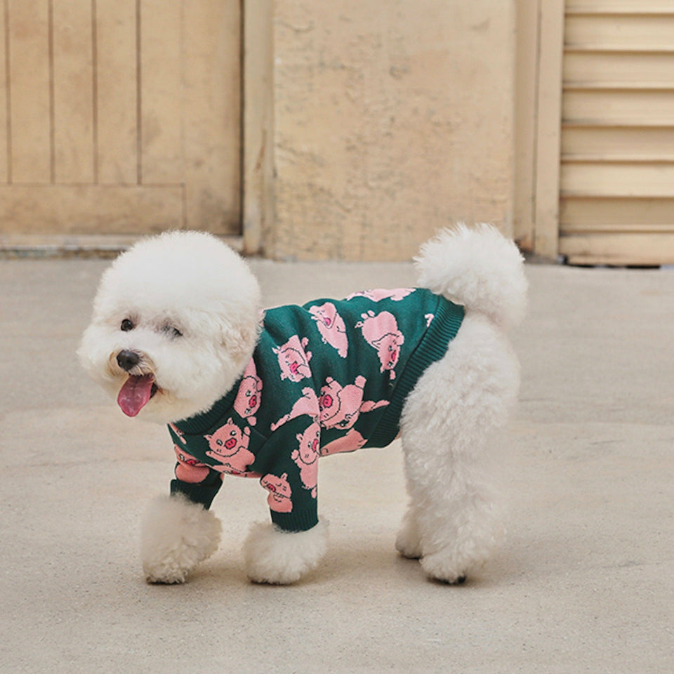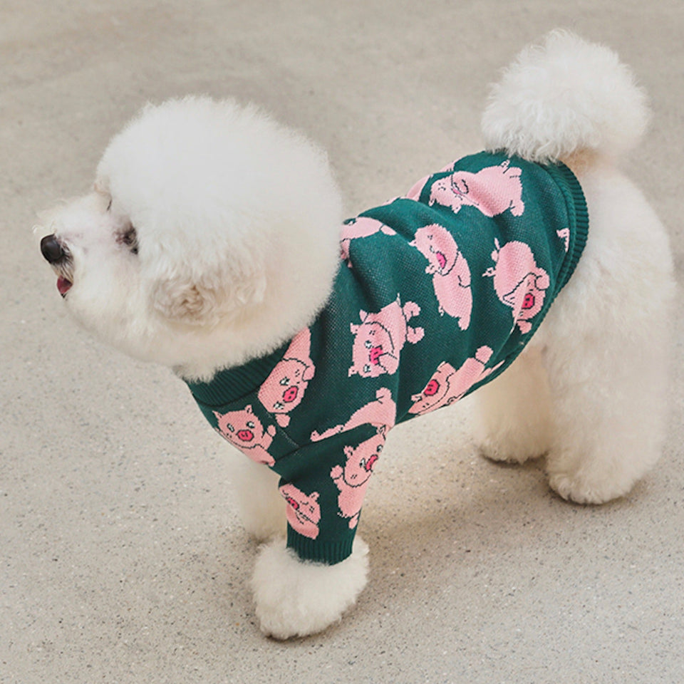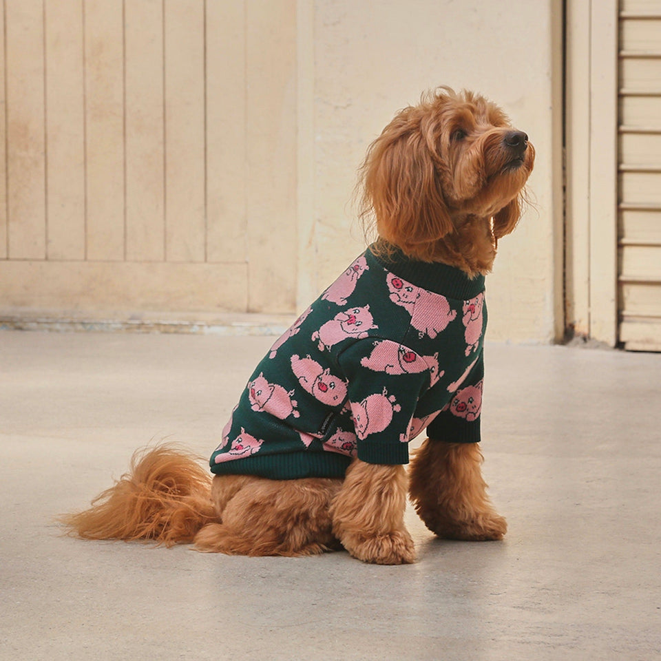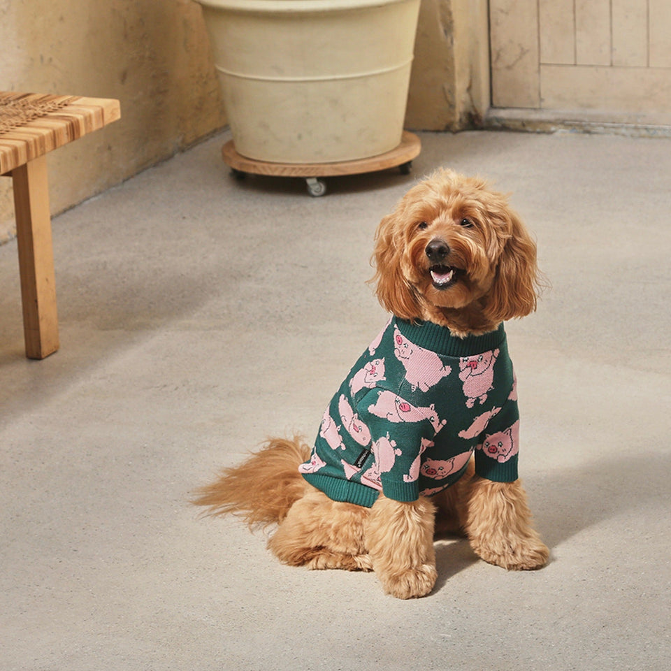 POPなアイコンと独自のデザインセンスで高品質な商品が大人気な韓国ブランド"andblank"のティールグリーンのボディに豚のイラストが可愛いニットです。