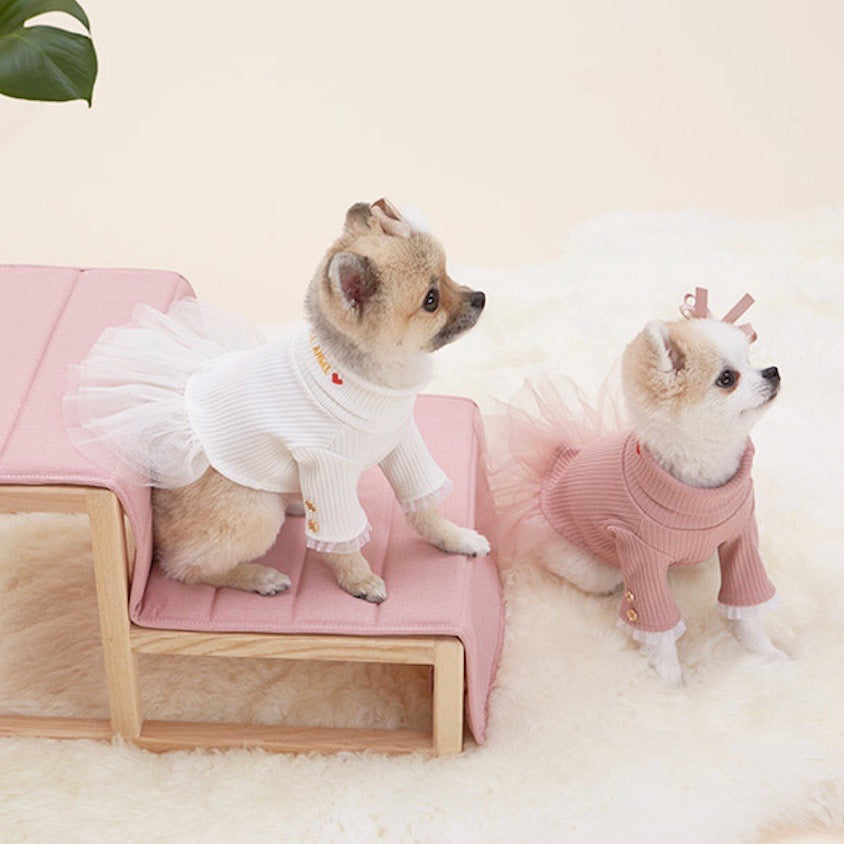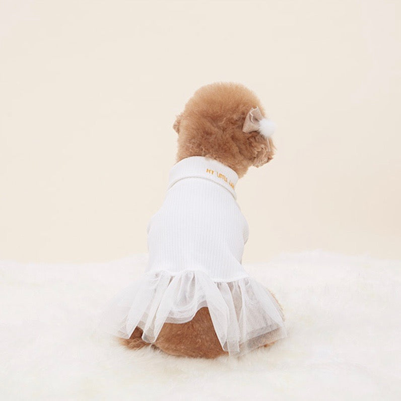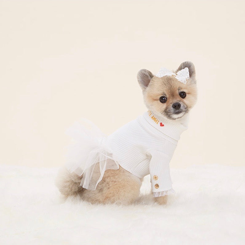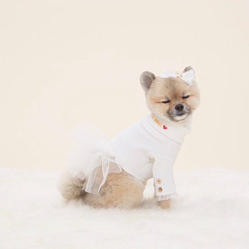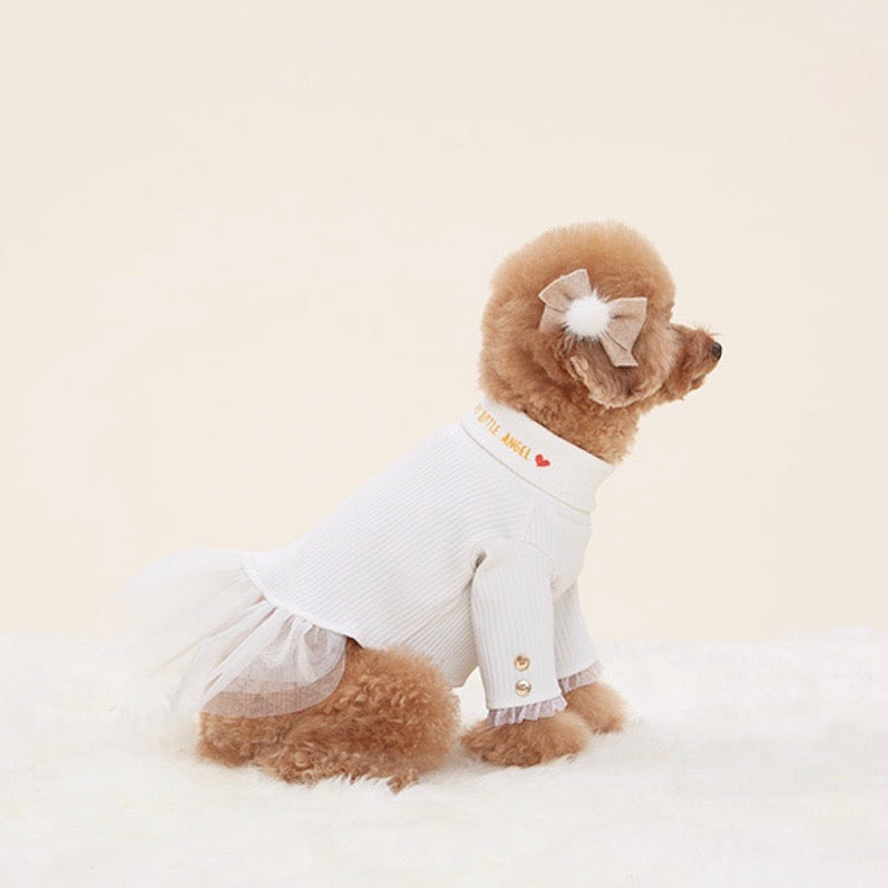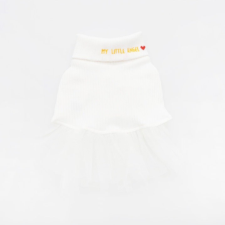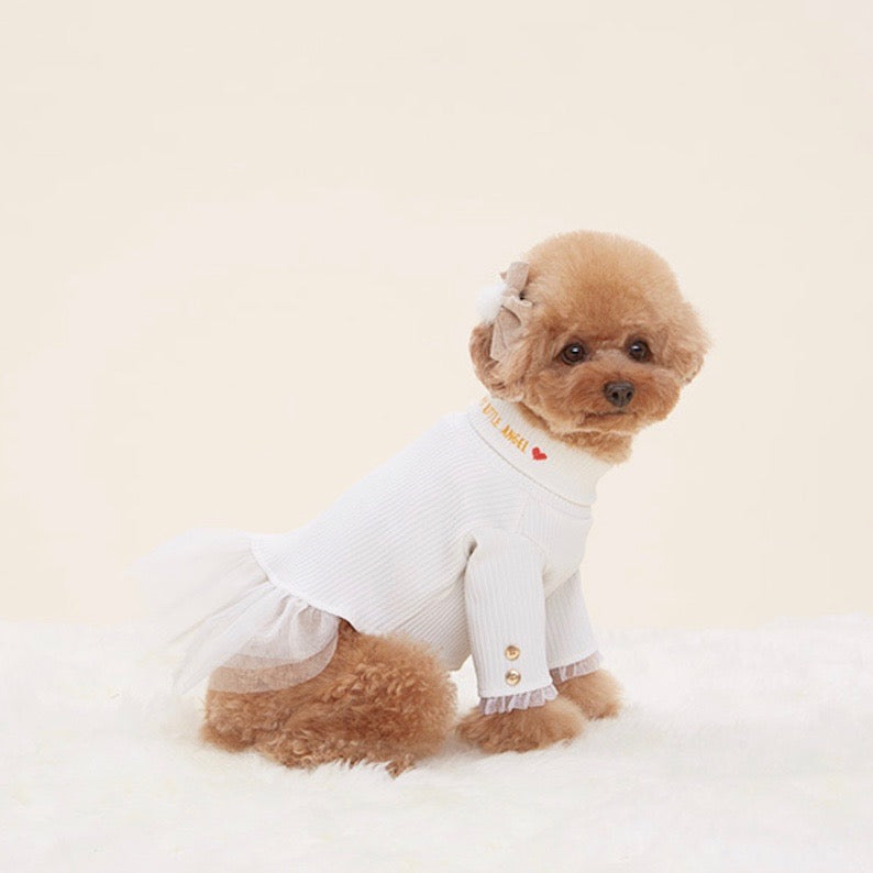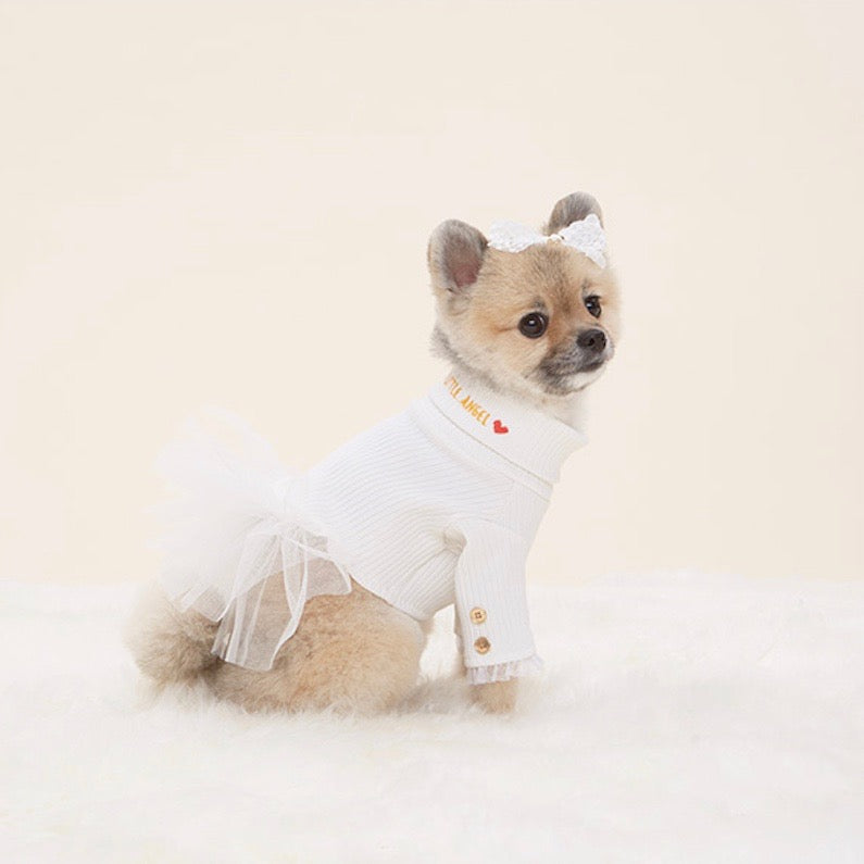 タートルネックの襟元に刺繍された『My little angel』がポイントのドレス!刺繍の通り、可愛い天使のような愛犬にぴったりのゴージャスなドレス!