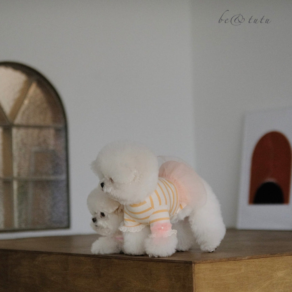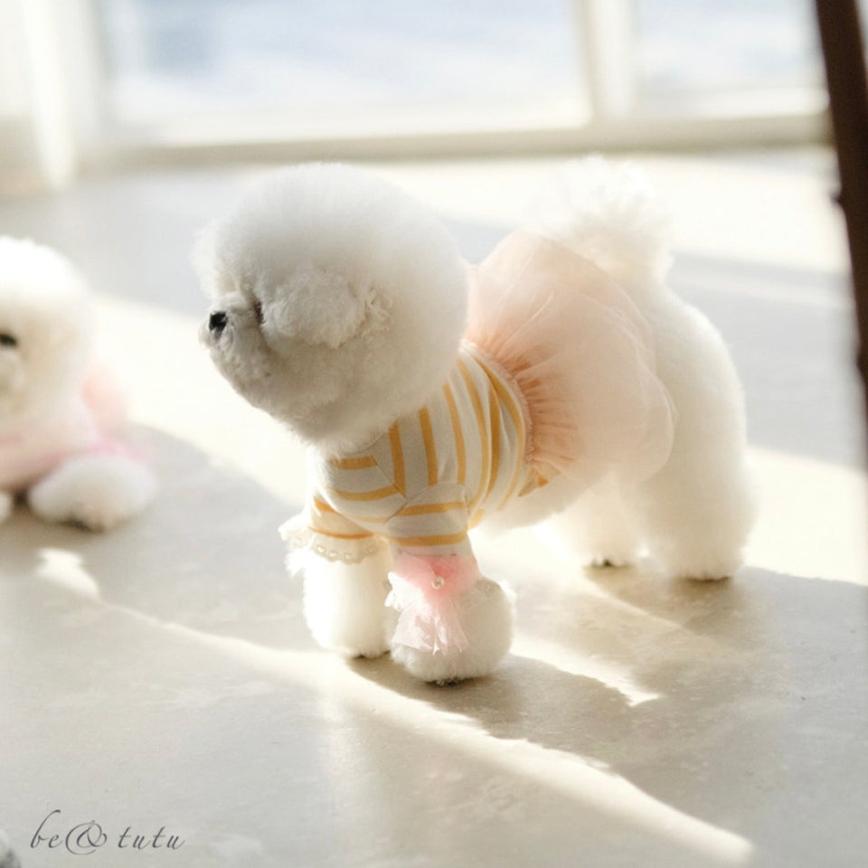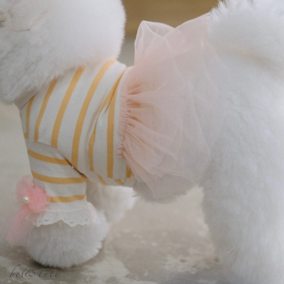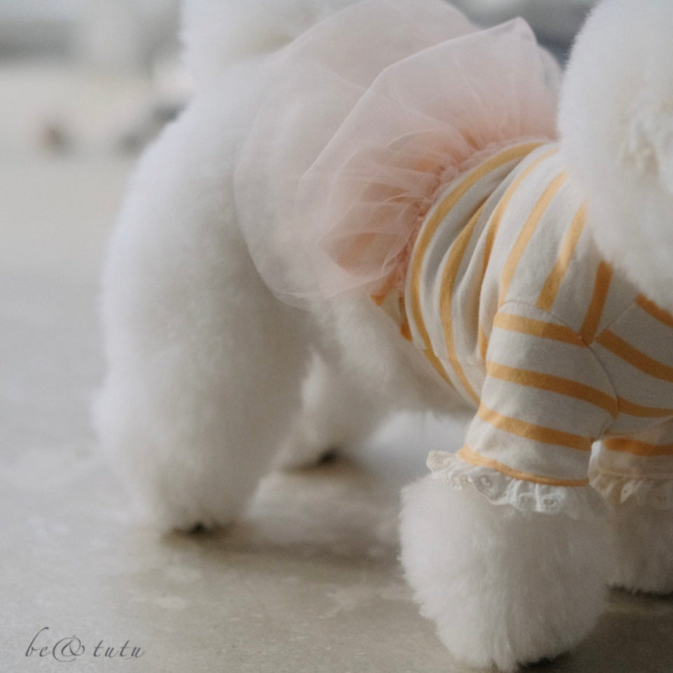 韓国国内で生産されたバイオウォッシングされたコットン生地100%のボーダー柄にチュチュ、フリル、リボンと可愛い要素を詰め込んだクロップ丈のワンピース!