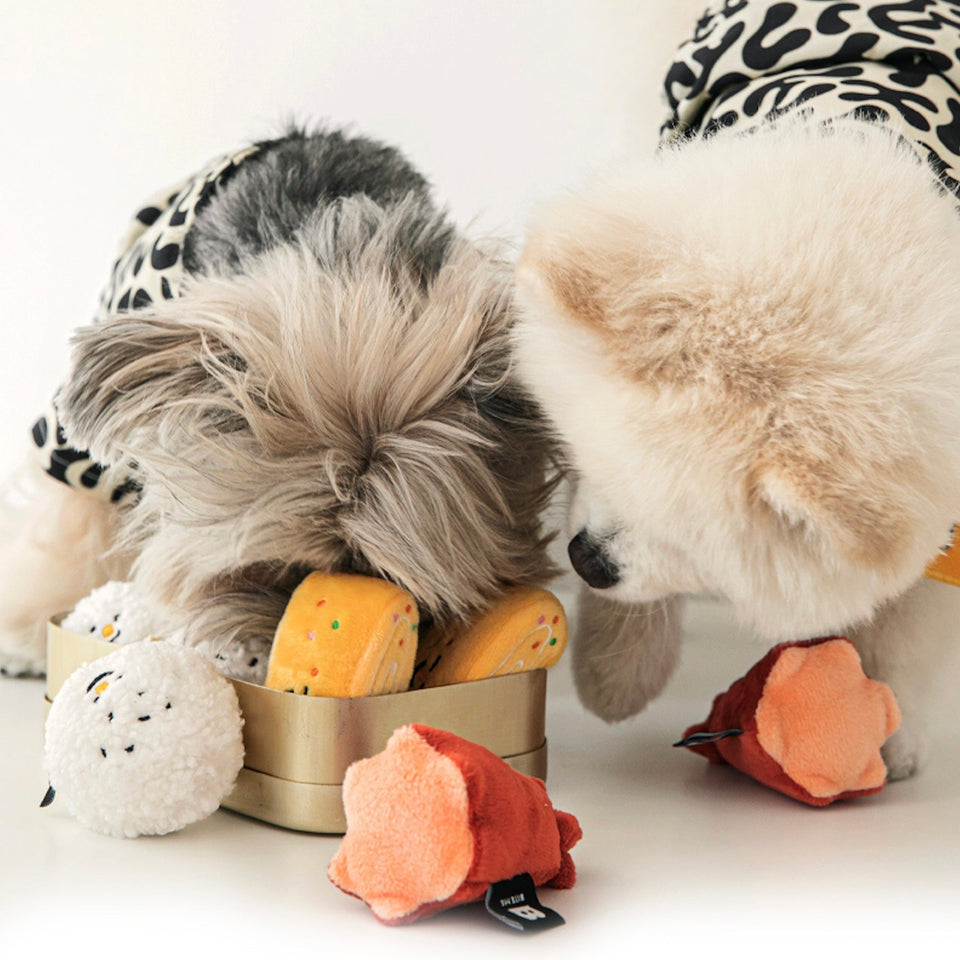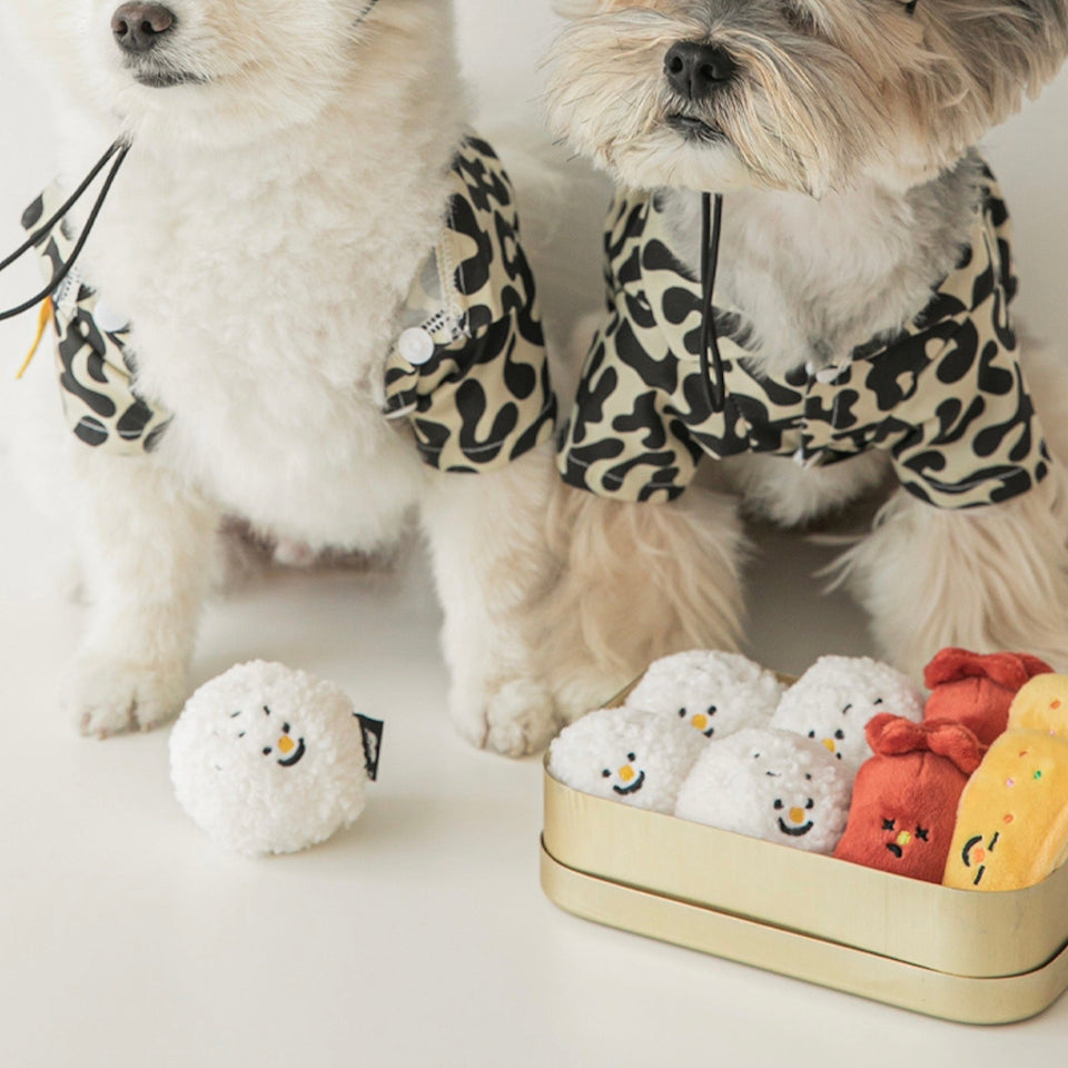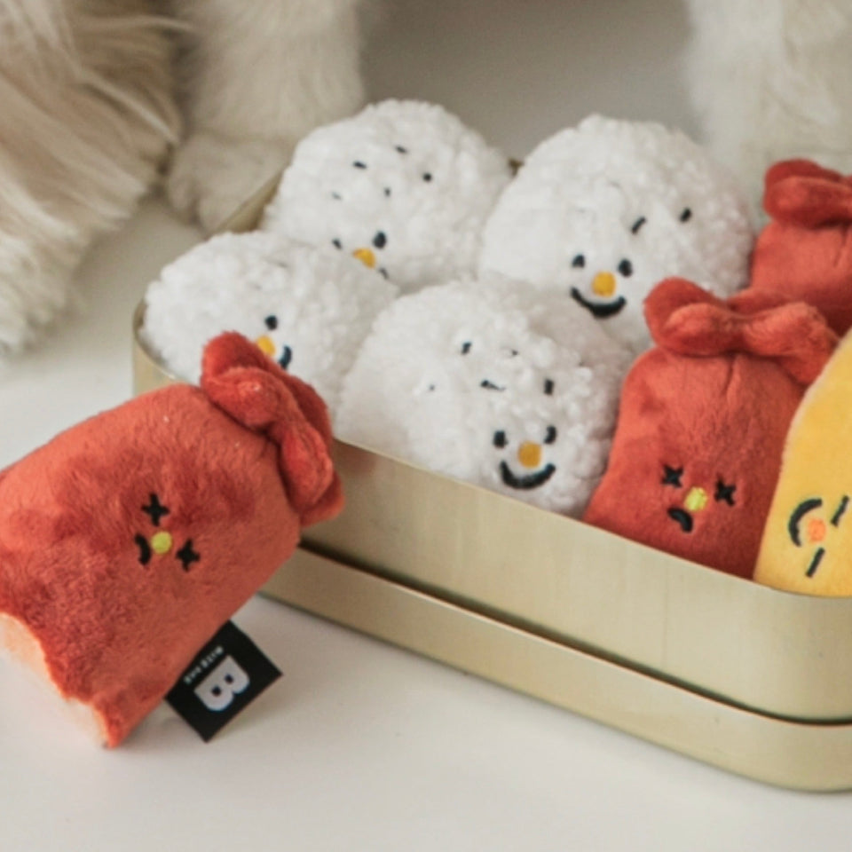 おにぎりは押すと音が鳴り、ウインナーは噛むとカサカサ鳴り、たまご焼きはポケットにおやつを隠してノーズワークができるそれぞれ異なる楽しみができる食べ物の詰め合わせボックスです♡
