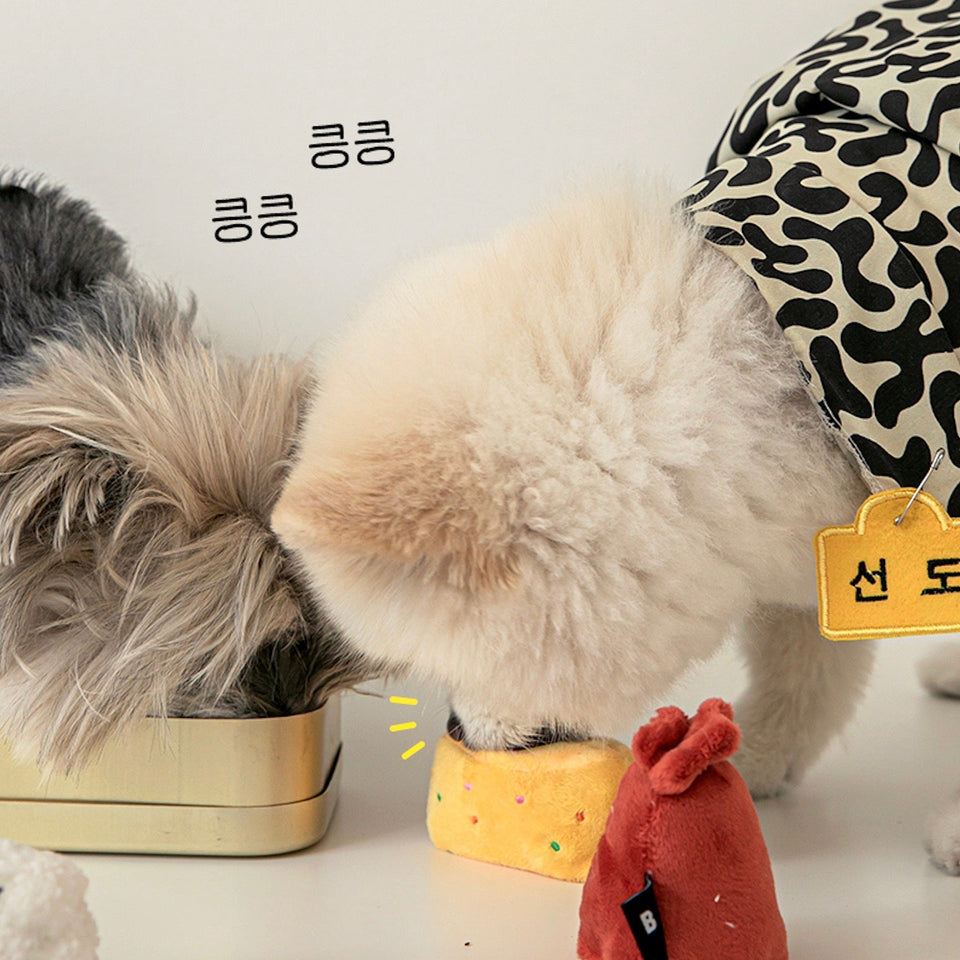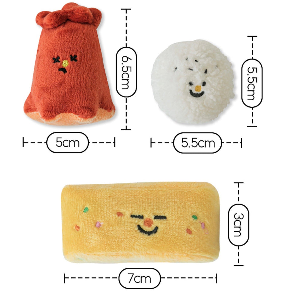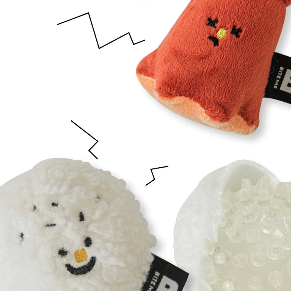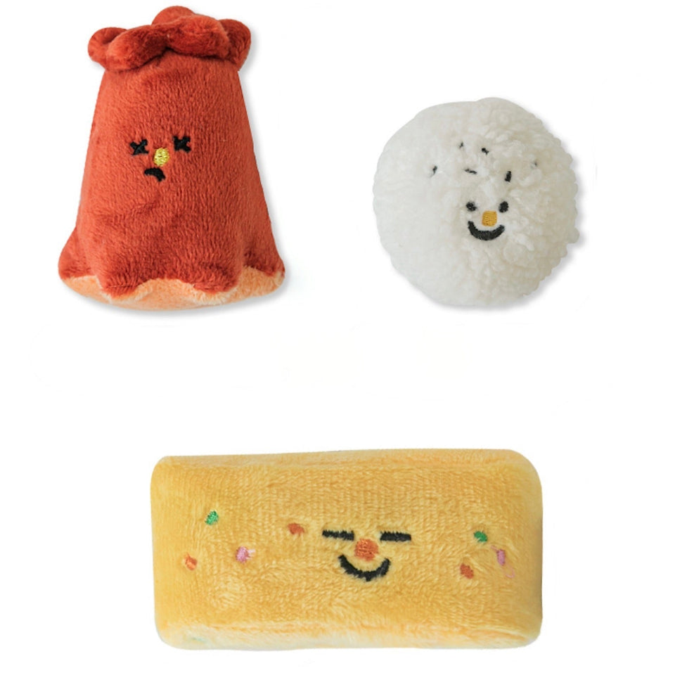 おにぎりは押すと音が鳴り、ウインナーは噛むとカサカサ鳴り、たまご焼きはポケットにおやつを隠してノーズワークができるそれぞれ異なる楽しみができる食べ物の詰め合わせボックスです♡