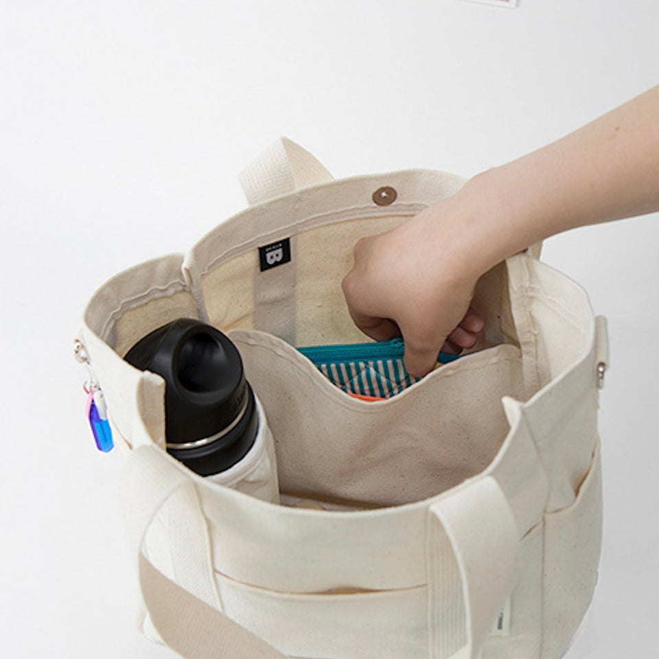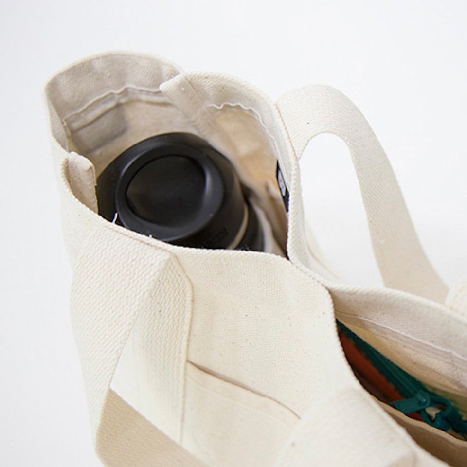 また内側にはスマートフォンや小物などを入れるのに適した大きさのポケットと、水筒やタンブラーが倒れないように立てて入れることの出来るポケットの2つがあります。