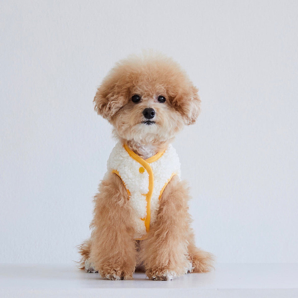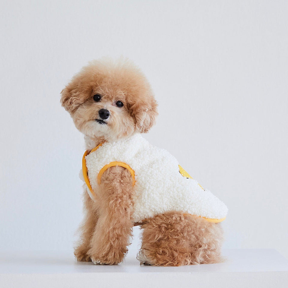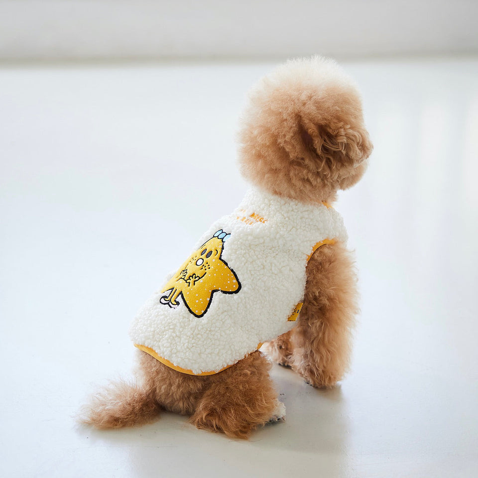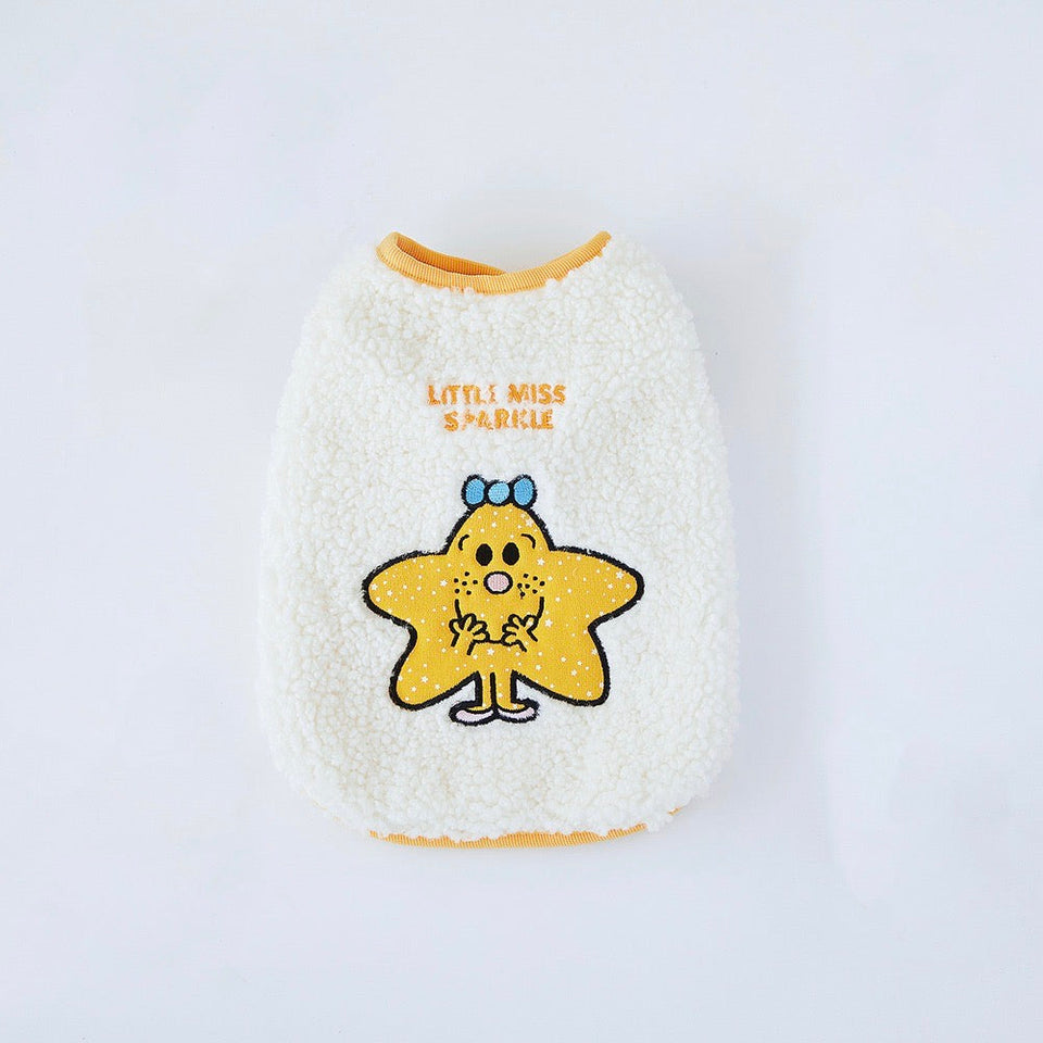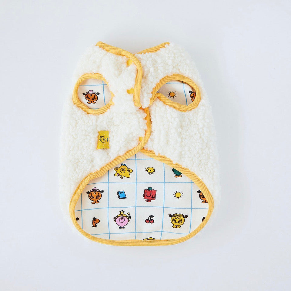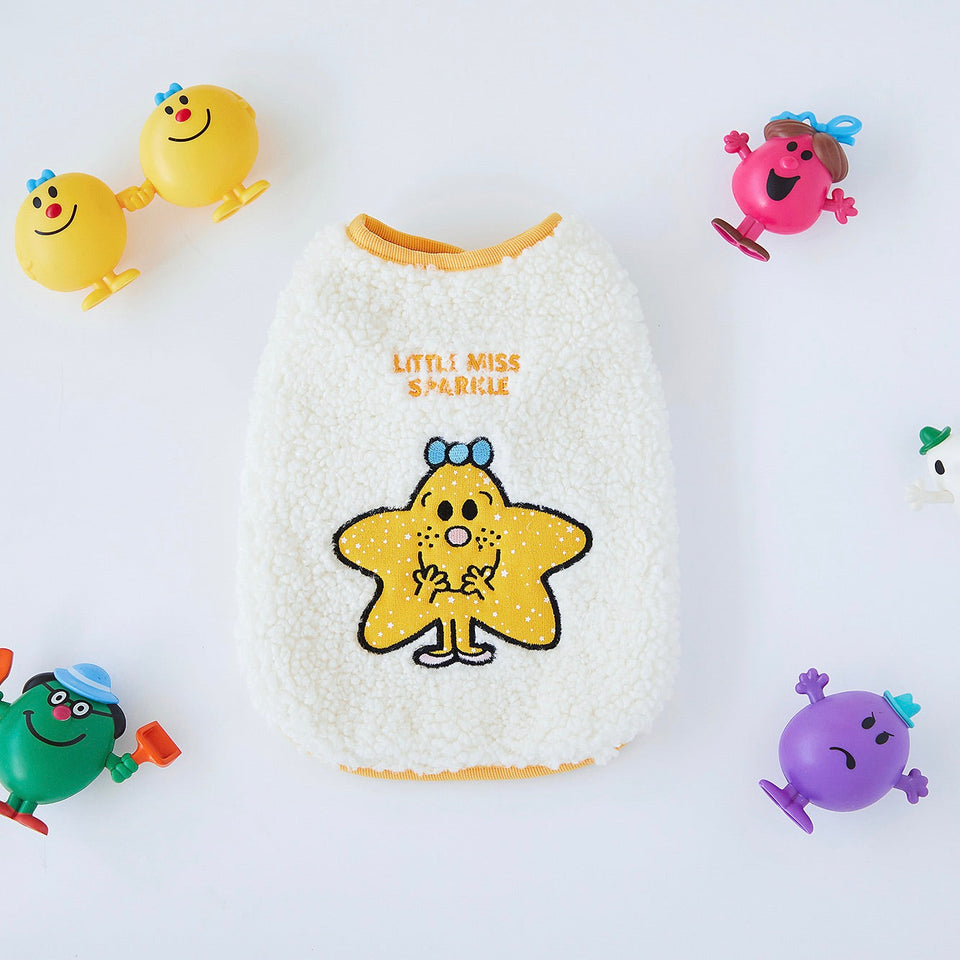 アイボリーのもこもこフリース生地のボディにイエローカラーのパイピングがアクセントになり、背中のLittle Miss Sparkleの刺繍がポイントとなった一枚!