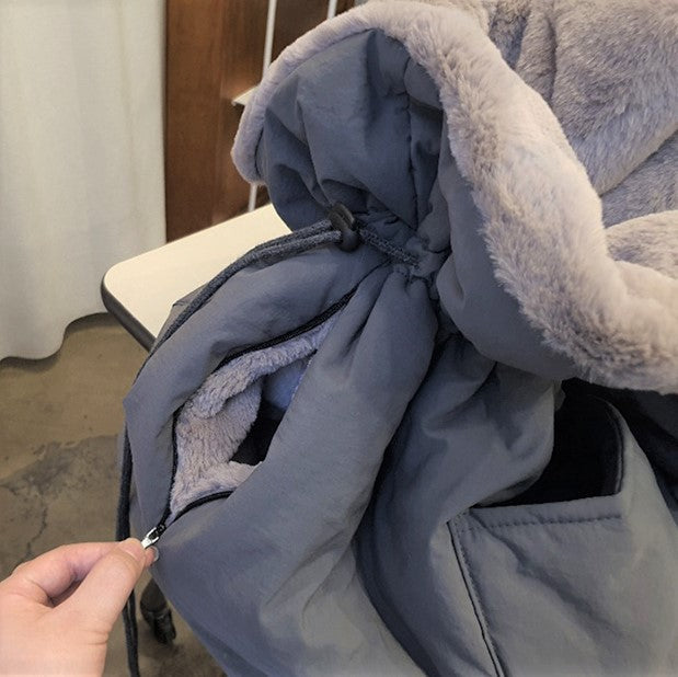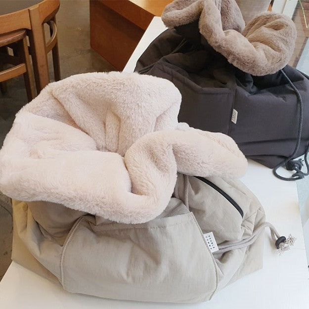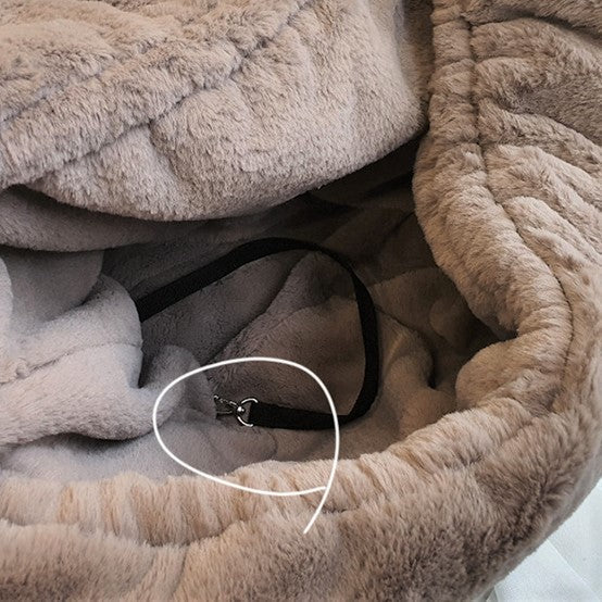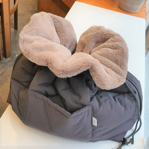 インナーファー巾着bagのサイドにはファスナーがあり、そこから顔を出すことができます。