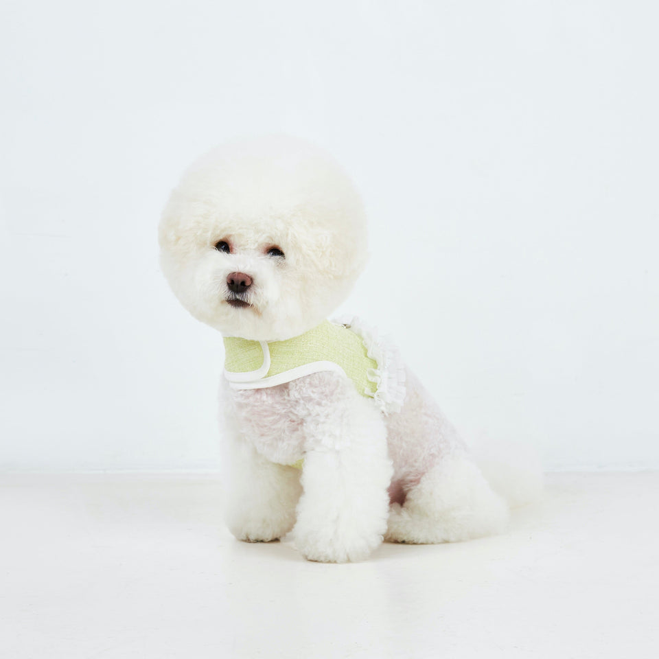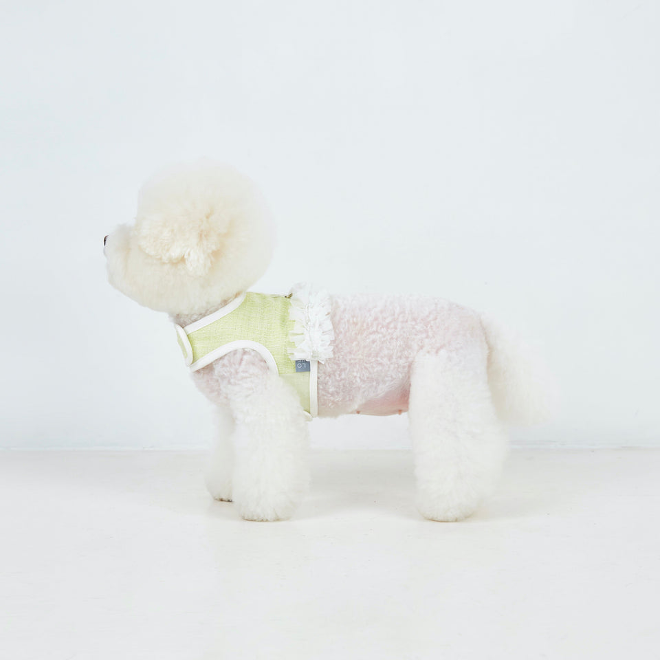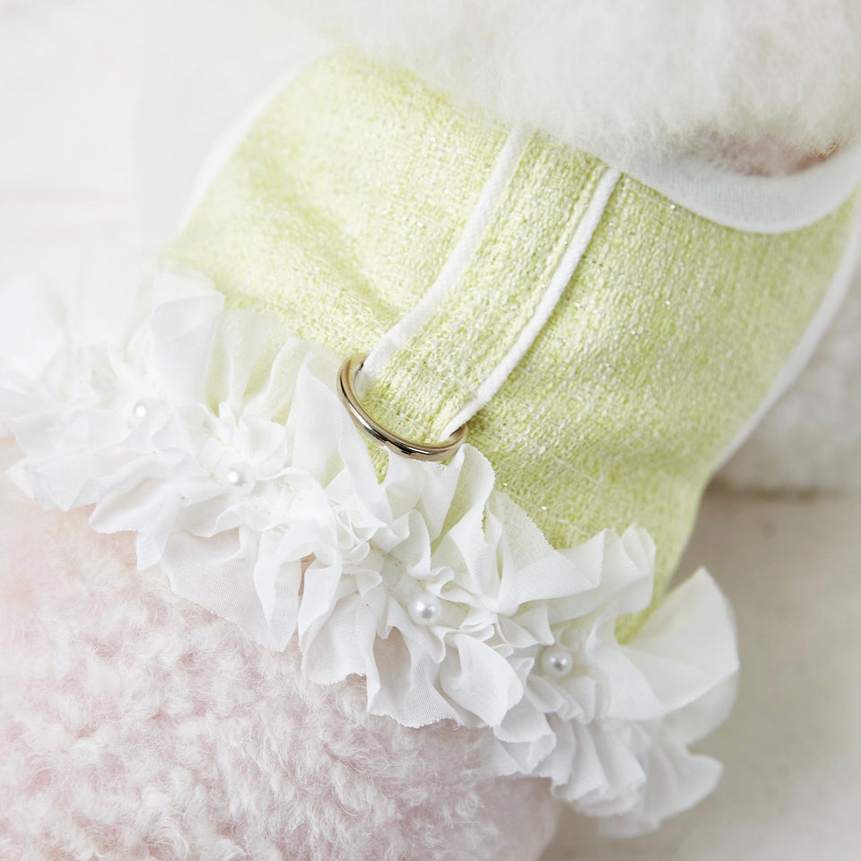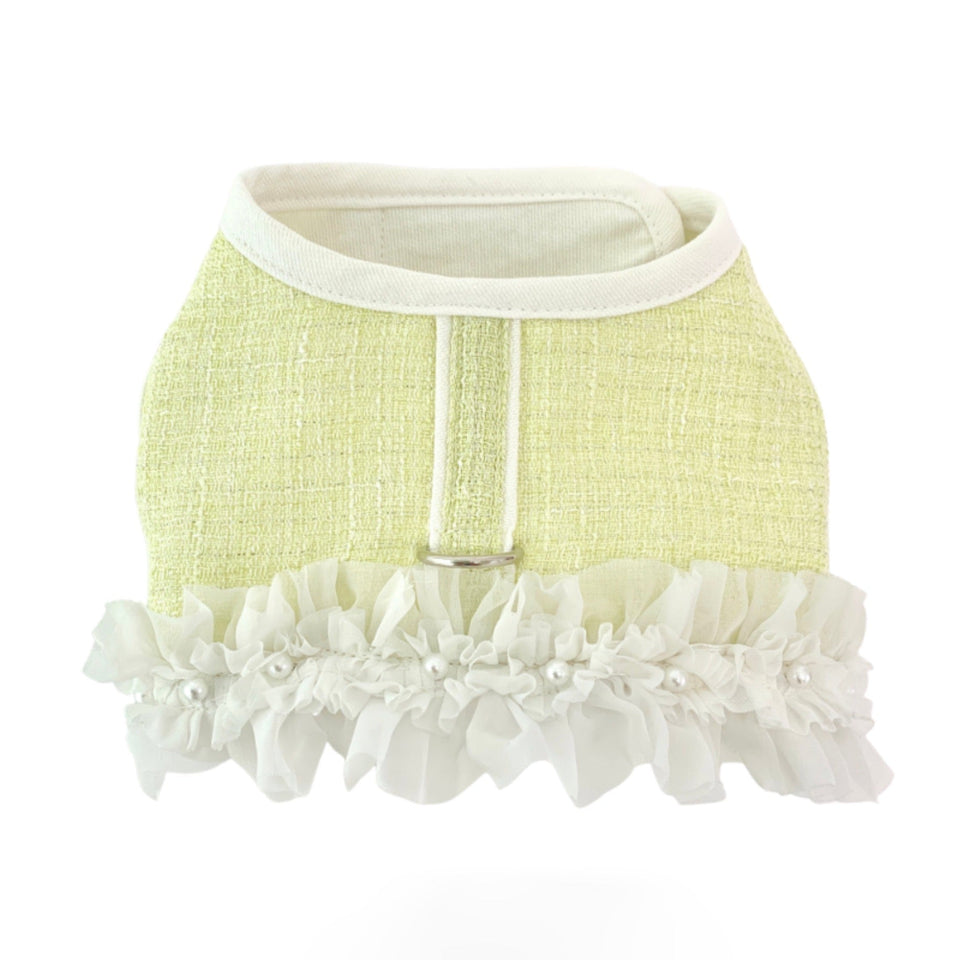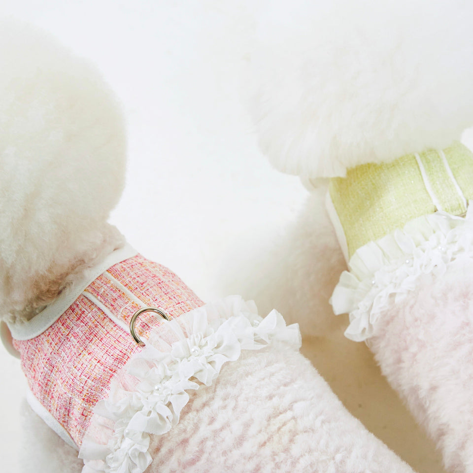 まるで洋服のようなツイードライクの生地に、裾の総フリルやパールがなどの装飾がとても繊細で華やかな高級感たっぷりのハーネス!