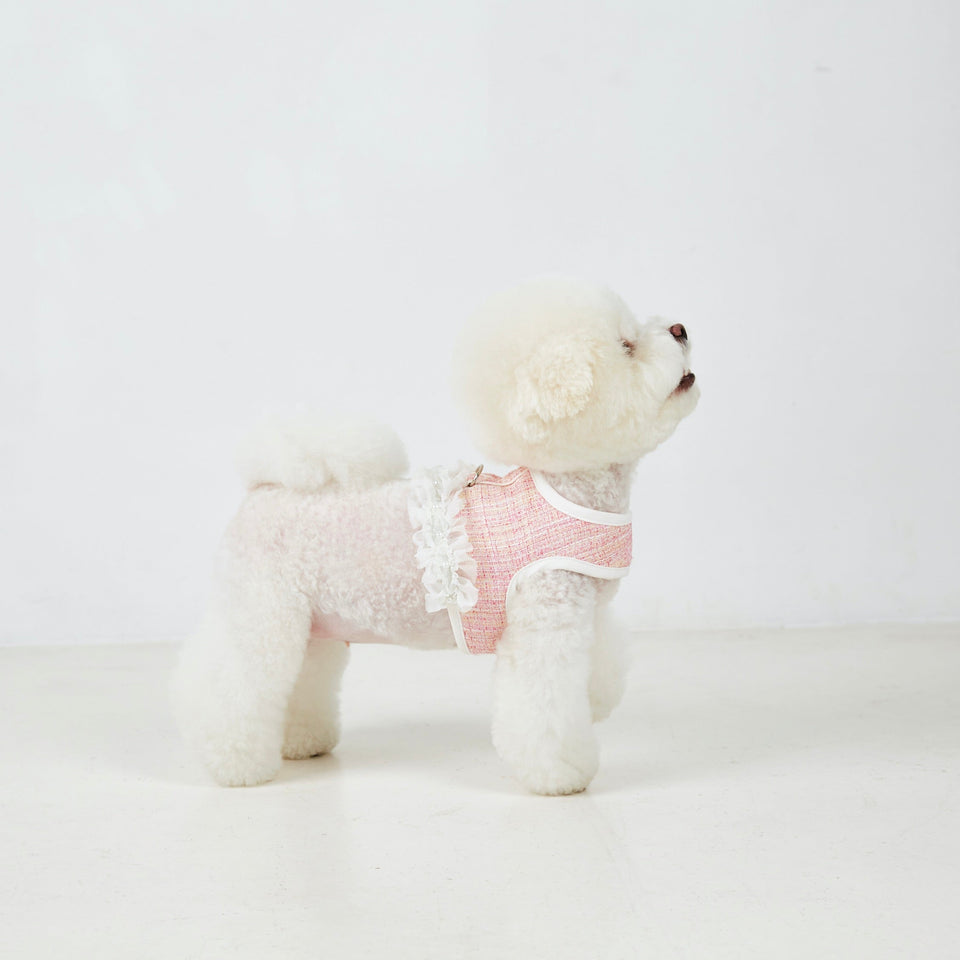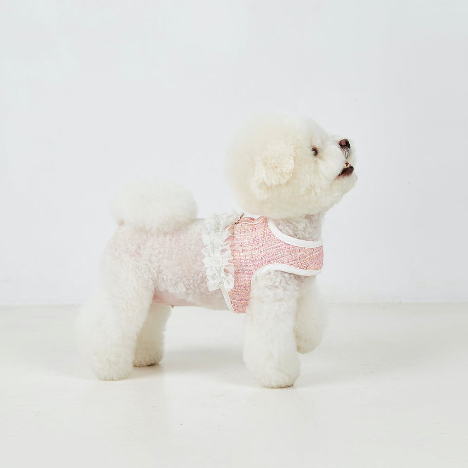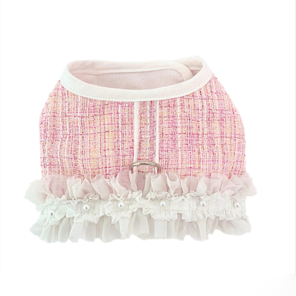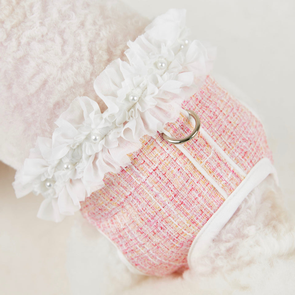 まるで洋服のようなツイードライクの生地に、裾の総フリルやパールがなどの装飾がとても繊細で華やかな高級感たっぷりのハーネス!
