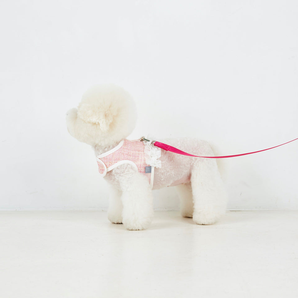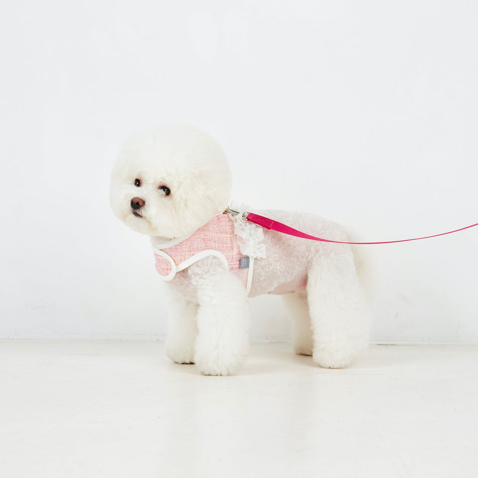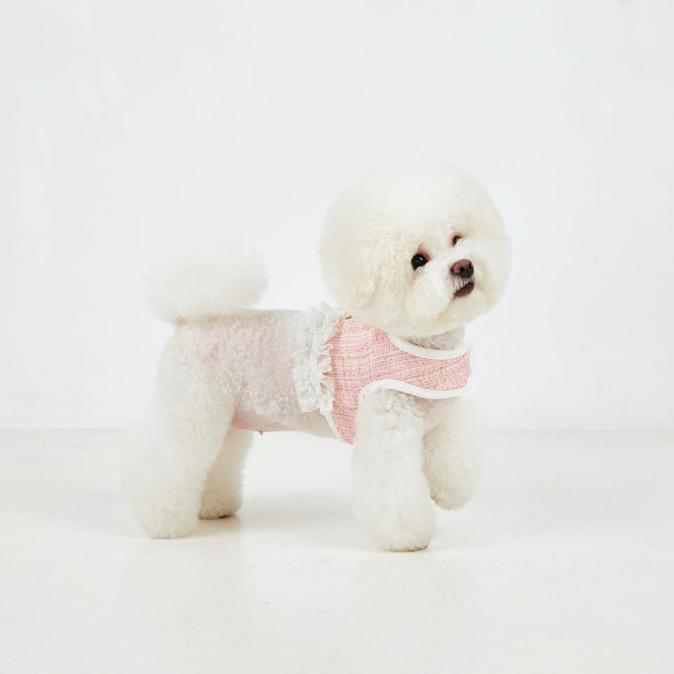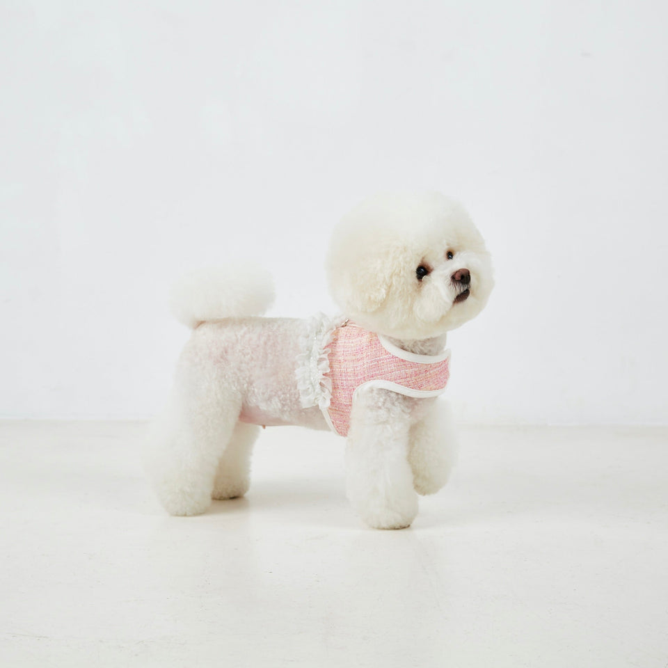 まるで洋服のようなツイードライクの生地に、裾の総フリルやパールがなどの装飾がとても繊細で華やかな高級感たっぷりのハーネス!