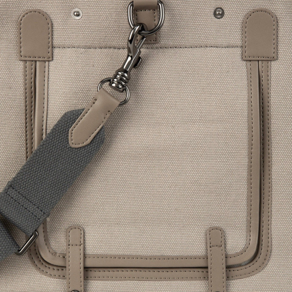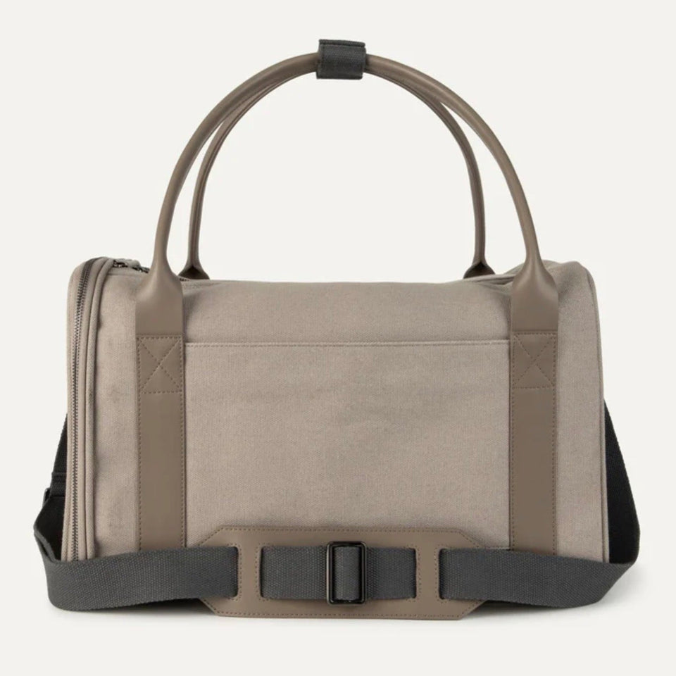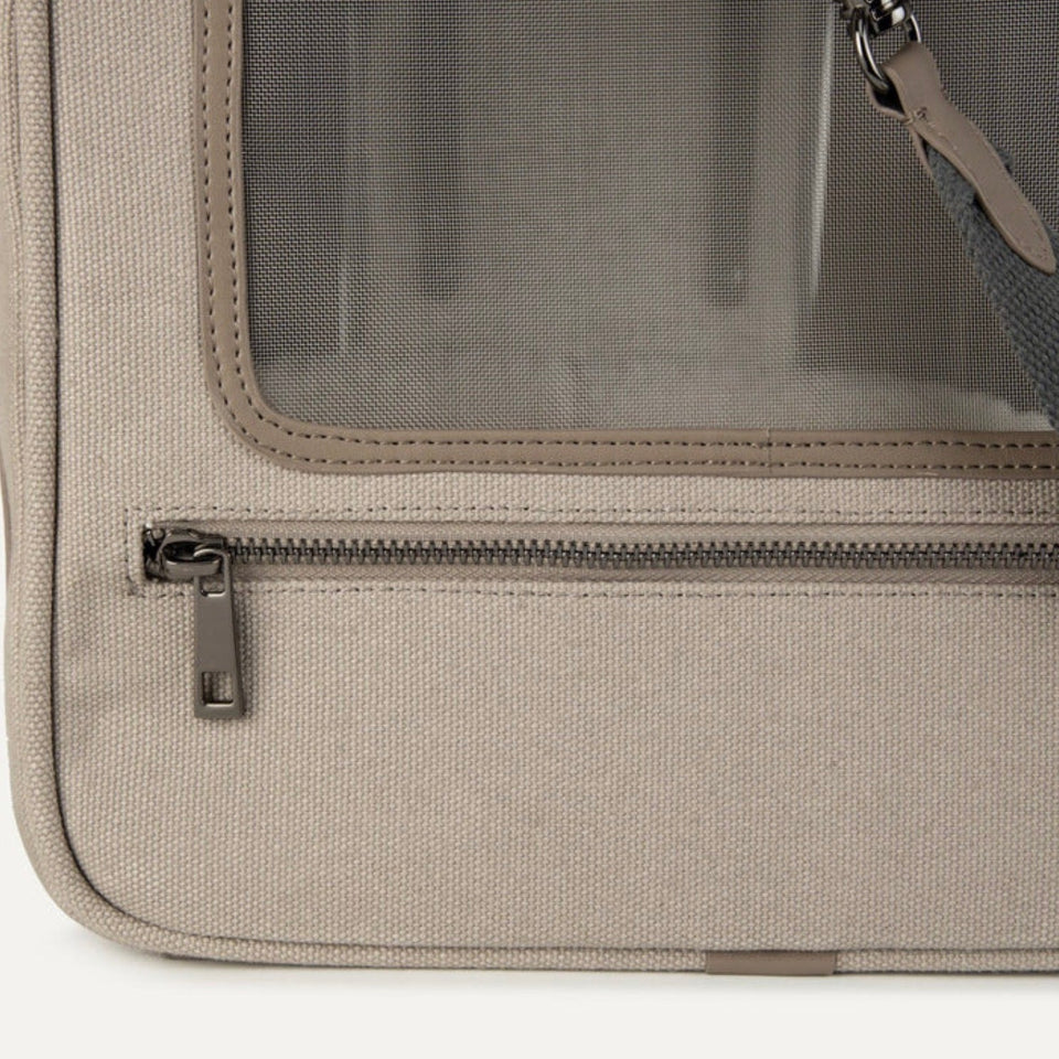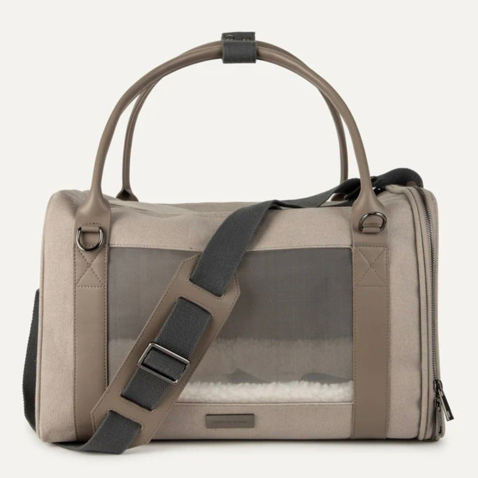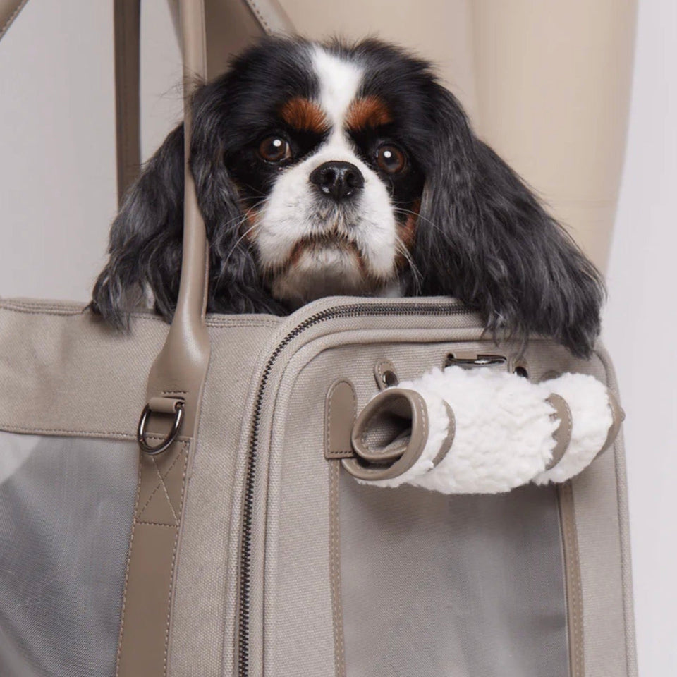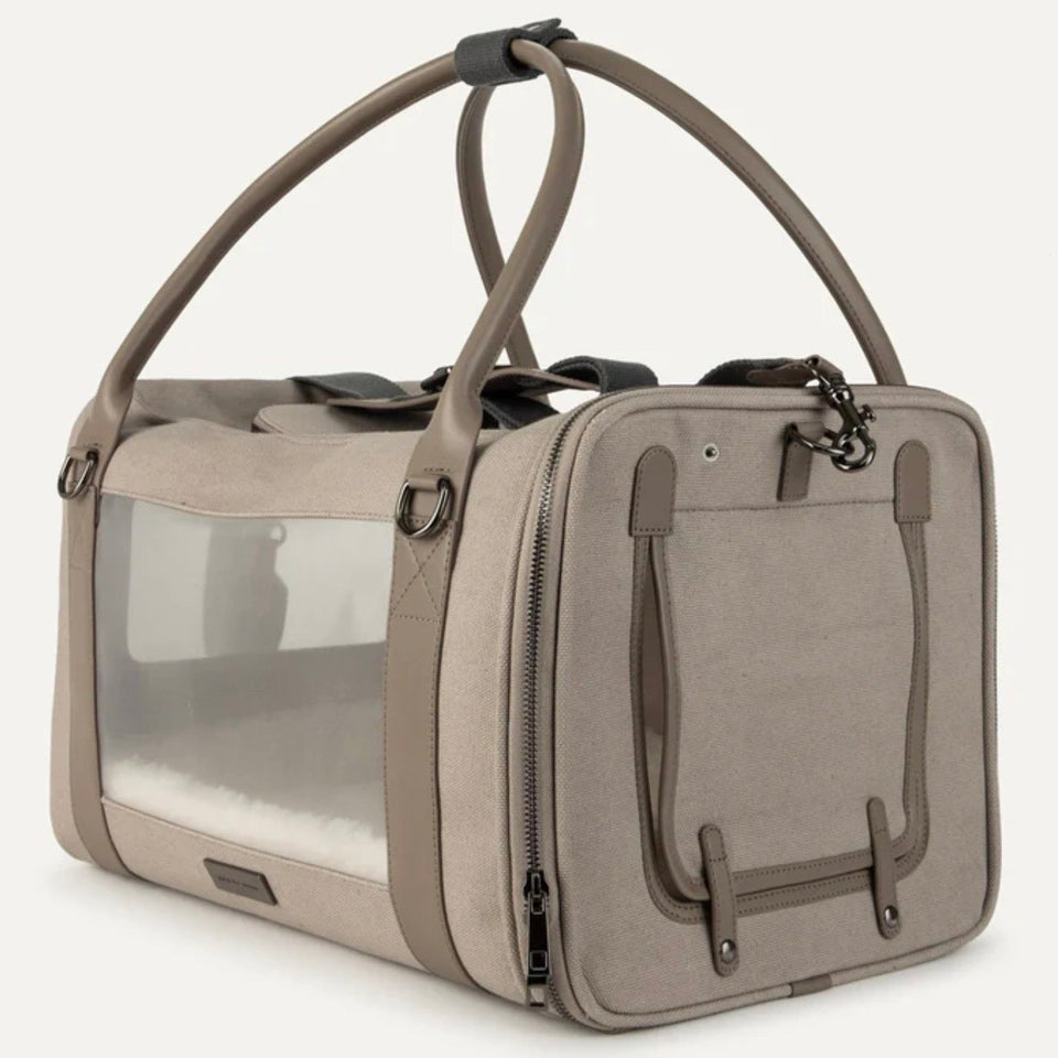 本革のトリミングとハンドル、豪華な厚手のコットンキャンバス製シェルフ、付属にはショルダーストラップ、プライバシーロールアップフラップ、わんちゃんの首輪やハーネスに安全に固定するための一体型飛び出し防止内部フックが備わっています。