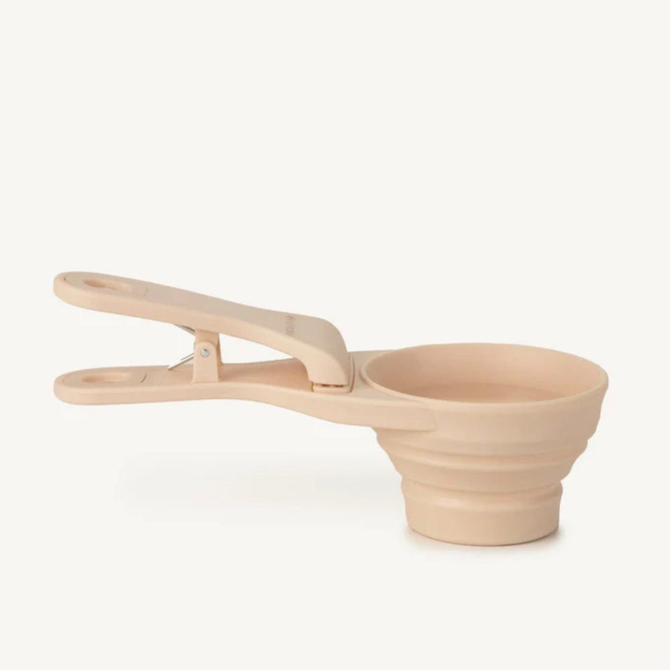 フードスコップは折りめるためスペースを節約でき、内蔵のクリップバッグが食品を新鮮に保ちます。