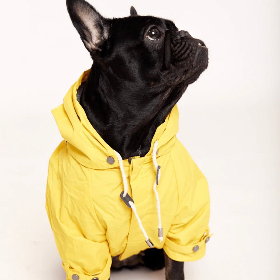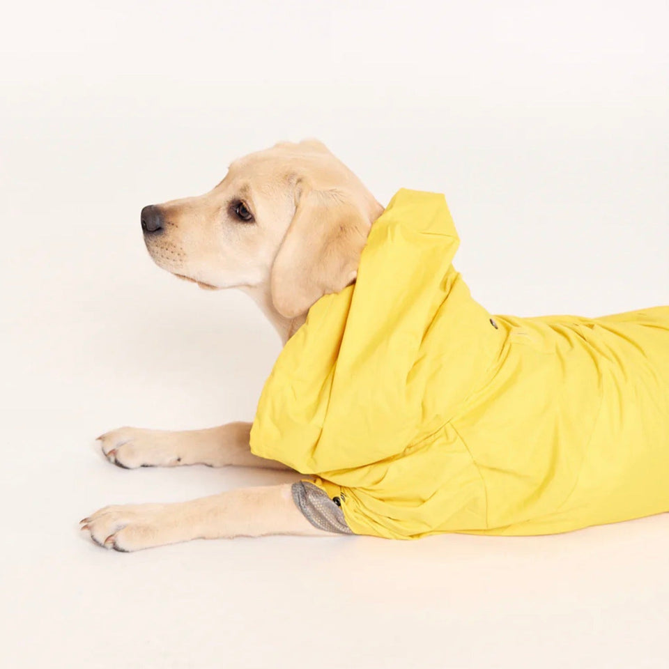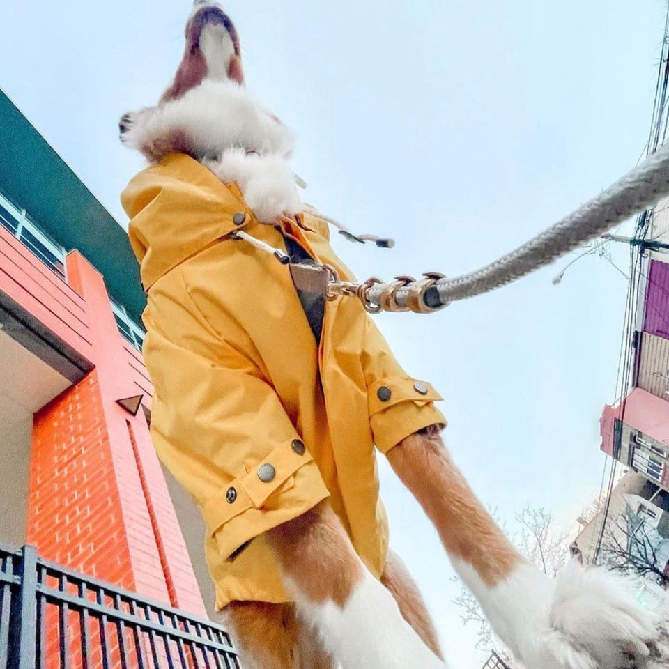 頑丈なスナップオフフード、調節可能な袖口の引き紐、メッシュの裏地、フラップポケットなどのディテールにより雨の日でもわんちゃんを濡らすことなく快適に散歩することができます!