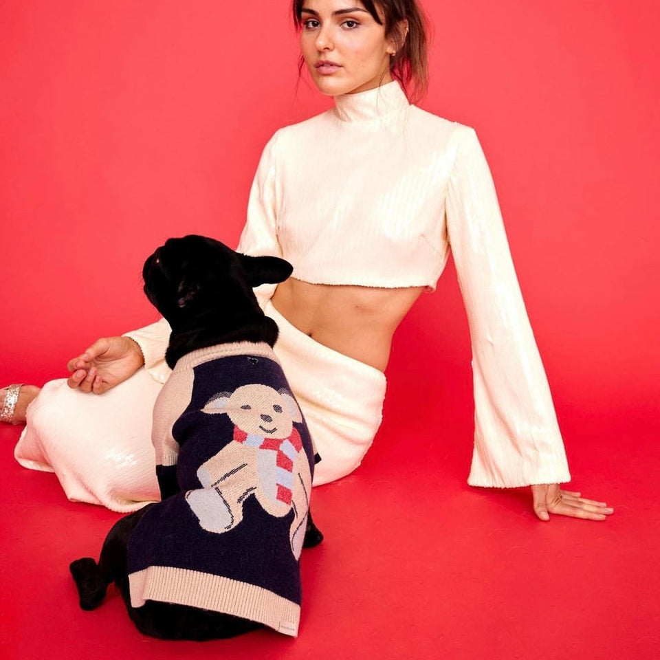 クリスマスのマスコットであるテディベアが編み込まれているのが特徴のニットは高品質のイミテーションウール・アクリル・ナイロン混紡糸で作られており、モックネックとラグランのプチ袖が暖かさと快適性を提供してくれます!