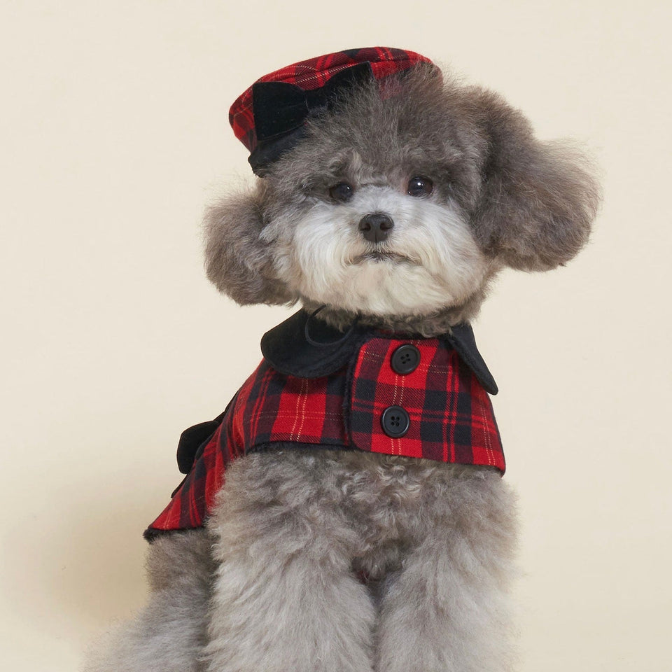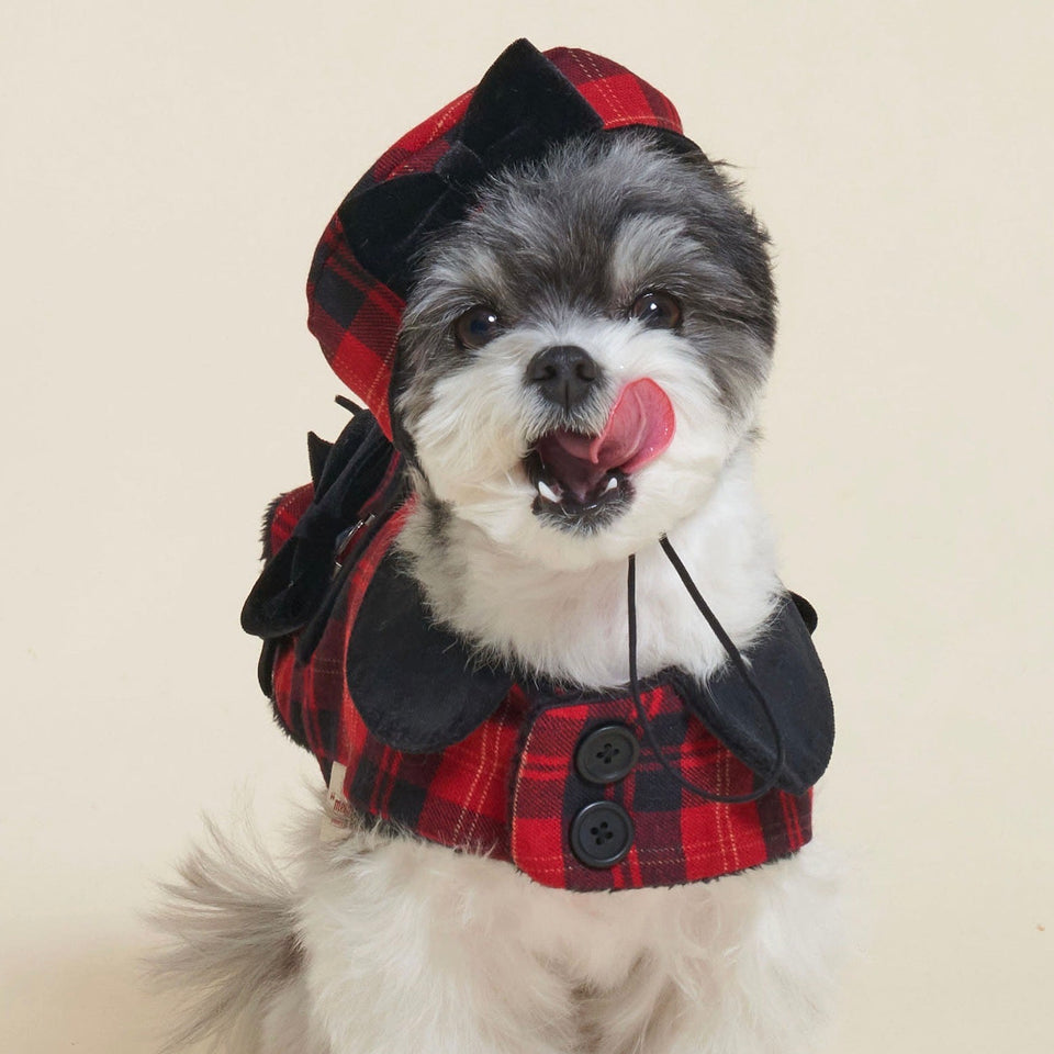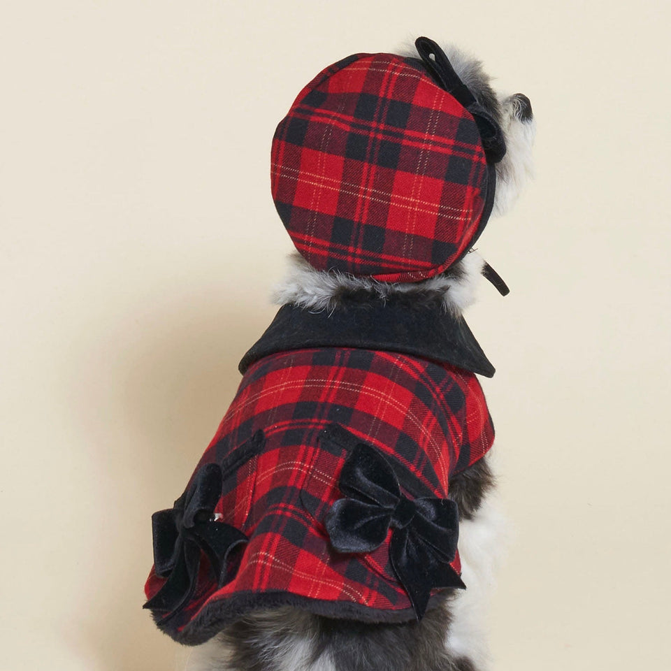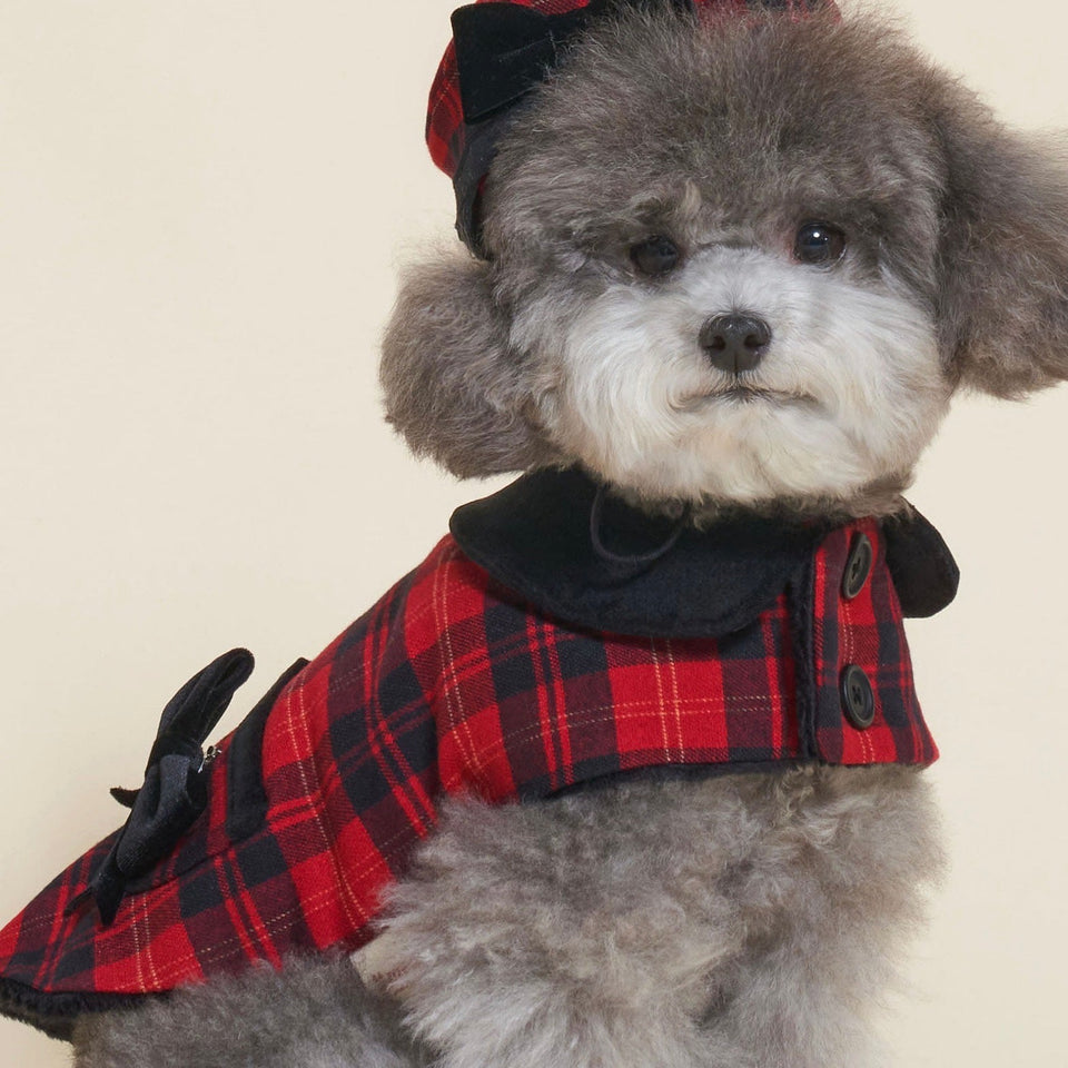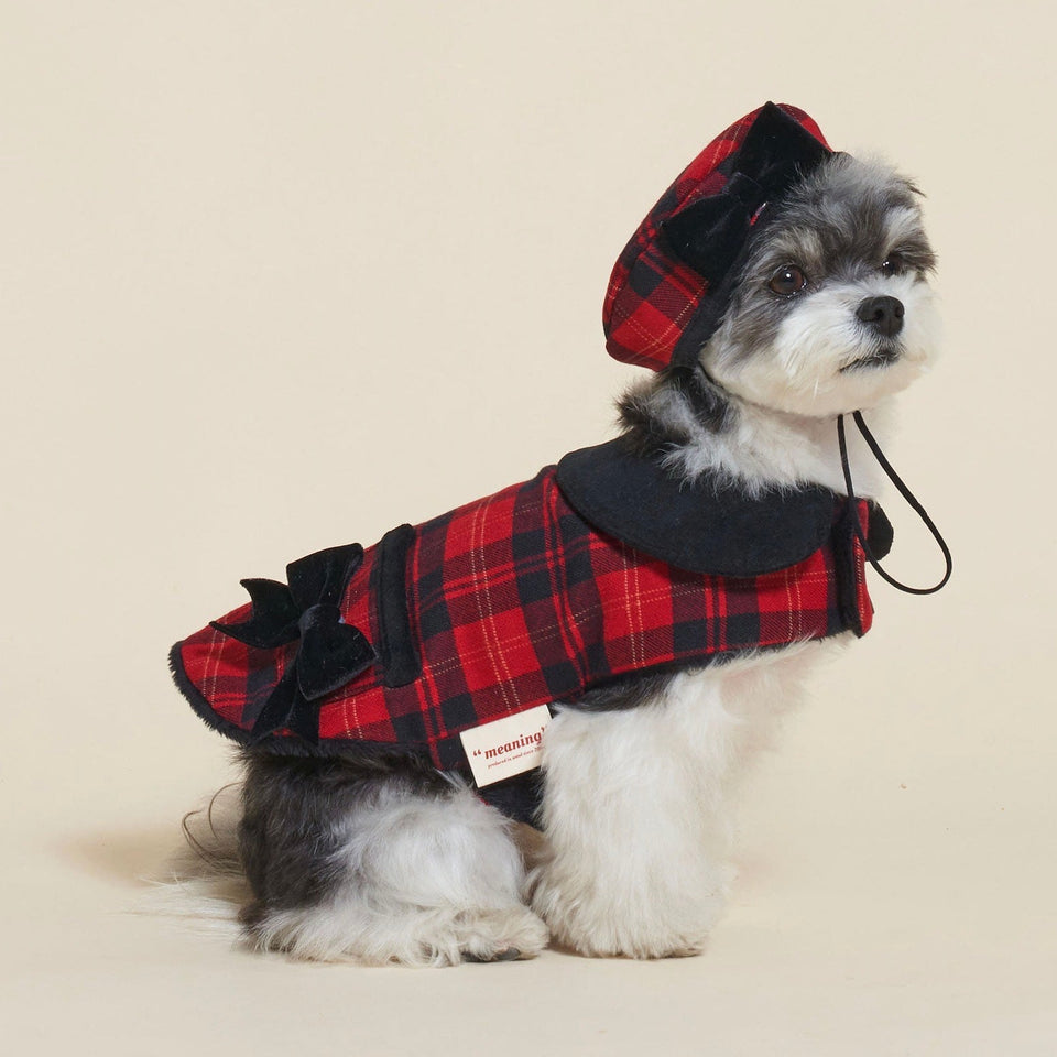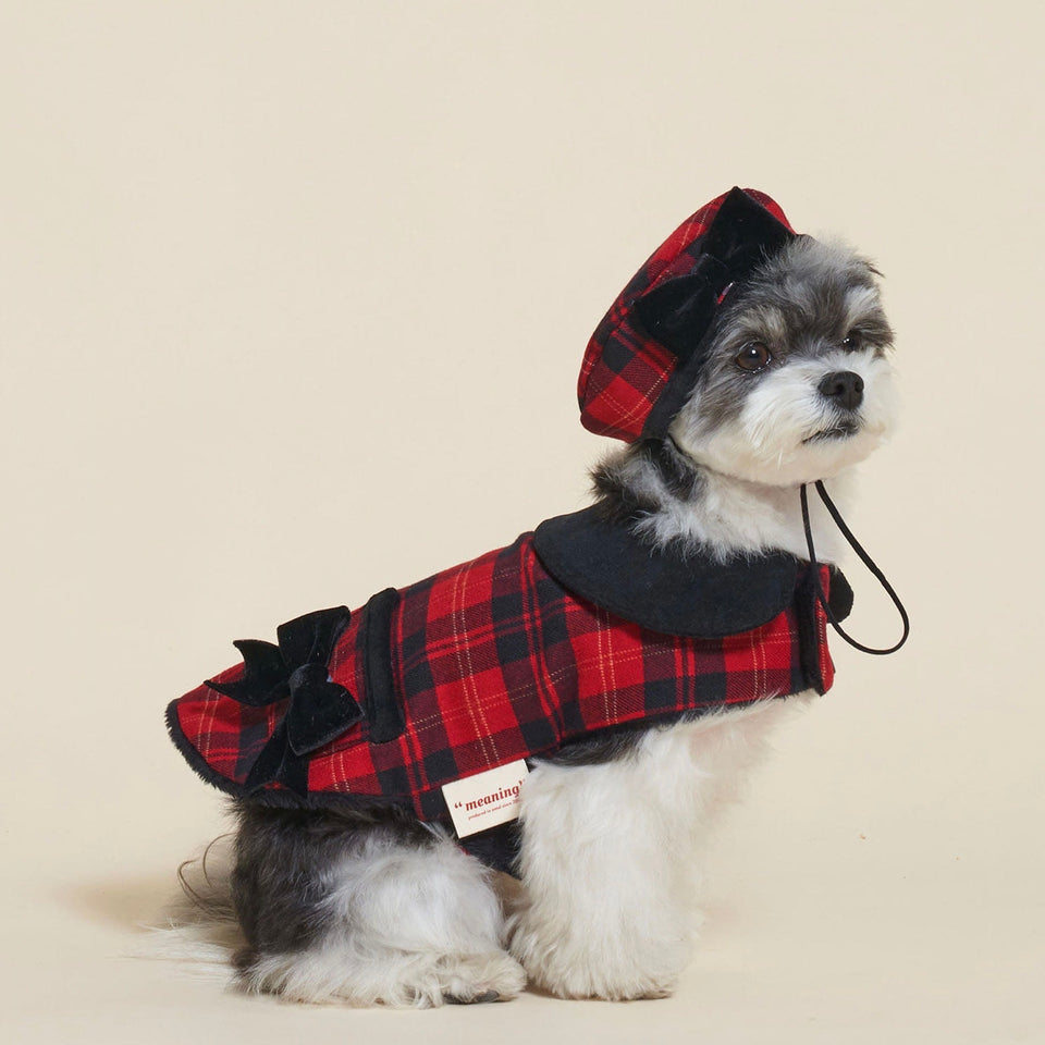 大胆なレッドのタータンチェックに首元のラウンドカラーと裾部分のポケットについた取り外し可能なベロアリボンがポイント♡