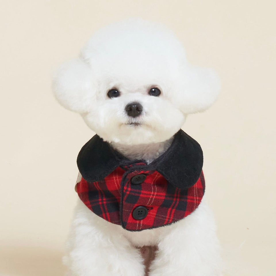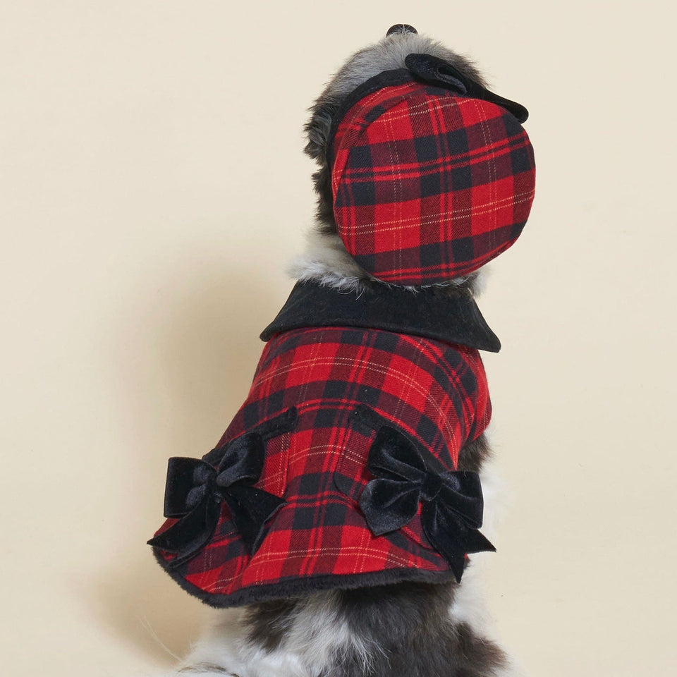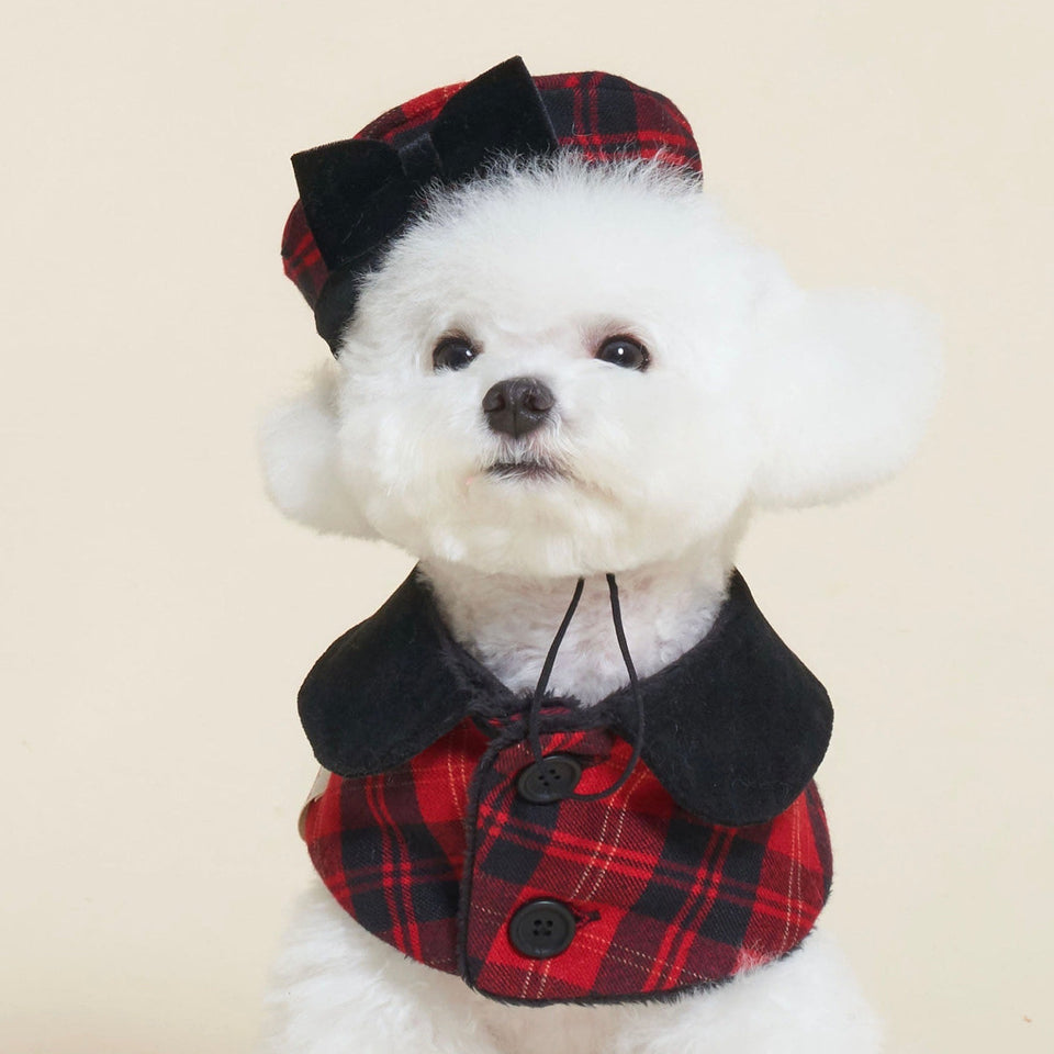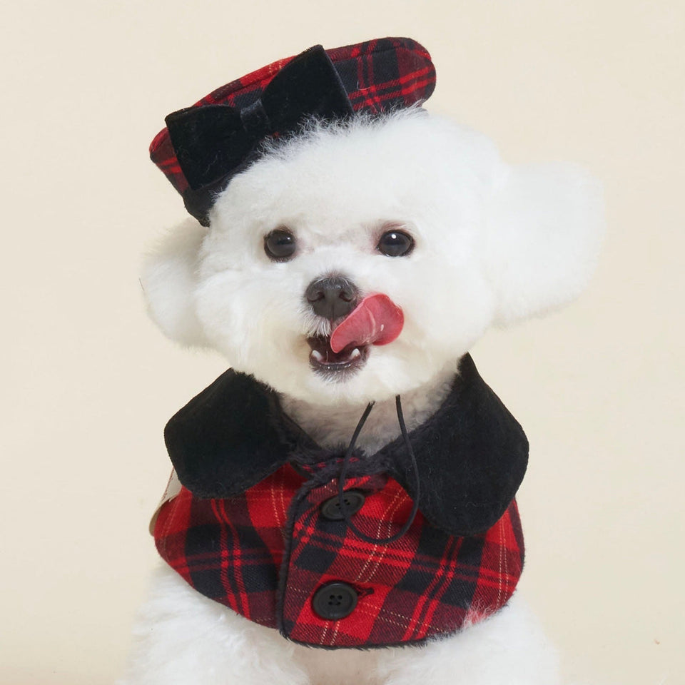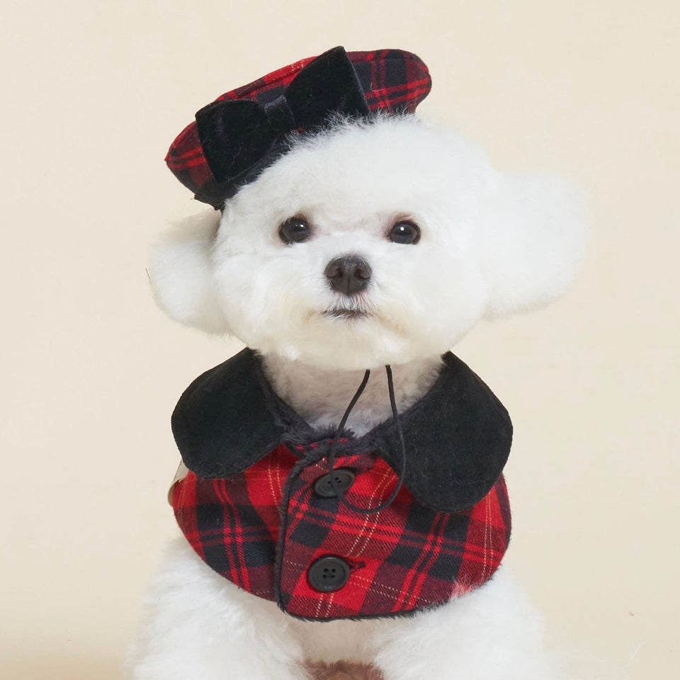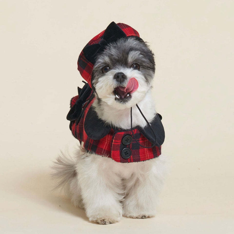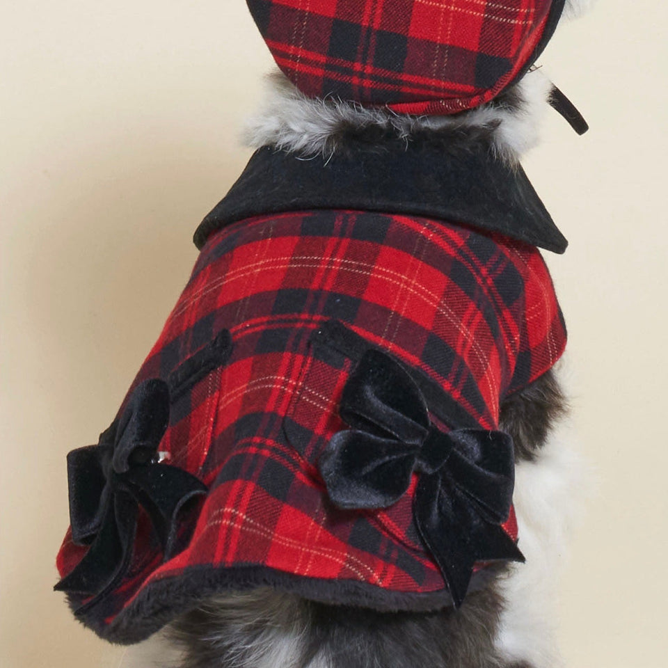 大胆なレッドのタータンチェックに首元のラウンドカラーと裾部分のポケットについた取り外し可能なベロアリボンがポイント♡