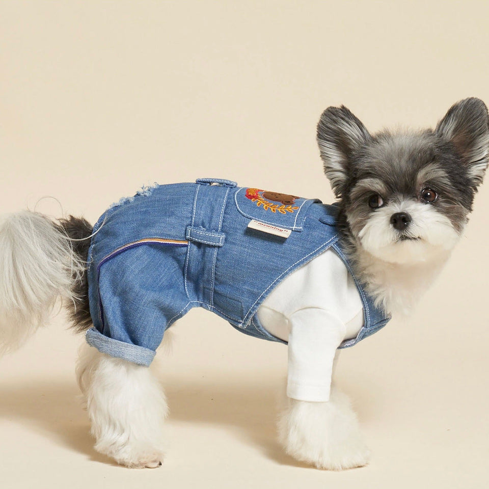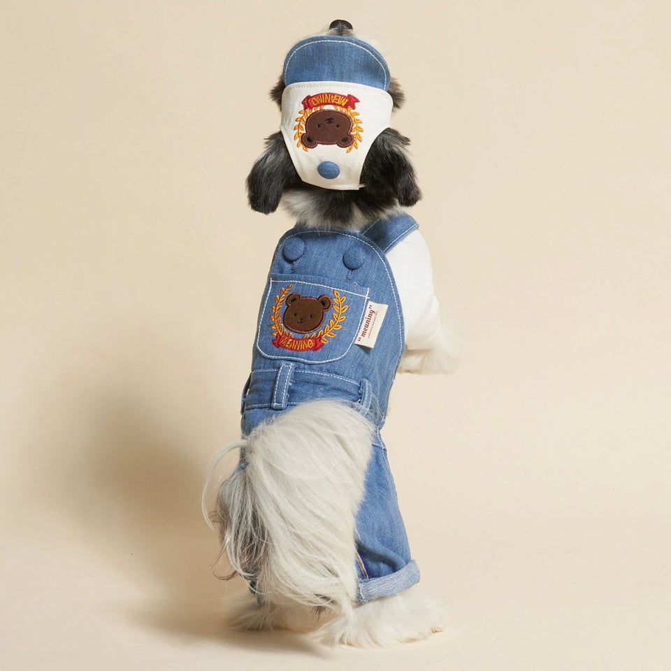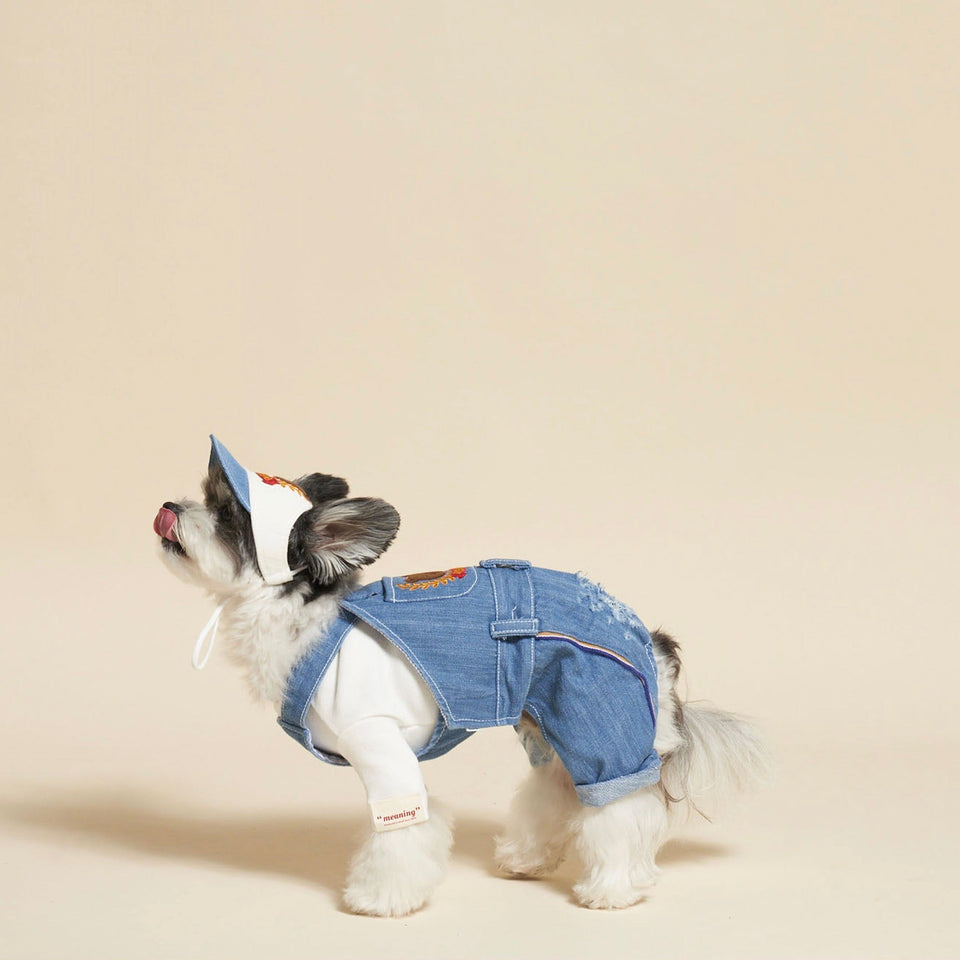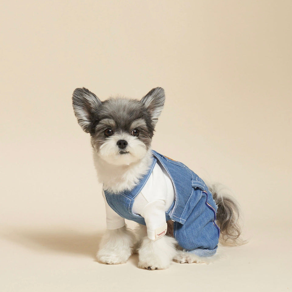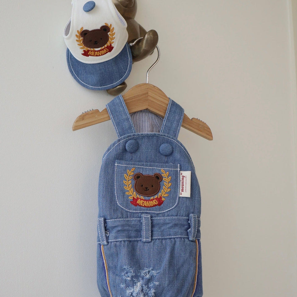 カジュアルなデニムのオーバーオールは背中のGOSOMIの刺繍とデニムの包みボタンでポイントを与えています!