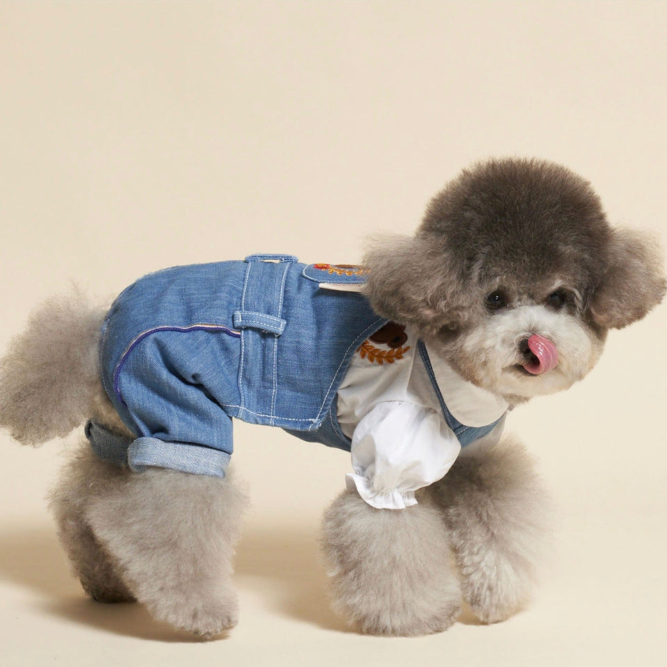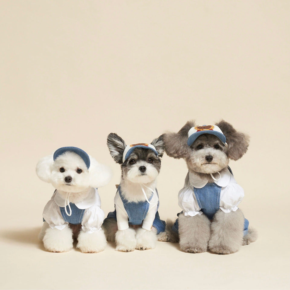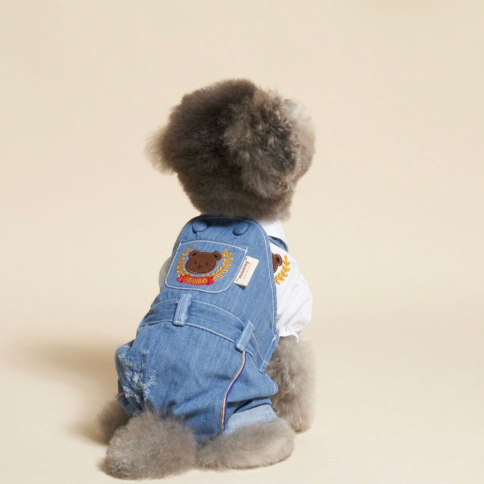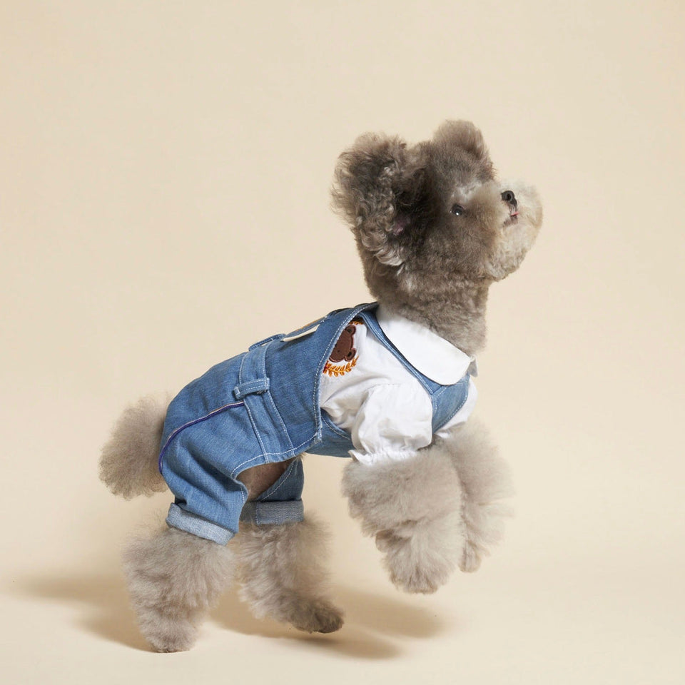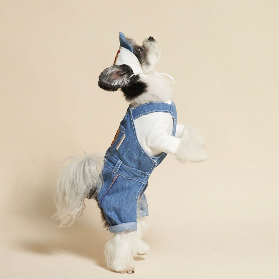 カジュアルなデニムのオーバーオールは背中のGOSOMIの刺繍とデニムの包みボタンでポイントを与えています!