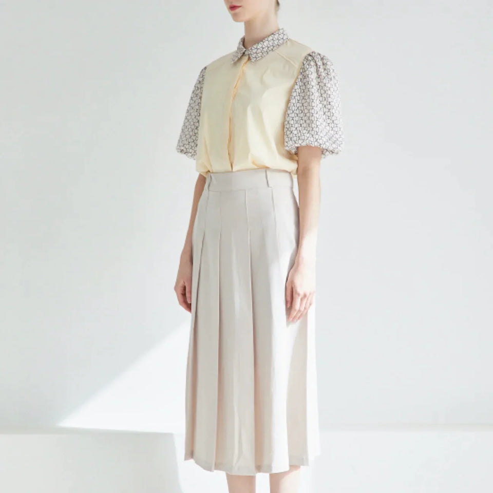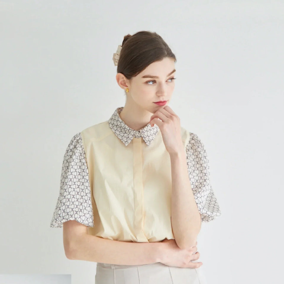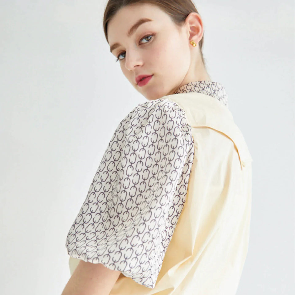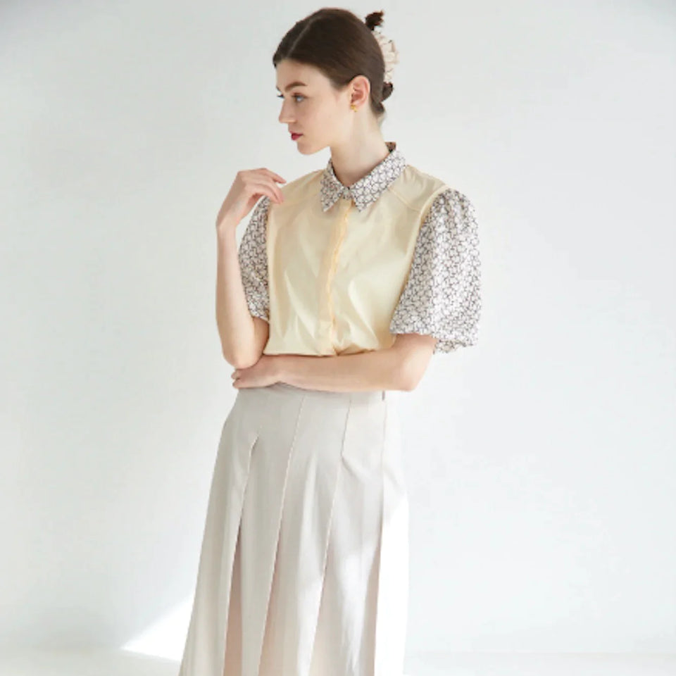 カラーとスリーブ部分のパターンがポイントで、優雅でラブリーなバルーンシルエットのスリーブがとっても可愛いブラウスです。