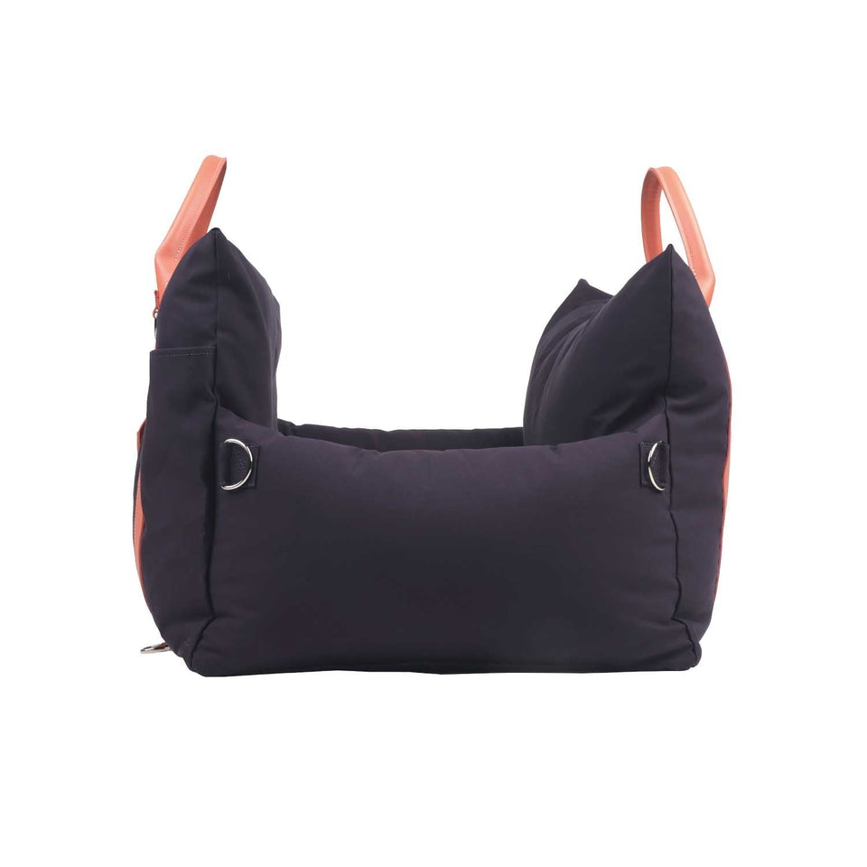 ベッドの背面には、座席に固定できるように紐が付いているのでシートベルトに通して車の助手席に簡単に装着が可能!