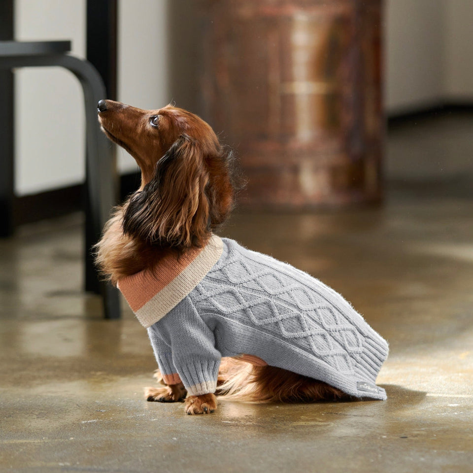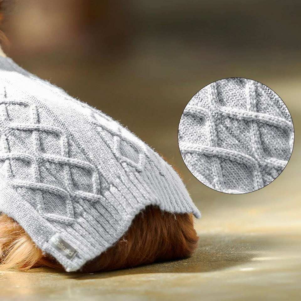 ③シンプルなケーブル編みのカラーネックデザインでクラシックな高級感を演出します!