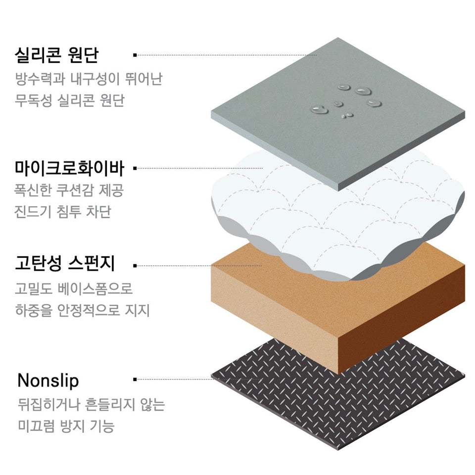 Water-Block Silicon Bedは表面の上面(シリコン)と底面(ノンスリップ)の間にマイクロファイバーと高弾性スポンジの2重レイヤーになっています。