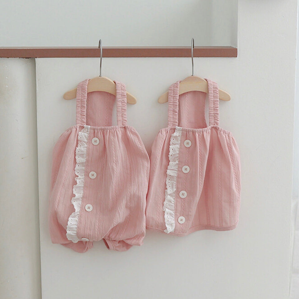 『レースとボタン使いが高級感たっぷりのべべロンパース
