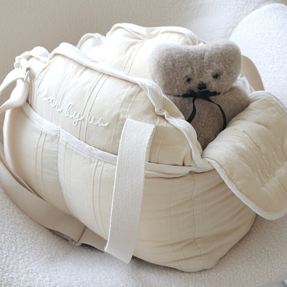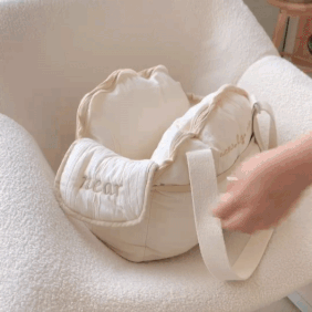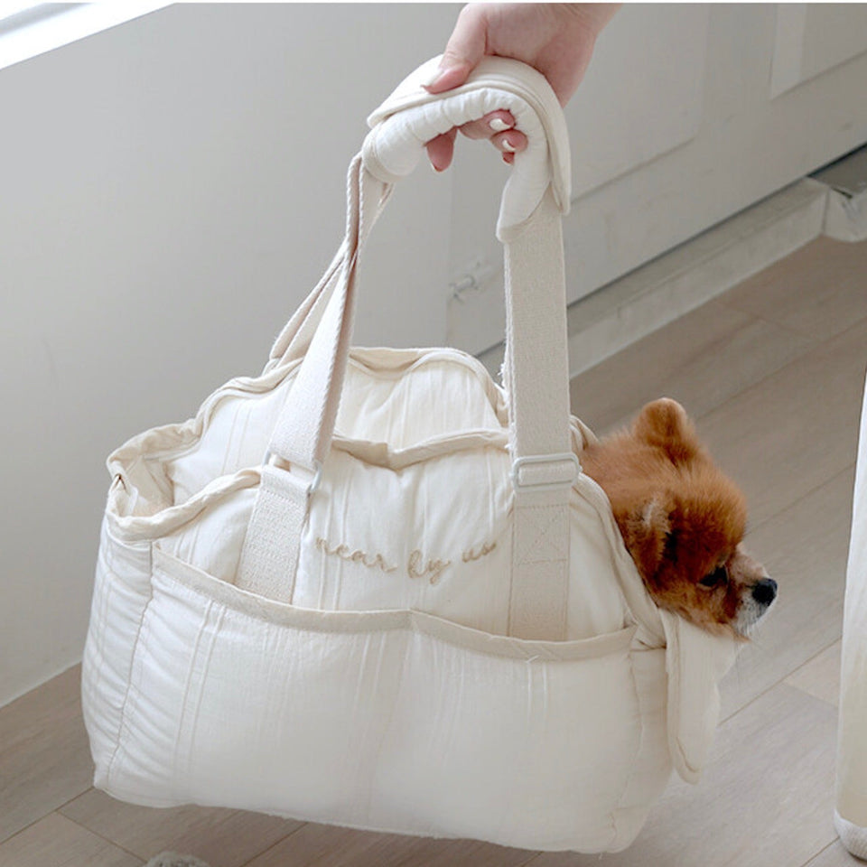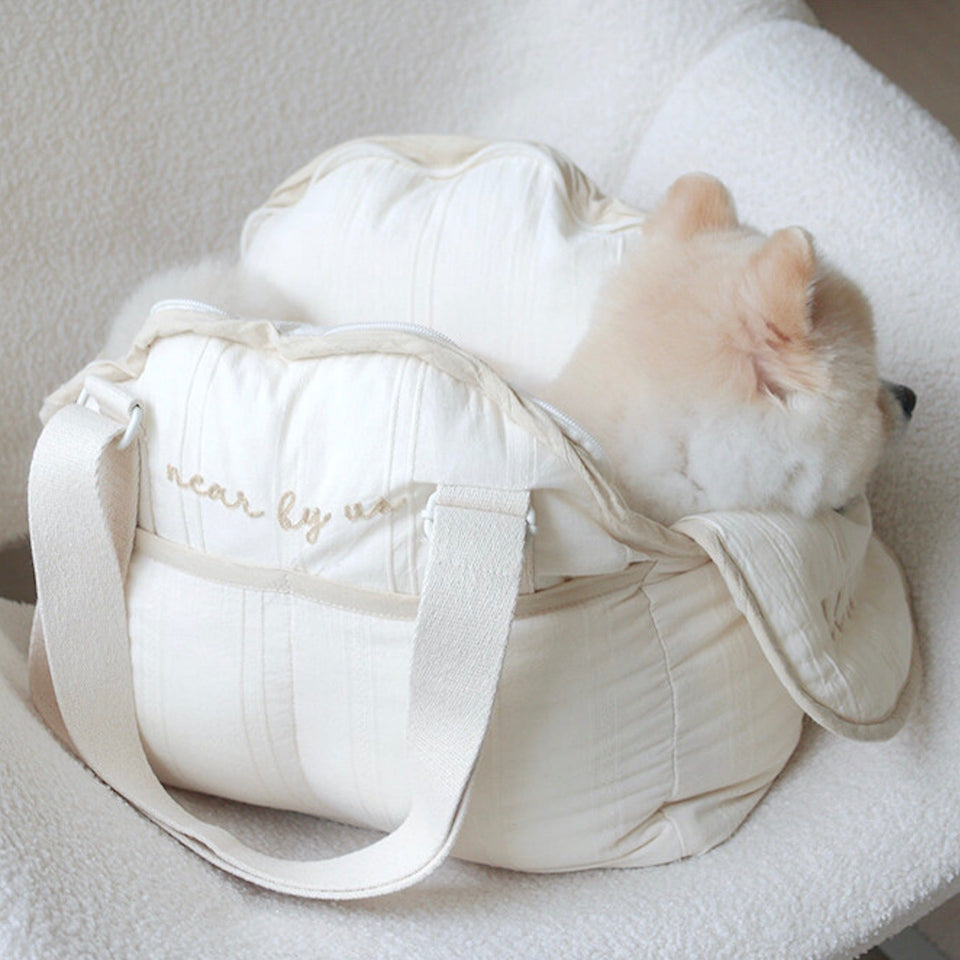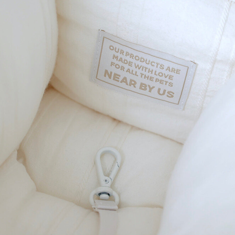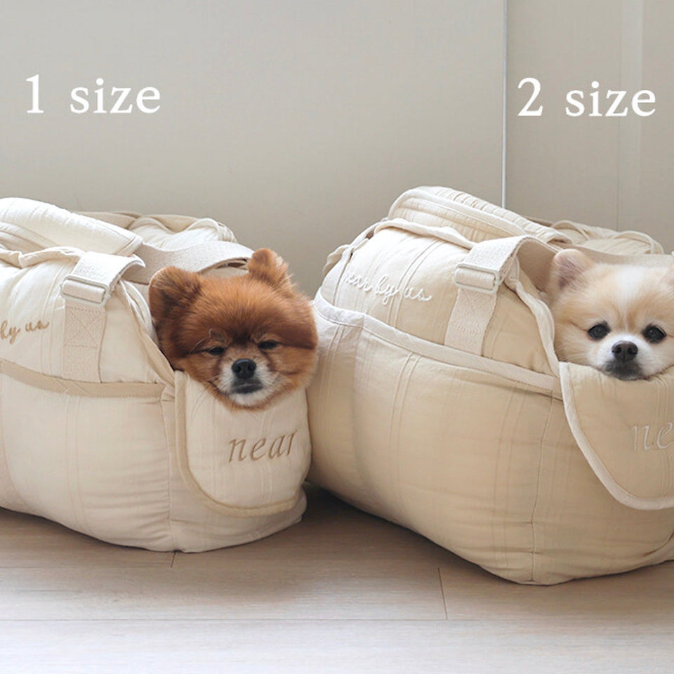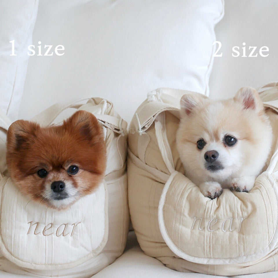 near by us初のキャリーバッグはnear byらしさたっぷりのデザインでクッション型バッグとして作っており、愛犬がどこでも快適に過ごせることを願って作られました!