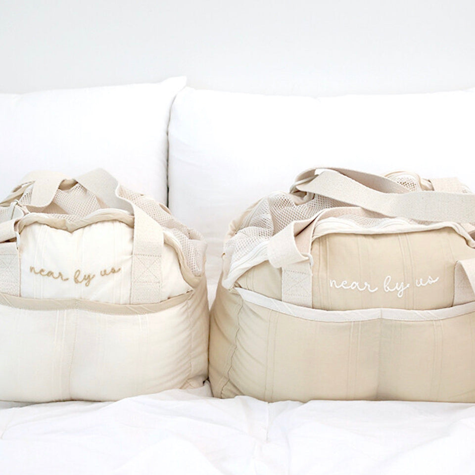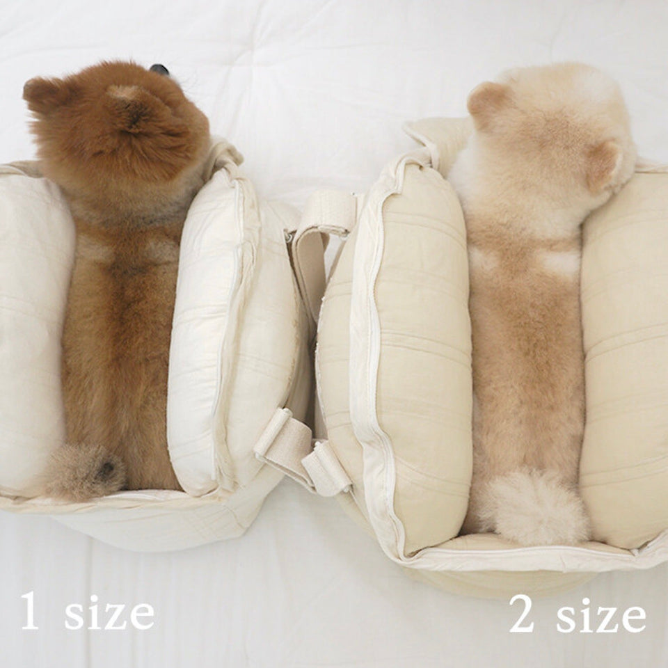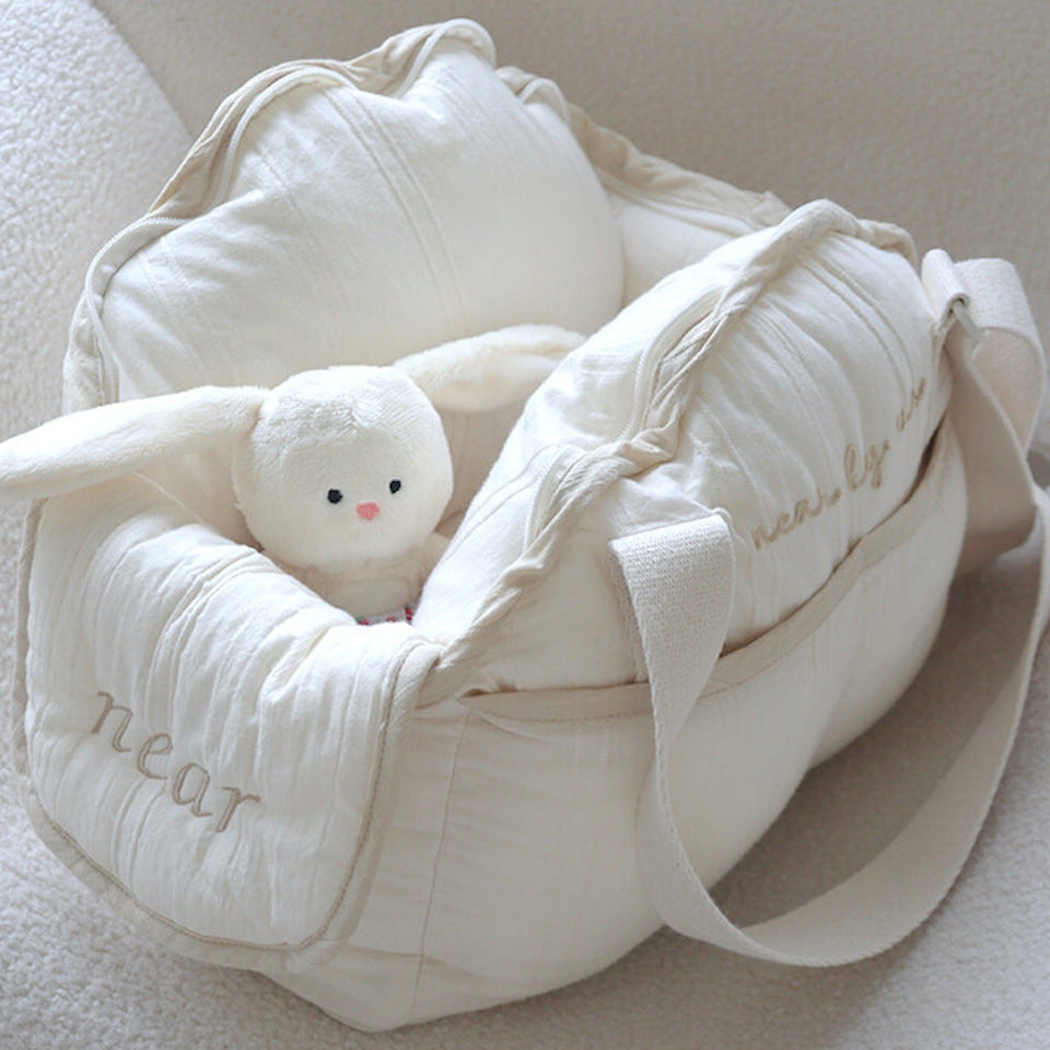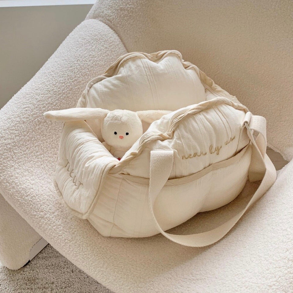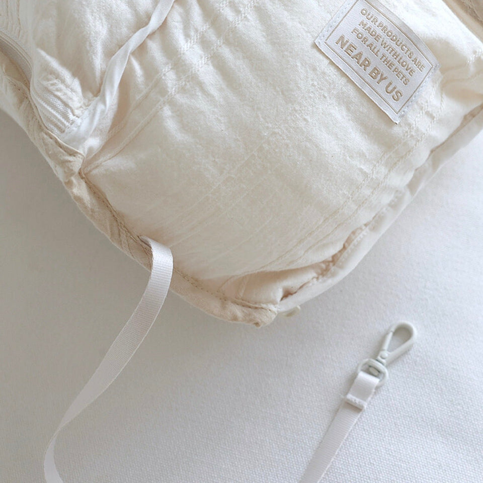 near by us初のキャリーバッグはnear byらしさたっぷりのデザインでクッション型バッグとして作っており、愛犬がどこでも快適に過ごせることを願って作られました!