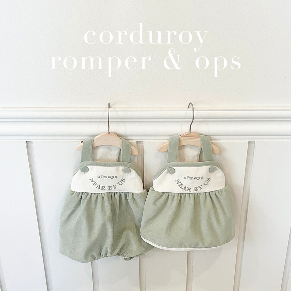near by us の人気デザインのワンピースは優しい色味のコーデュロイ素材にに背中の刺繍が目を引く一枚!