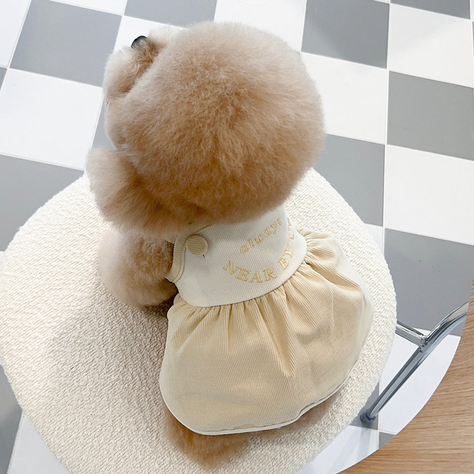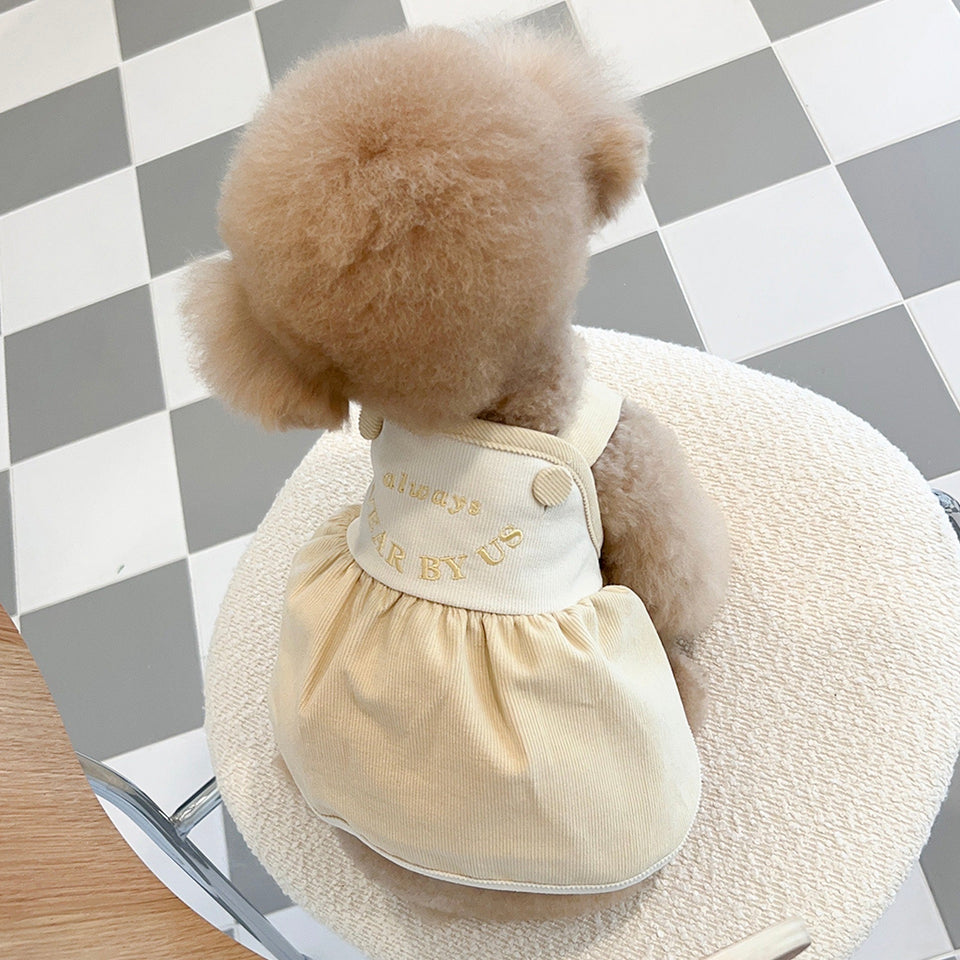 near by us の人気デザインのワンピースは優しい色味のコーデュロイ素材にに背中の刺繍が目を引く一枚!
