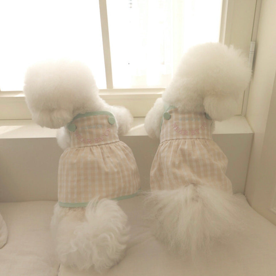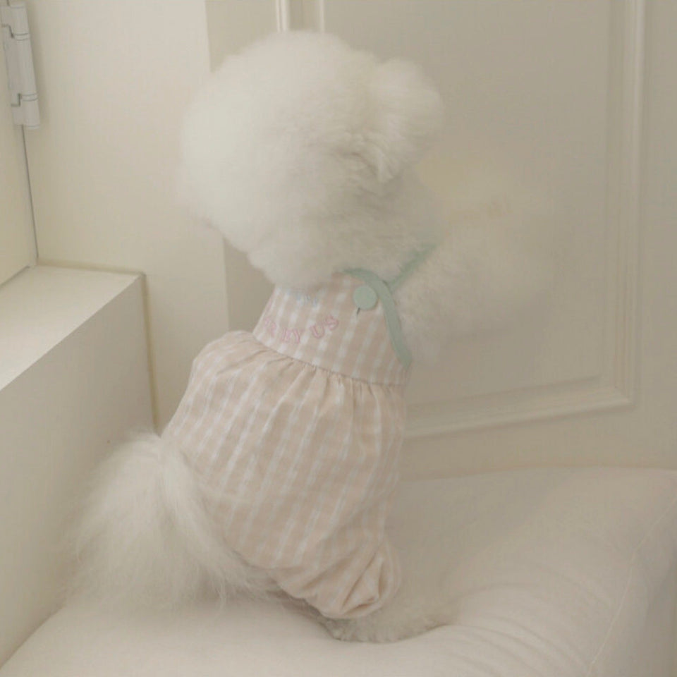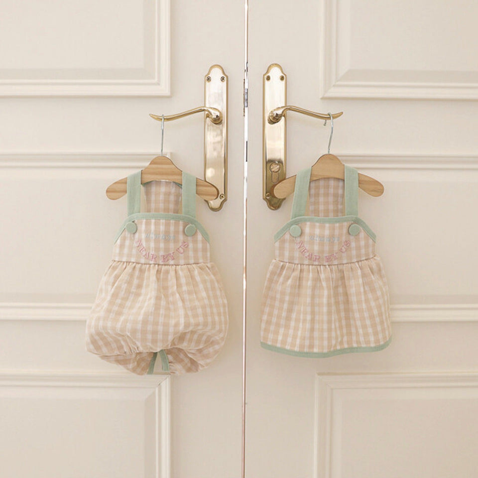 near by us の人気デザインのロンパースはチェック柄に背中の刺繍が目を引く一枚!