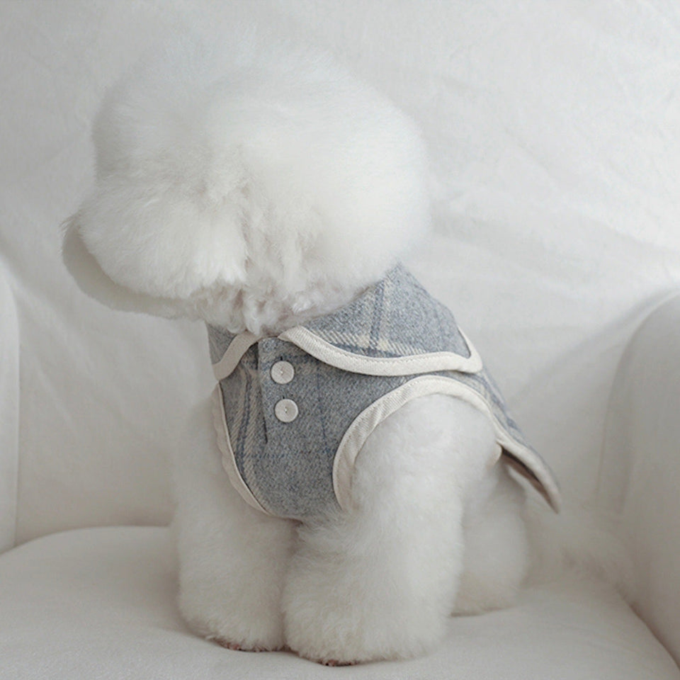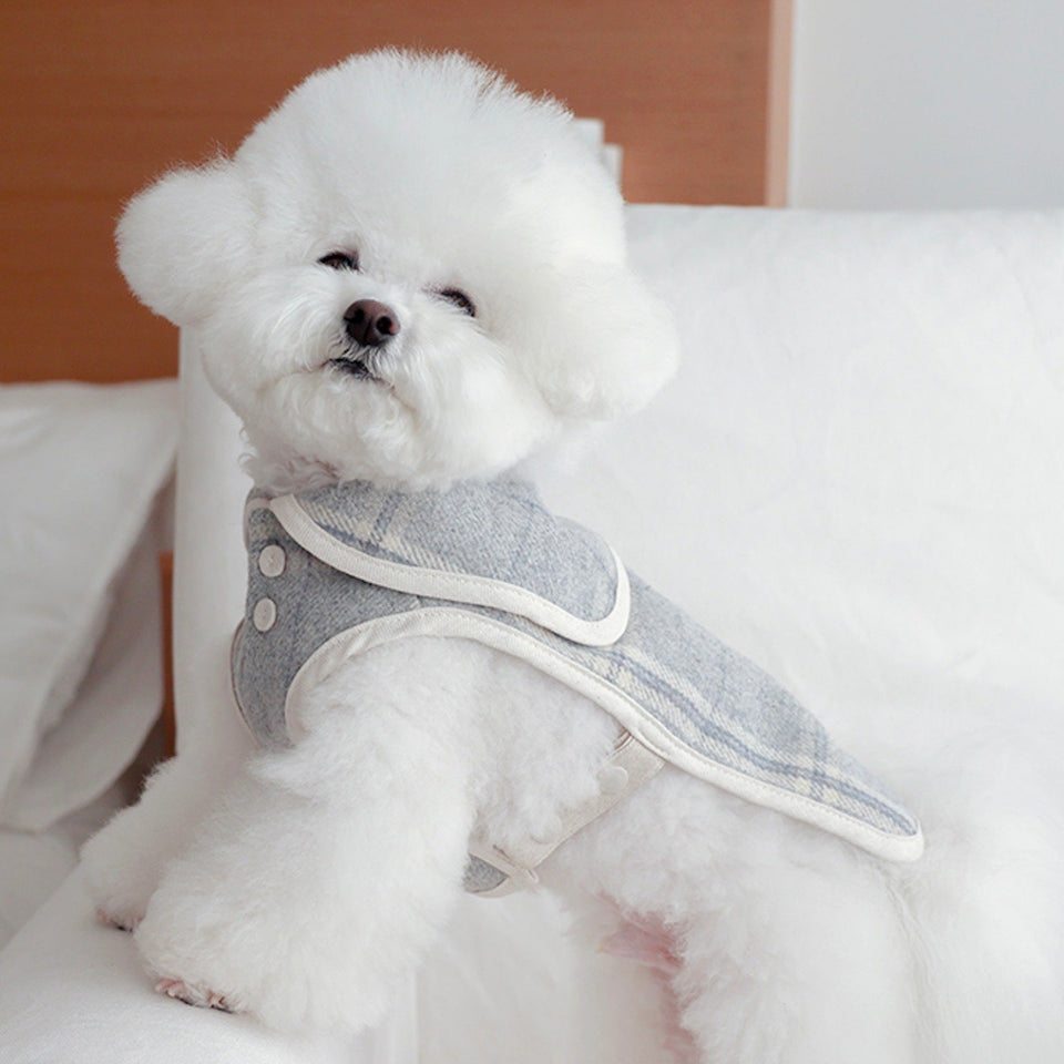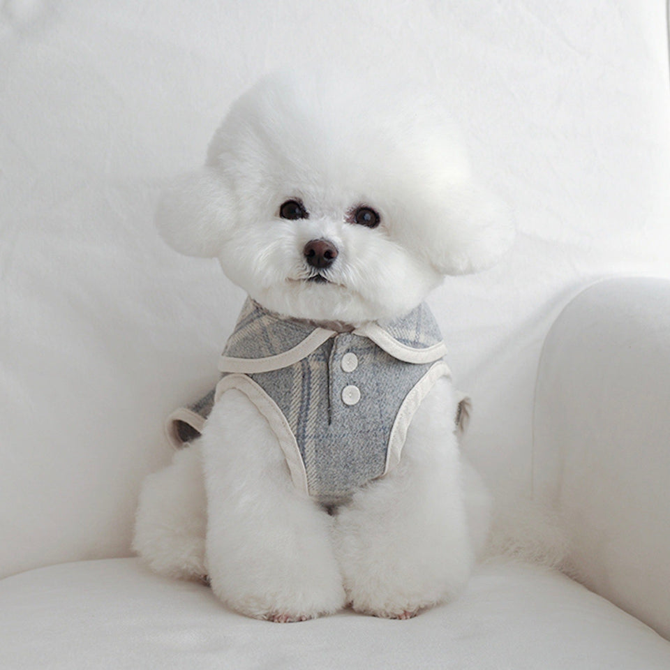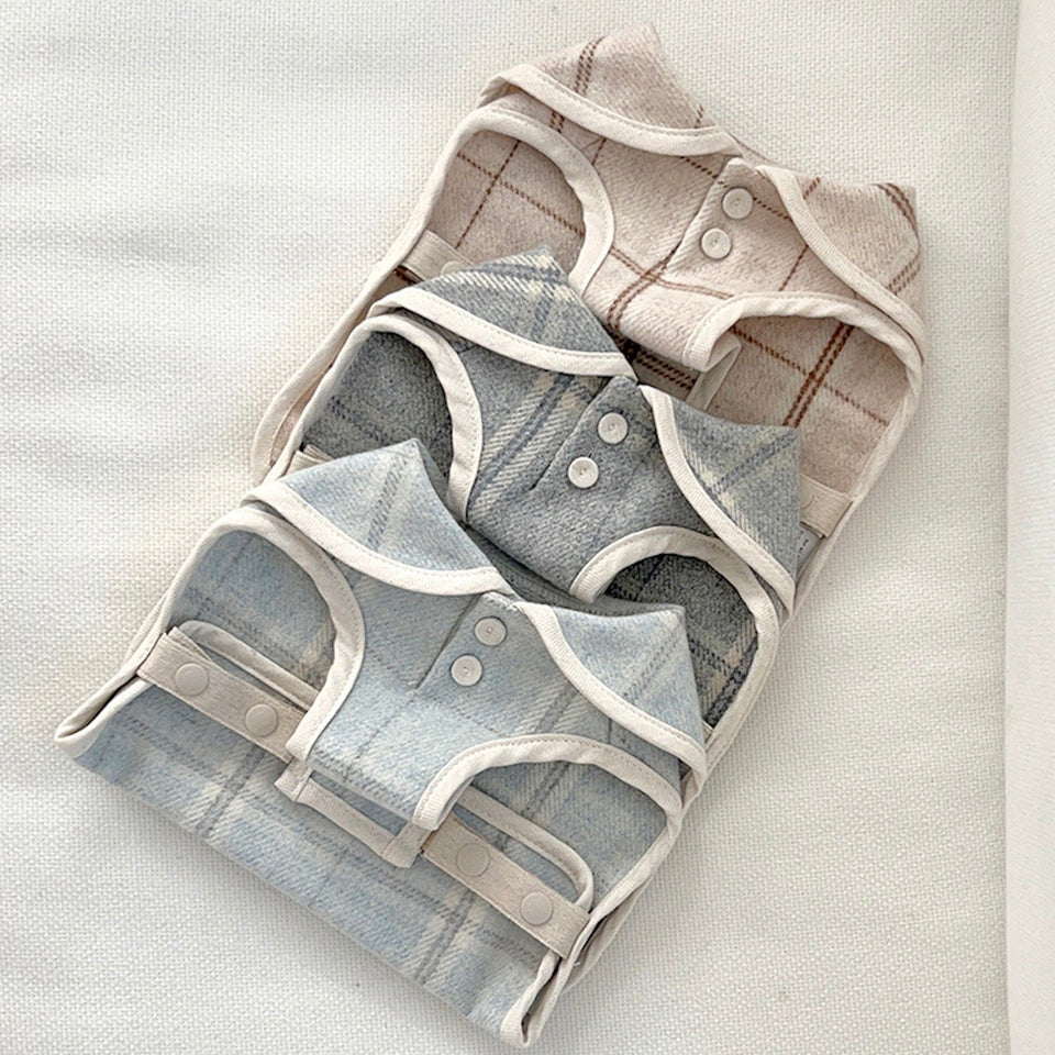 セーラーカラーの襟元にほのかな刺繍がチラリと見える可愛いデザインはボタンで首周りの長さを調整でき、襟の下にはハーネスからリードを通す穴がついており、お散歩などでもデザインをしっかりと見せながらお出かけができます!