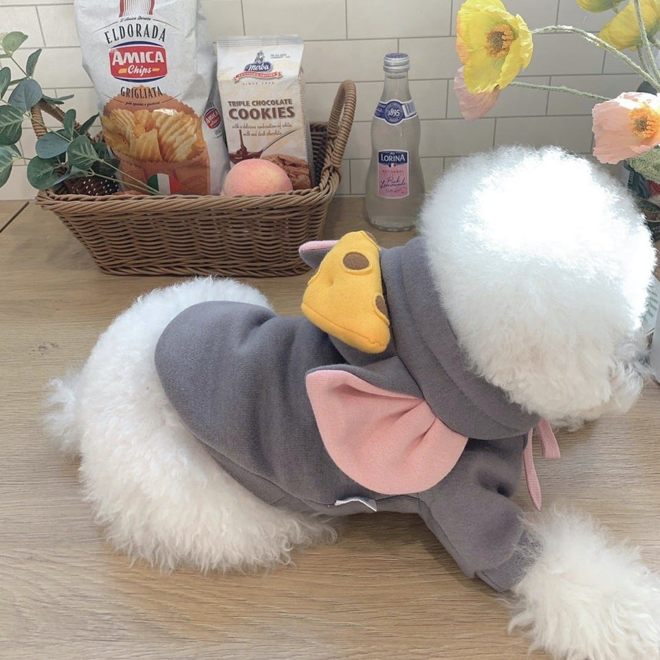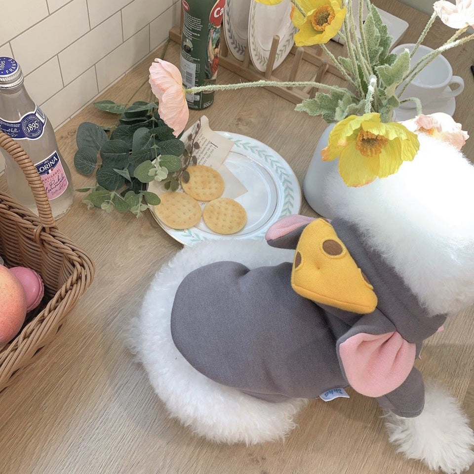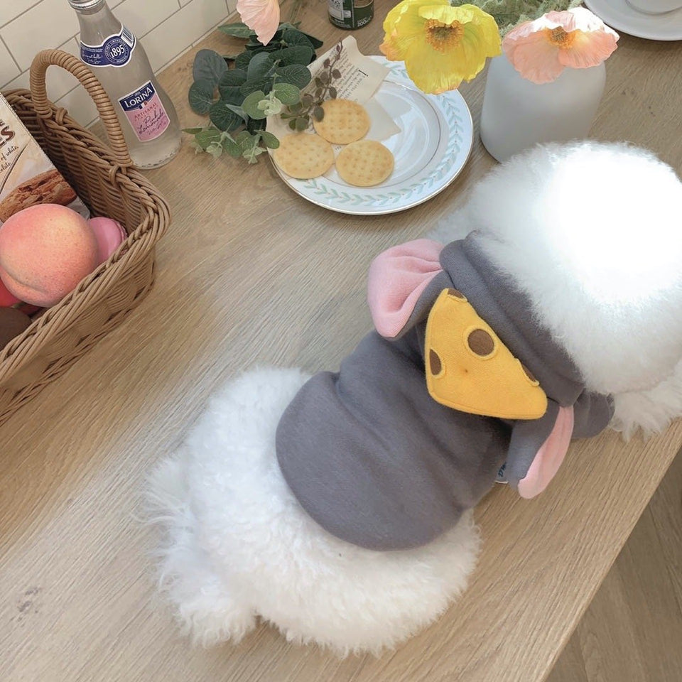 チーズが頭に乗ったネコのキャラクターパーカーはチーズと耳つきのフードもお腹の部分の色が切り替わっている部分も首元のリボンもデザインの細部までがとってもキュート♡