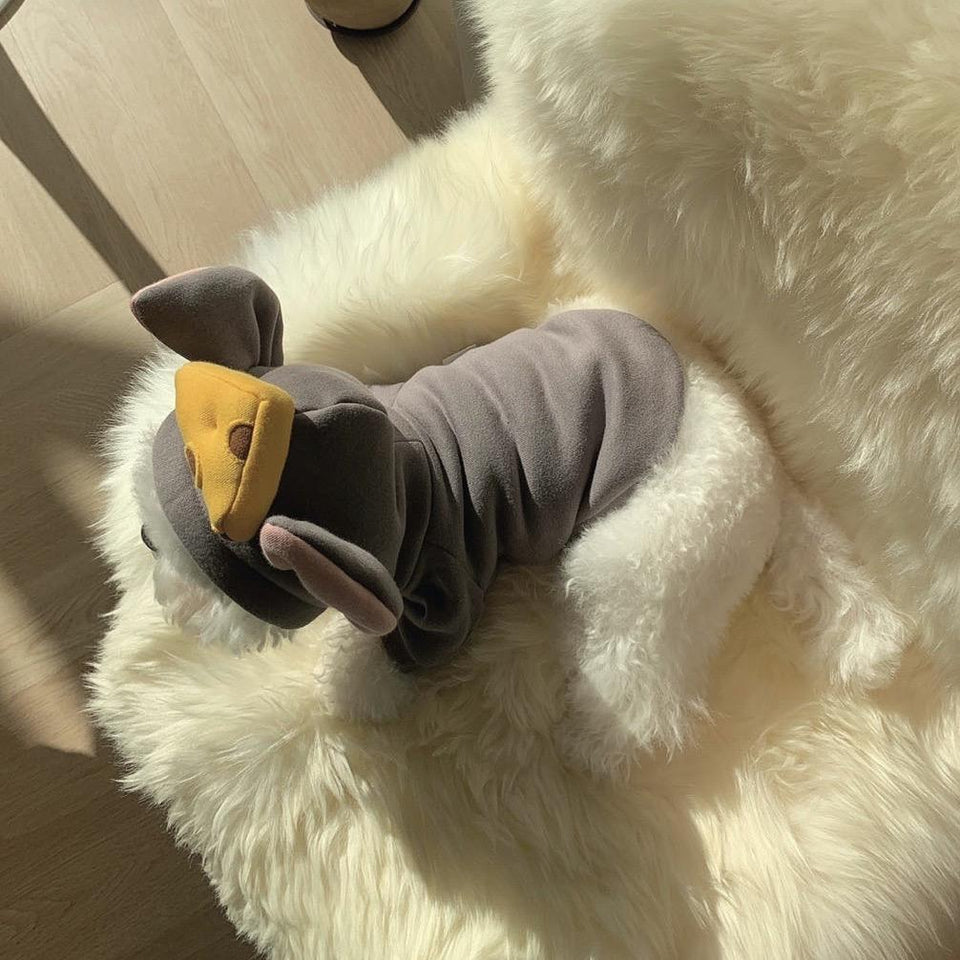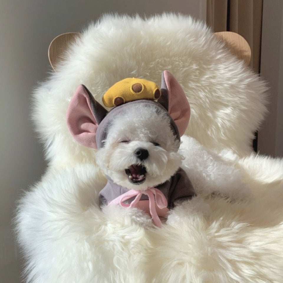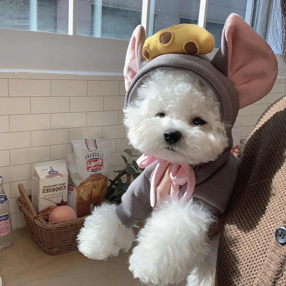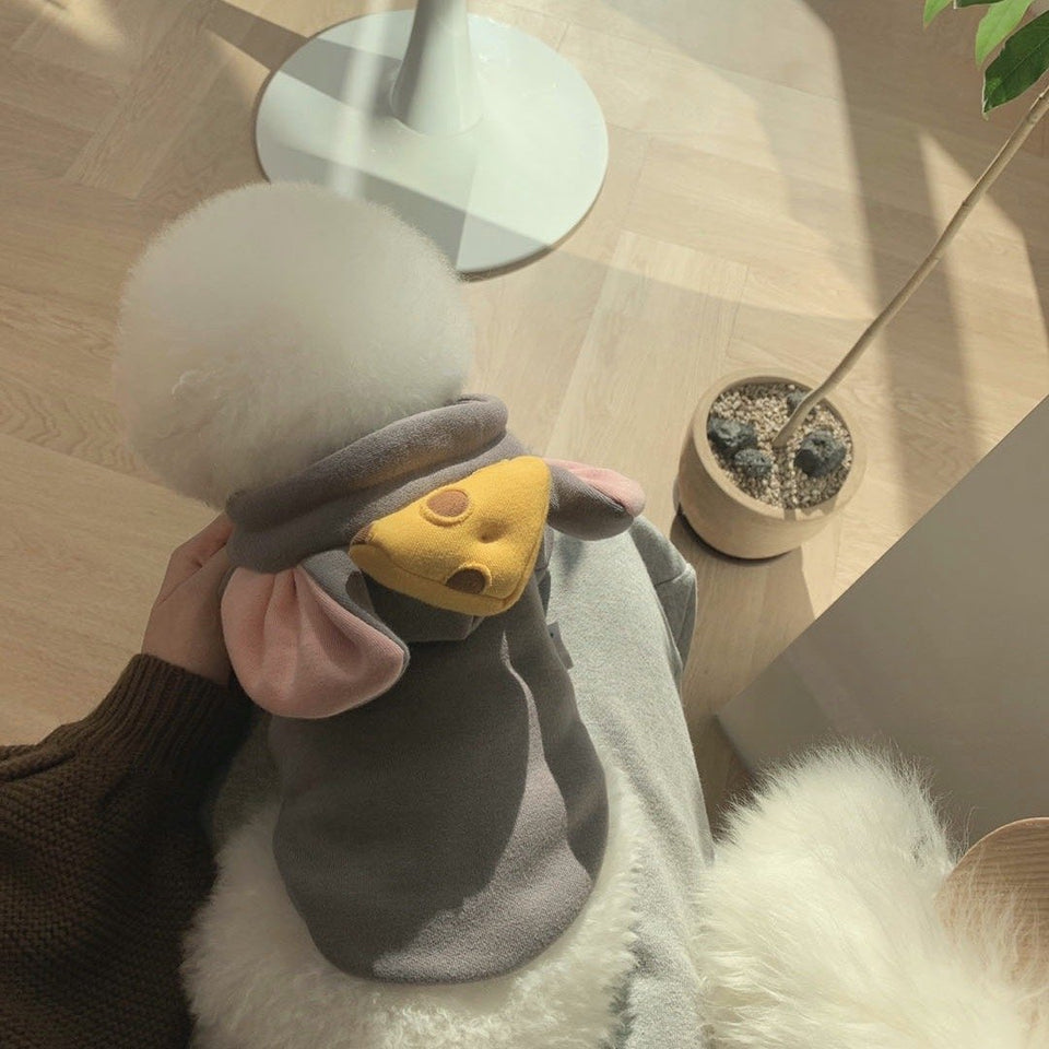 チーズが頭に乗ったネコのキャラクターパーカーはチーズと耳つきのフードもお腹の部分の色が切り替わっている部分も首元のリボンもデザインの細部までがとってもキュート♡