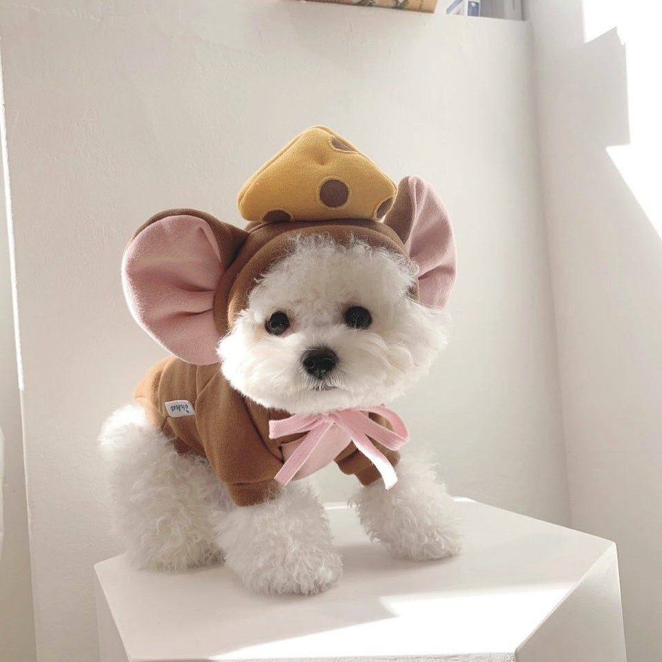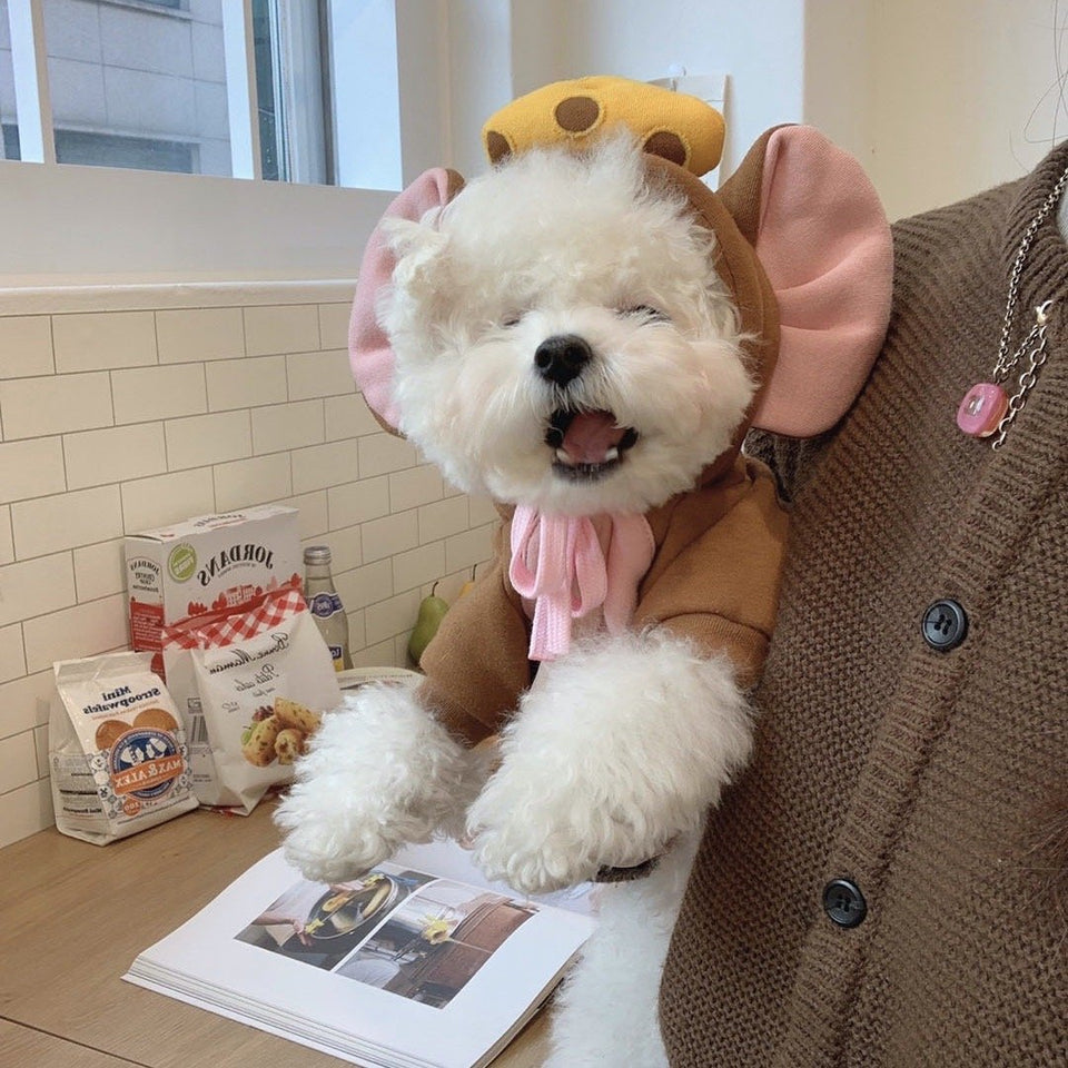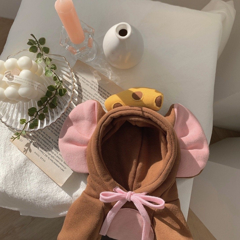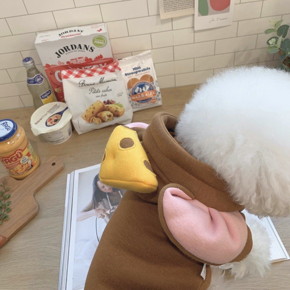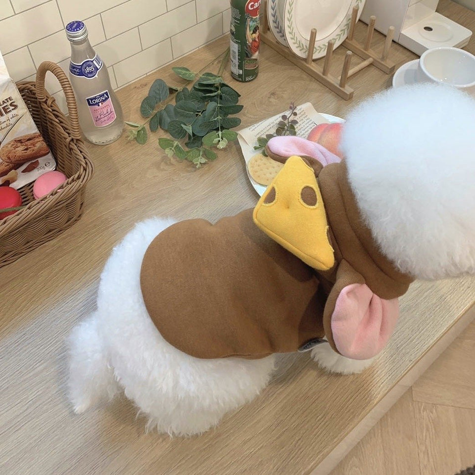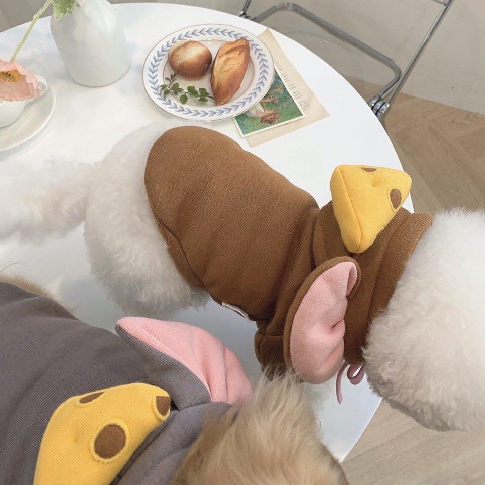 チーズが頭に乗ったネズミのキャラクターパーカーはチーズと耳つきのフードもお腹の部分の色が切り替わっている部分も首元のリボンもデザインの細部までがとってもキュート♡
