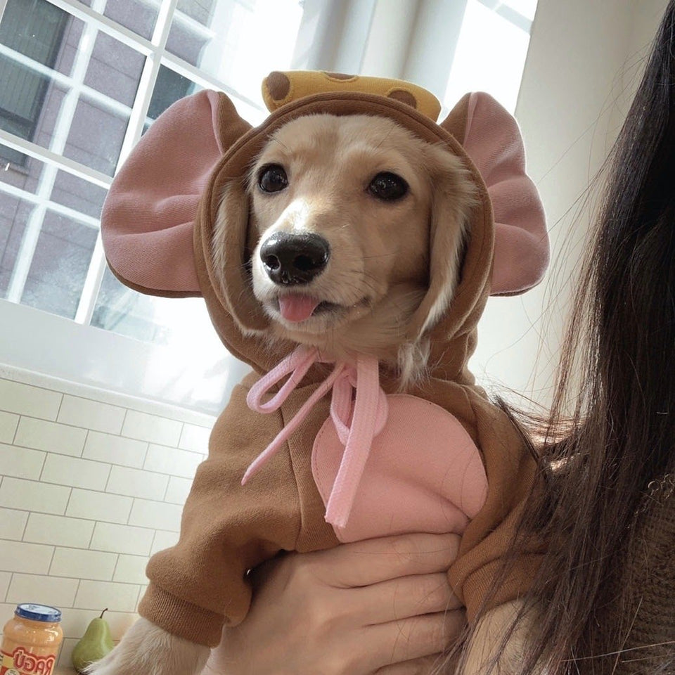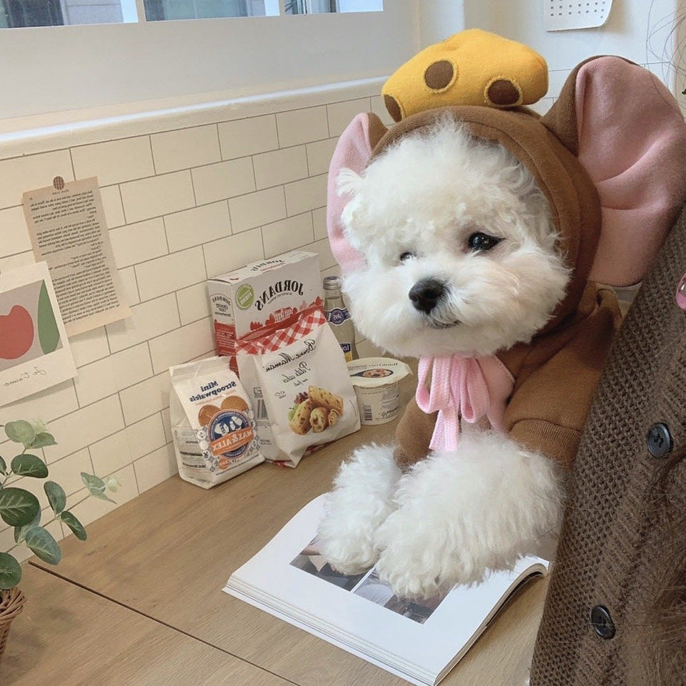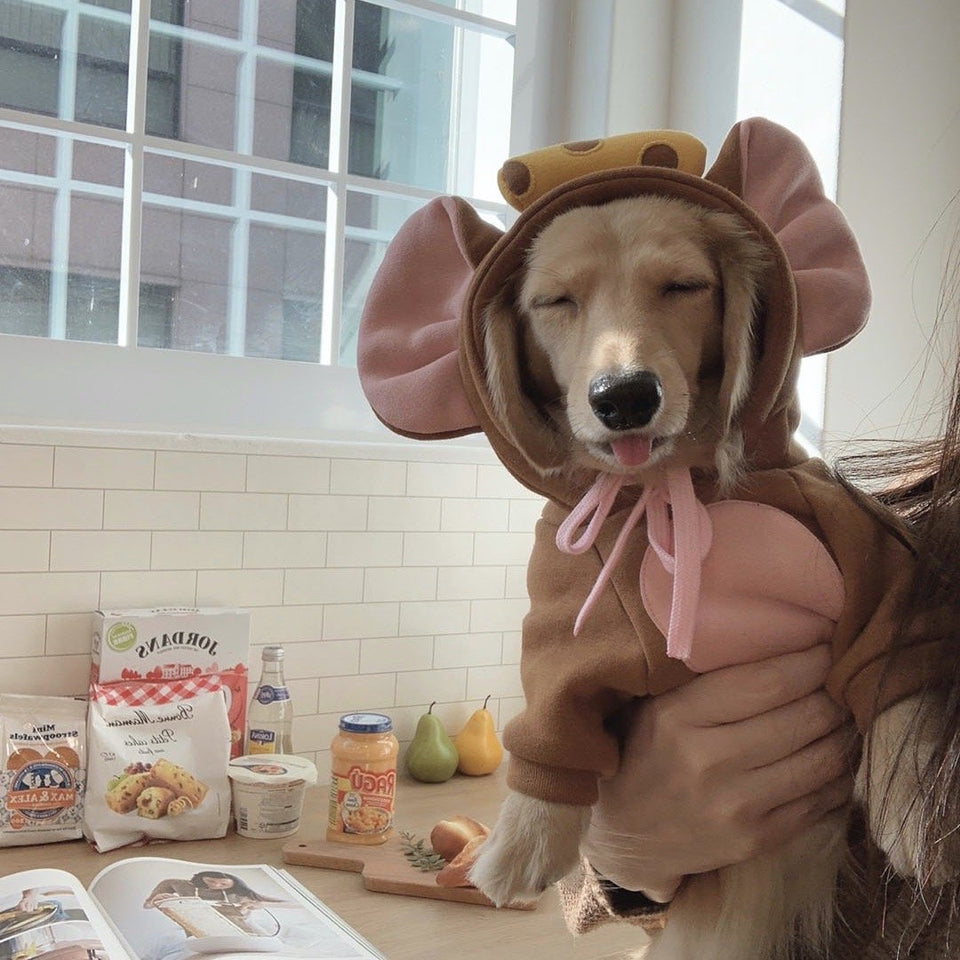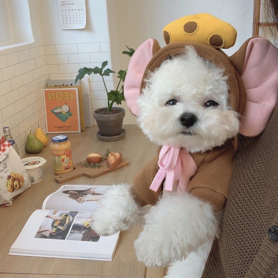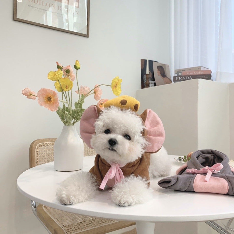 チーズが頭に乗ったネズミのキャラクターパーカーはチーズと耳つきのフードもお腹の部分の色が切り替わっている部分も首元のリボンもデザインの細部までがとってもキュート♡