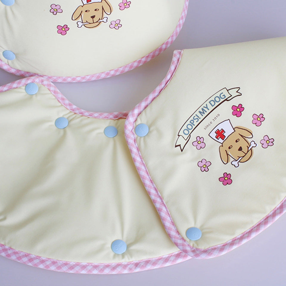 硬いプラスチックカラーでなく、肌に優しいピュアコットン素材に防水加工を施し、さらに両面で使用できるようにリバーシブルでの設計となっております!