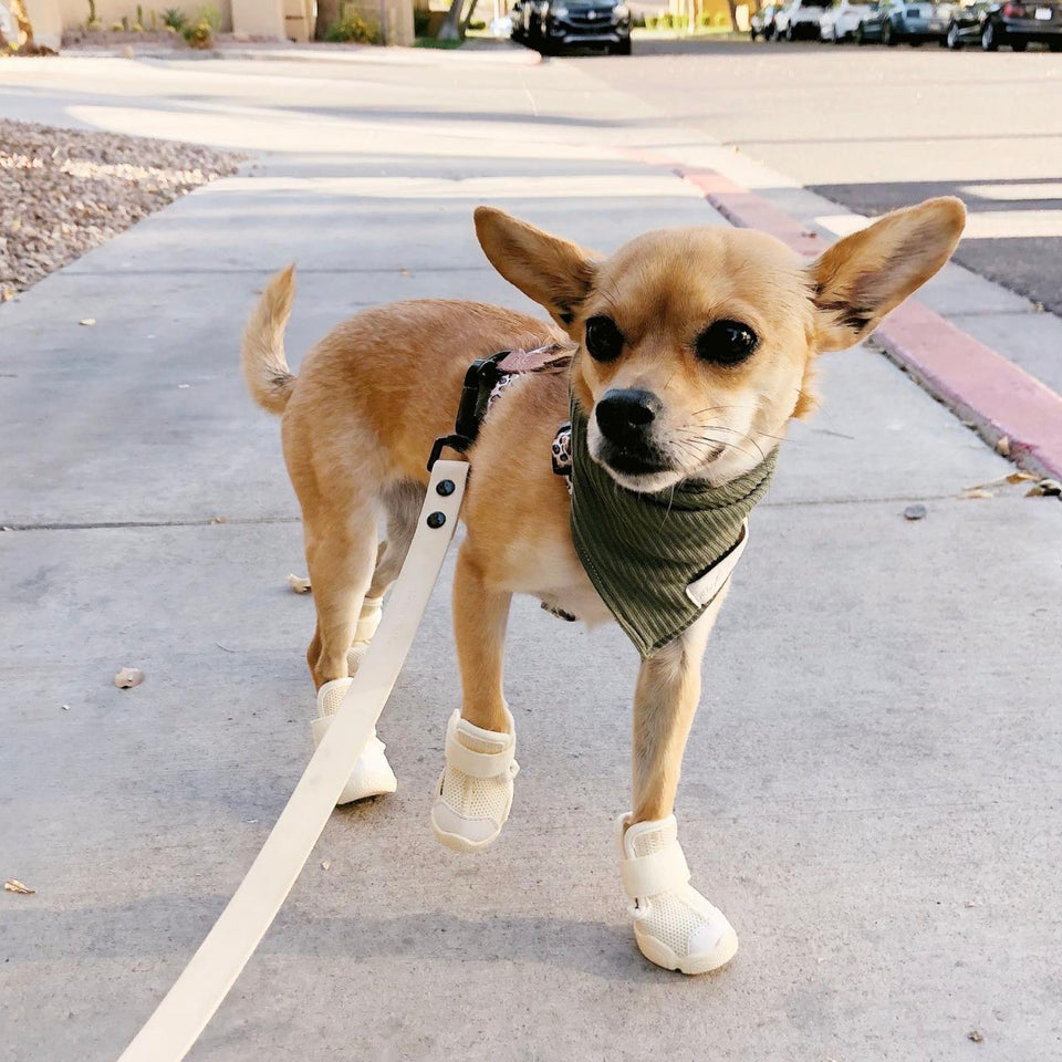 ・靴ははじめ履くのが苦手な子もいますが、苦手な子には練習と忍耐、そしてうまくいったら褒めるなどをすることで慣れていきます。最初の数日間は犬にフロントシューズのみを数分間履かせてから、徐々に4つすべての犬用シューズを履かせ、並行して毎日の犬用シューズの着用時間を増やします。
