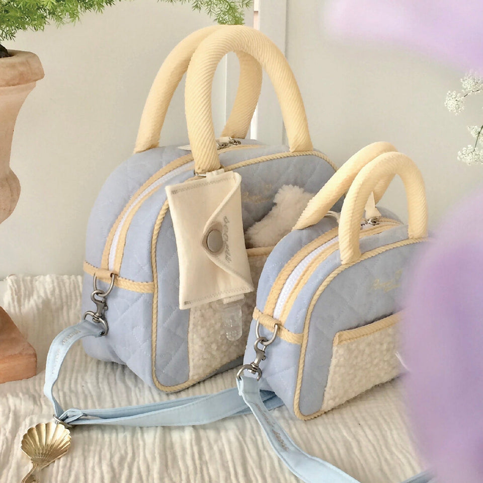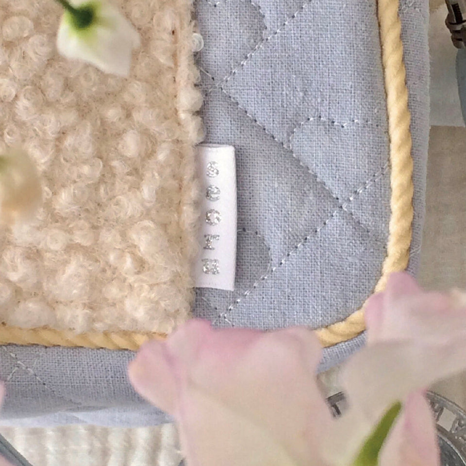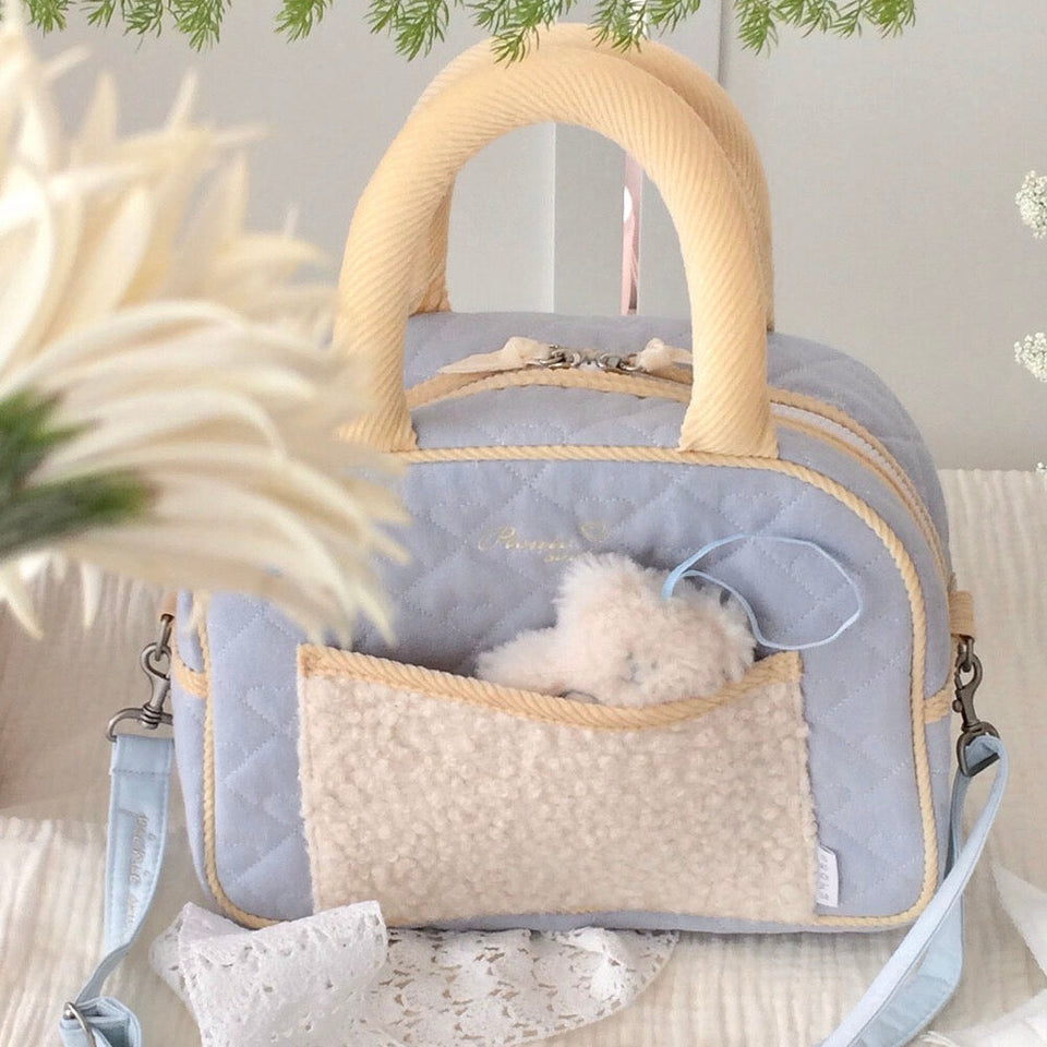 コットン100%のseoruらしいヴィンテージキルティング生地にポケットやハンドル、ストラップにチェックやストライプをあわせたseoruらしいデザインのお散歩バッグ!