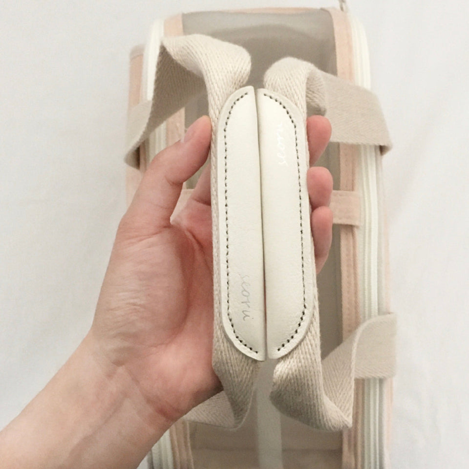 持ち手は柔らかいが手に馴染むよう考慮し、ハンドルストラップはウェビングの中でも最も高級な品質のものを使用しました。
