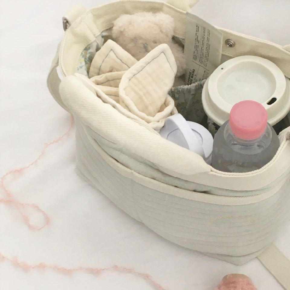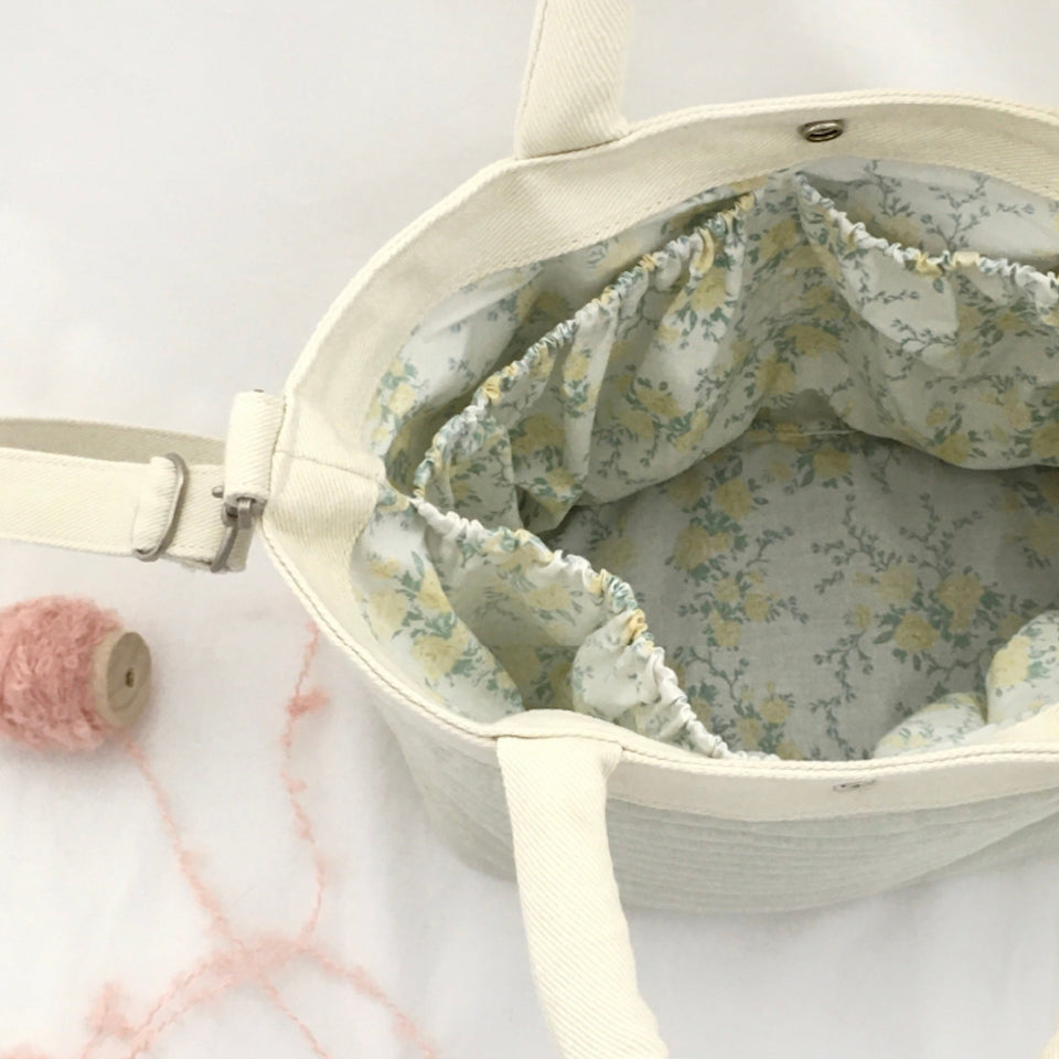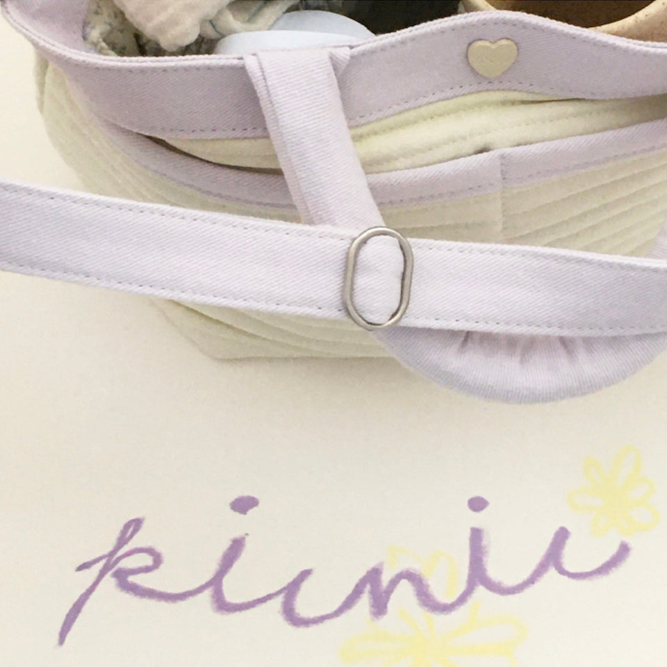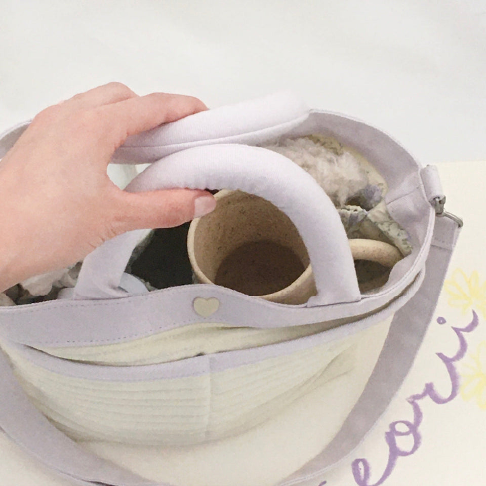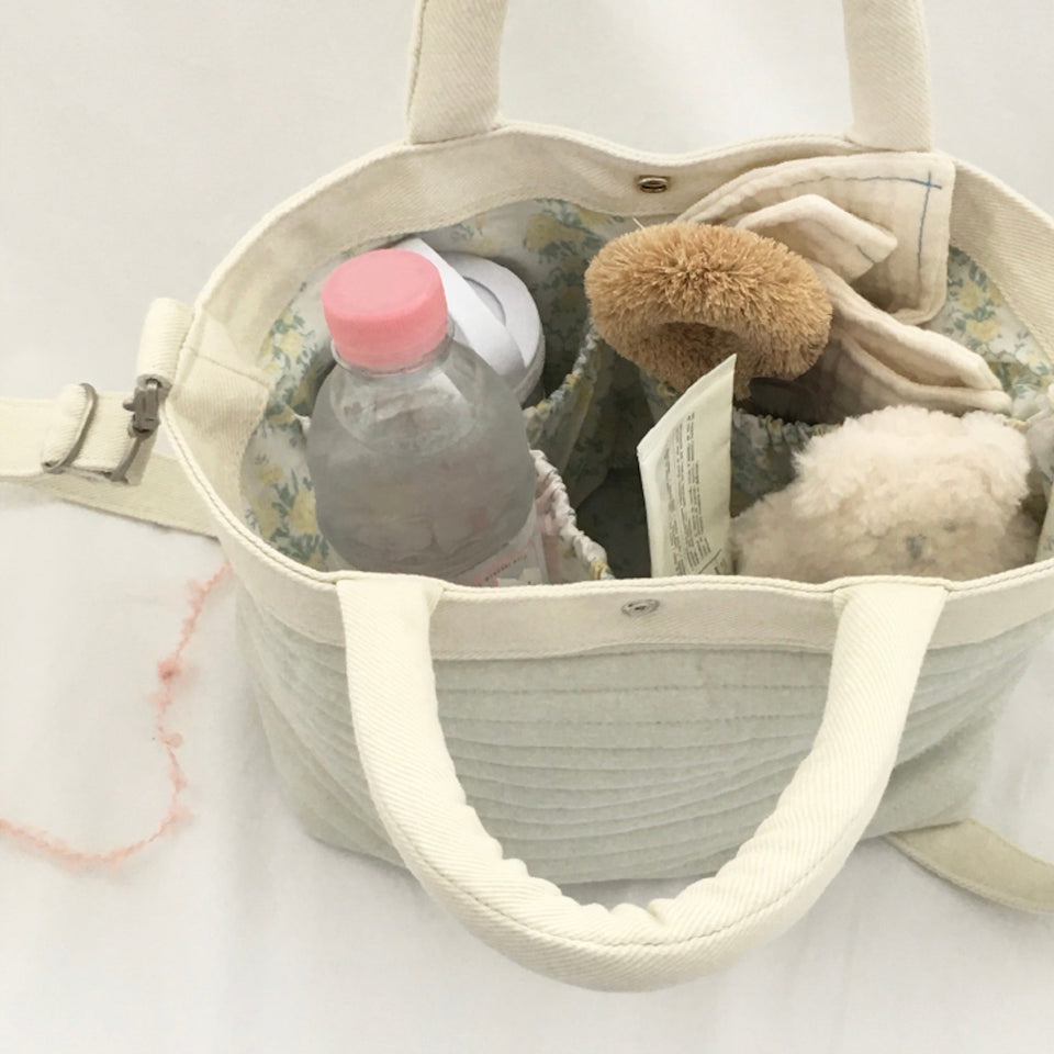 内側はseoruらしい小花柄の生地を用いてスリング同様、底板も外せるので洗濯も楽チンで、さらに底が安定しているのでたくさんの荷物を入れても弛まず感じる重みも軽減した上に見た目もスッキリ!