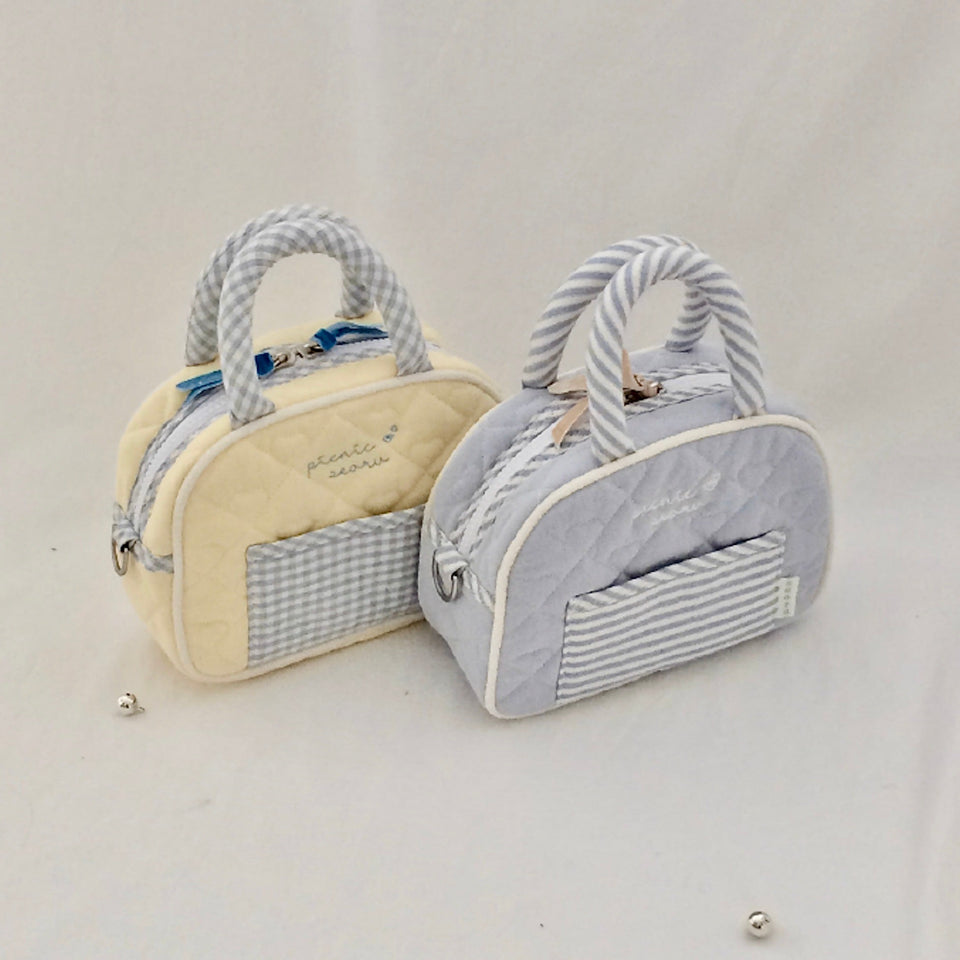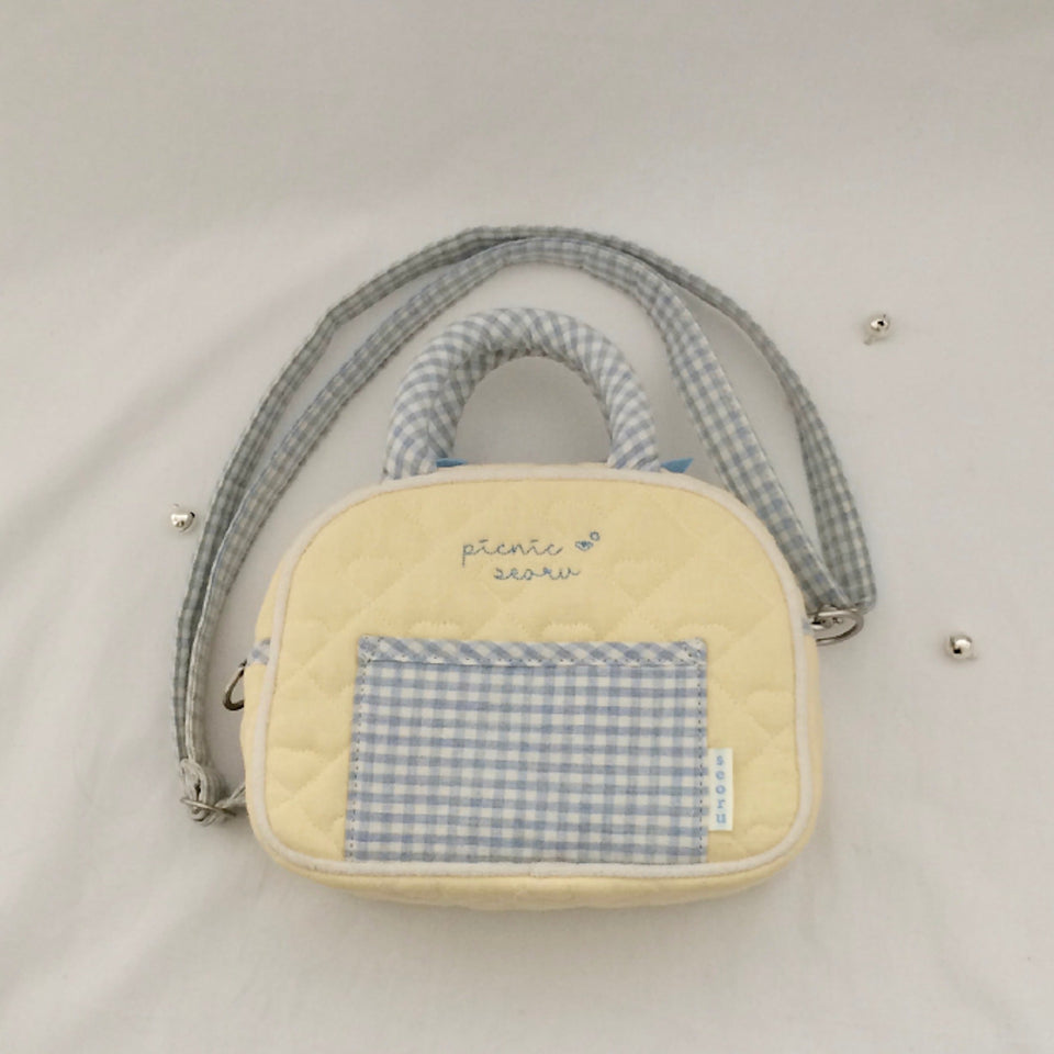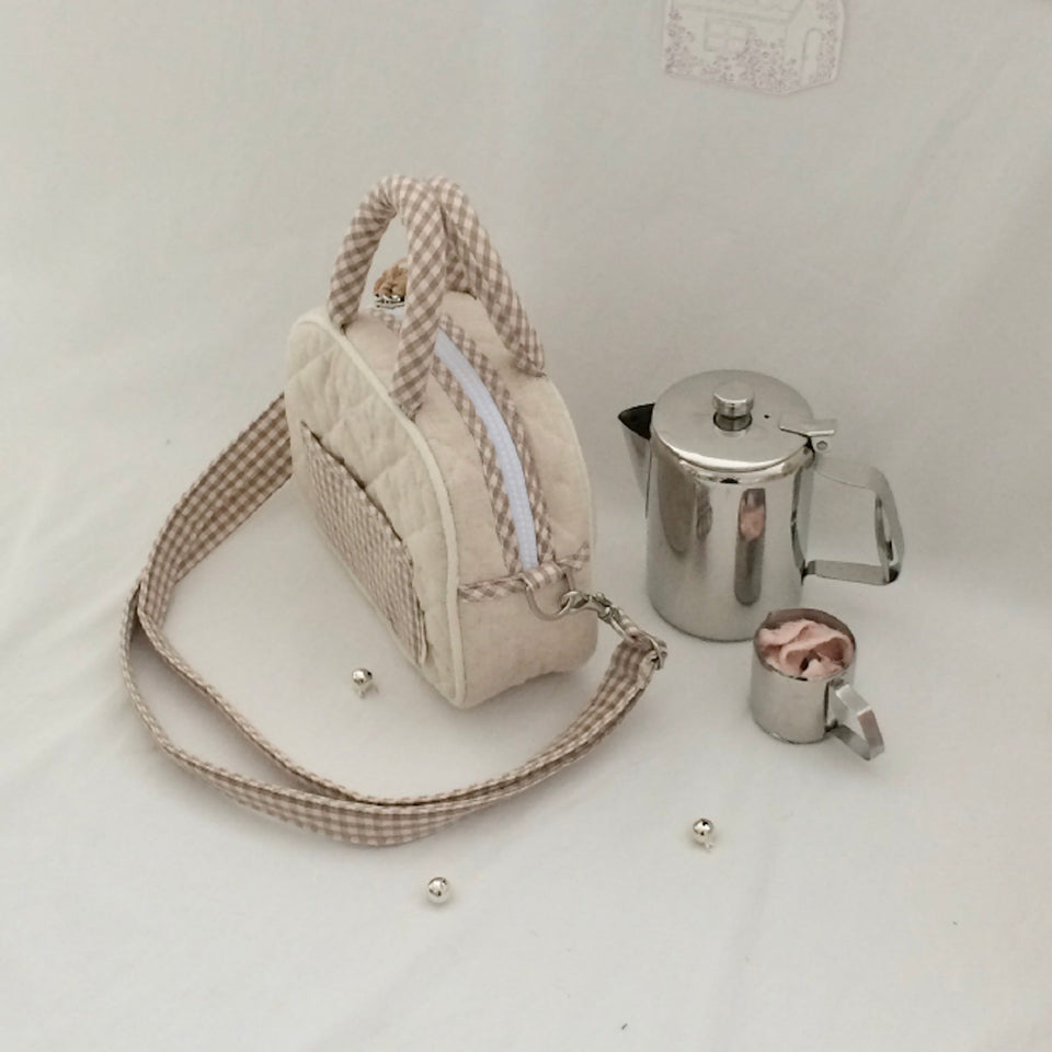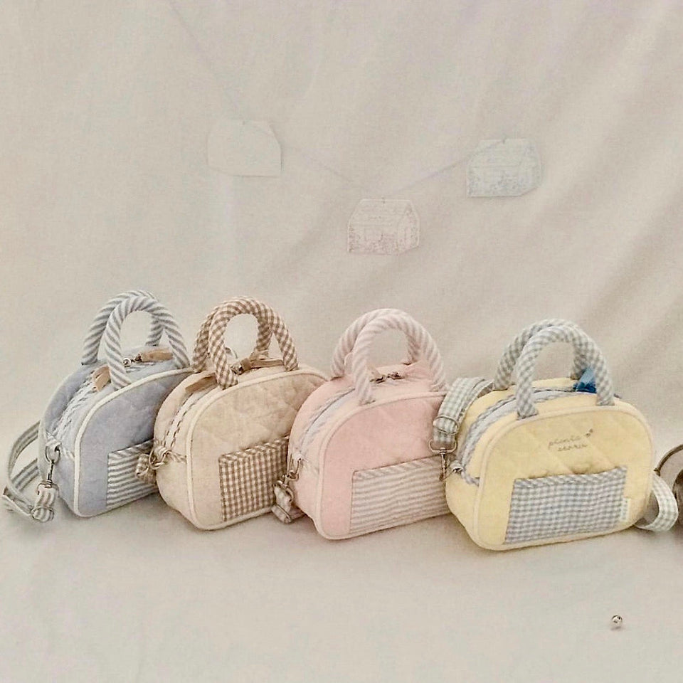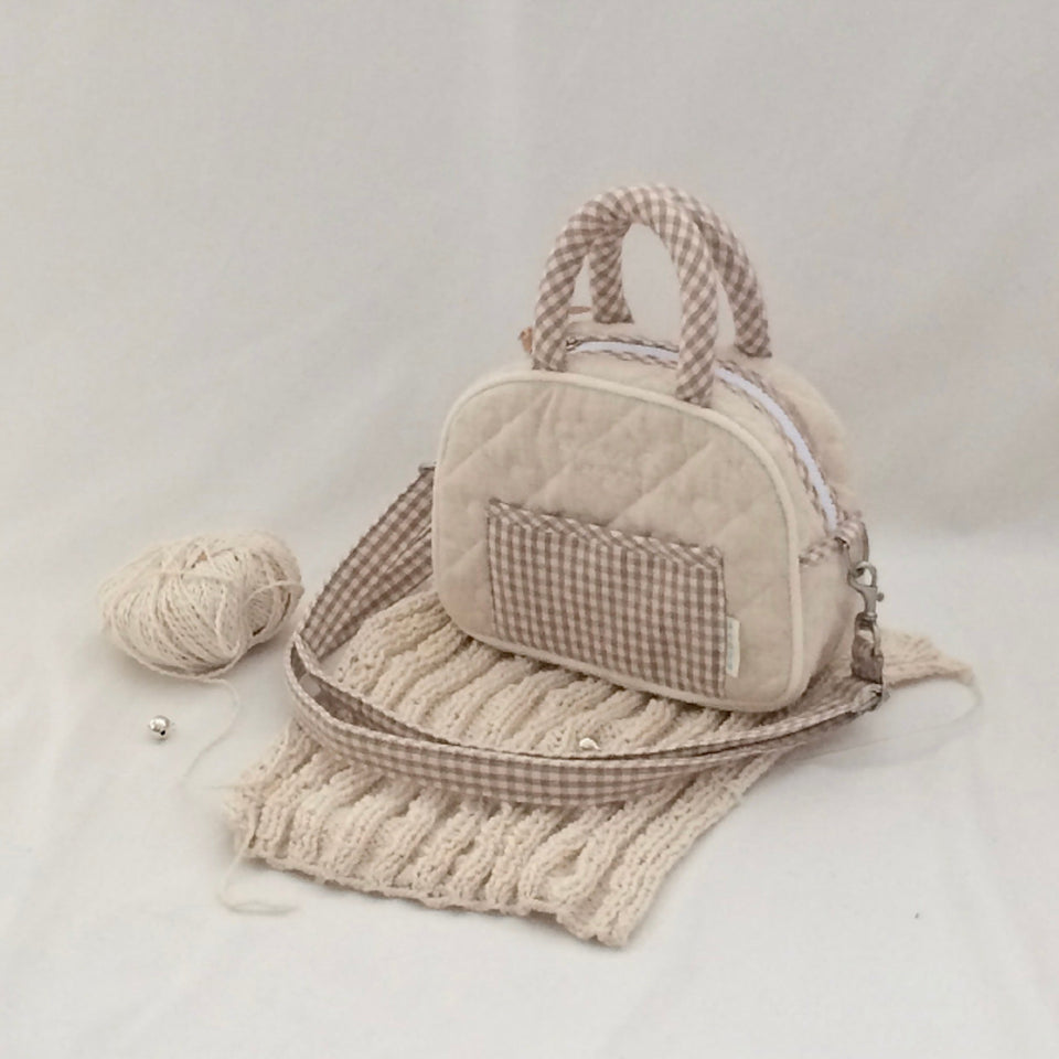 コットン100%のseoruらしいヴィンテージキルティング生地にポケットやハンドル、ストラップにチェックやストライプをあわせたseoruらしいデザインのお散歩バッグ!
