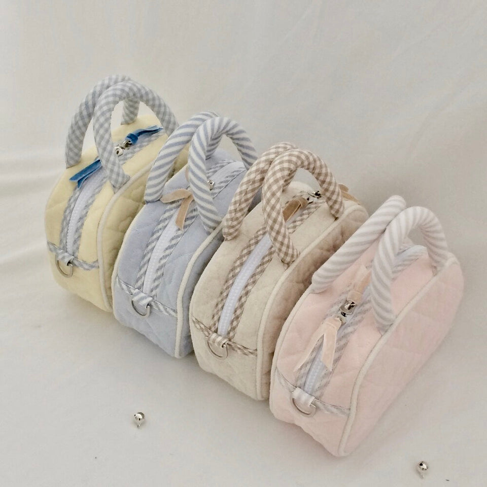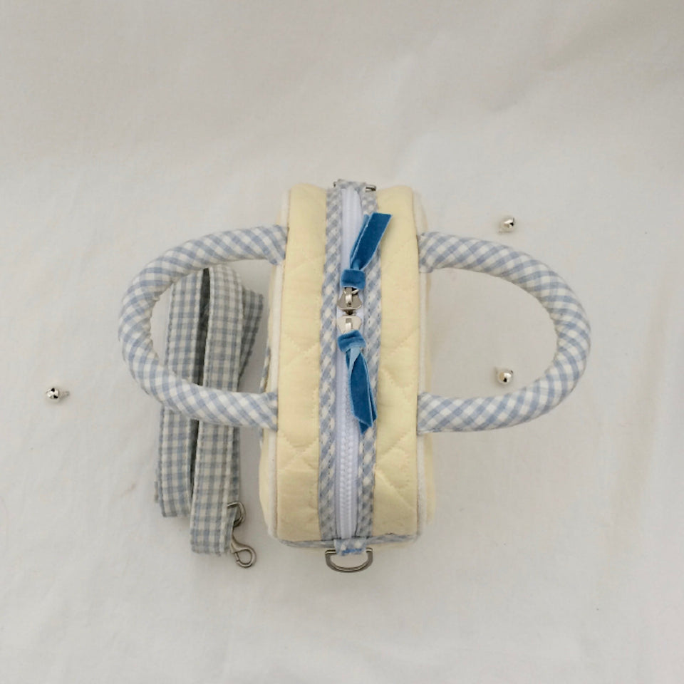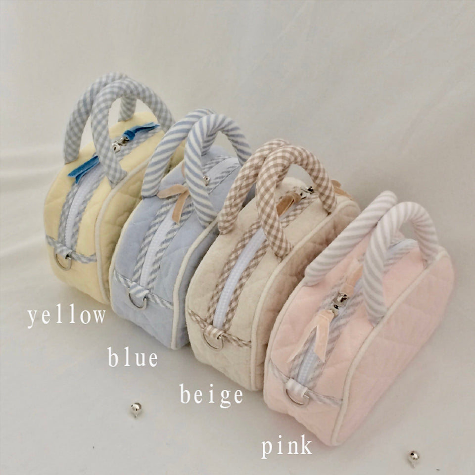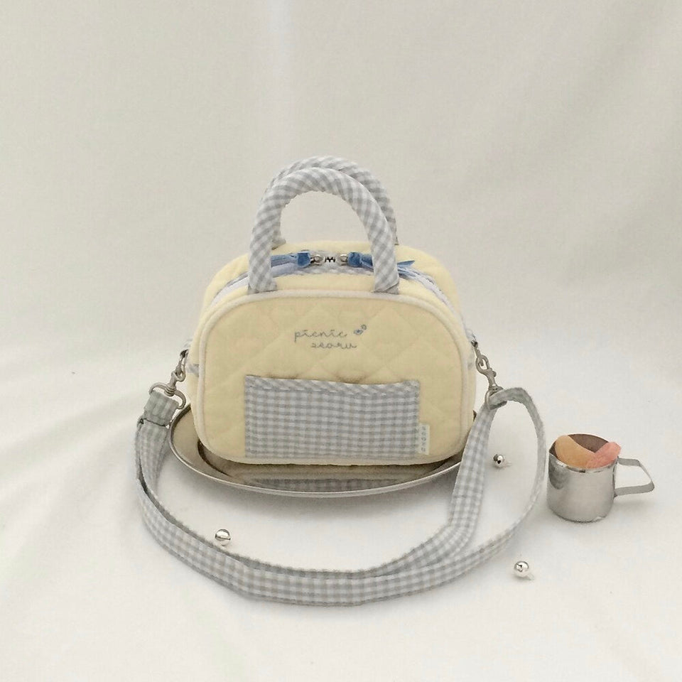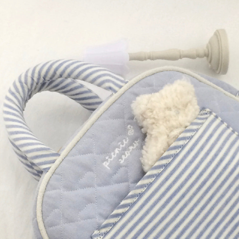 コットン100%のseoruらしいヴィンテージキルティング生地にポケットやハンドル、ストラップにチェックやストライプをあわせたseoruらしいデザインのお散歩バッグ!