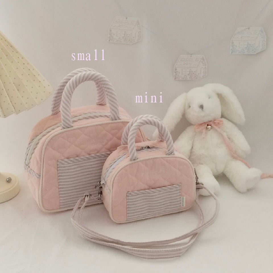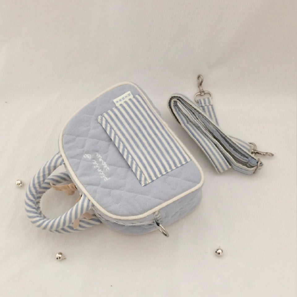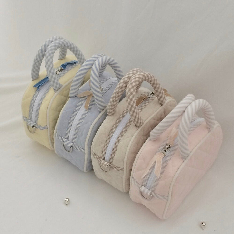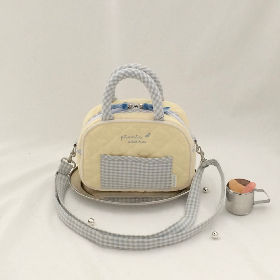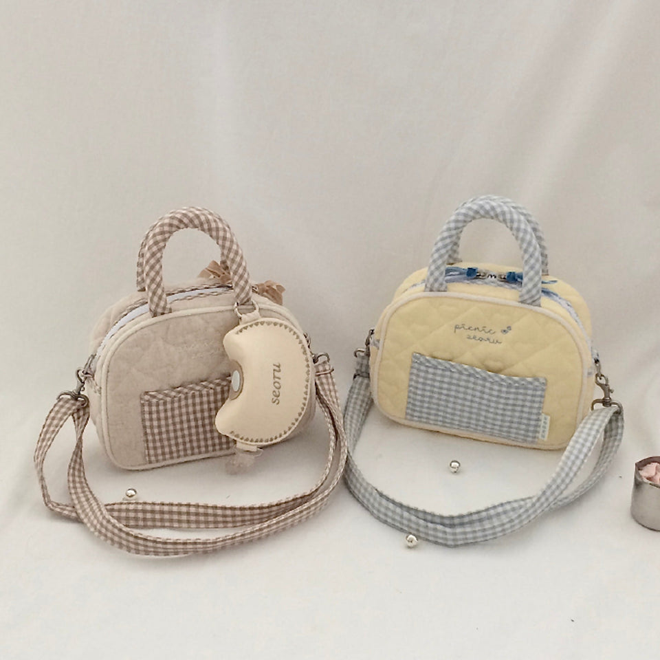 コットン100%のseoruらしいヴィンテージキルティング生地にポケットやハンドル、ストラップにチェックやストライプをあわせたseoruらしいデザインのお散歩バッグ!