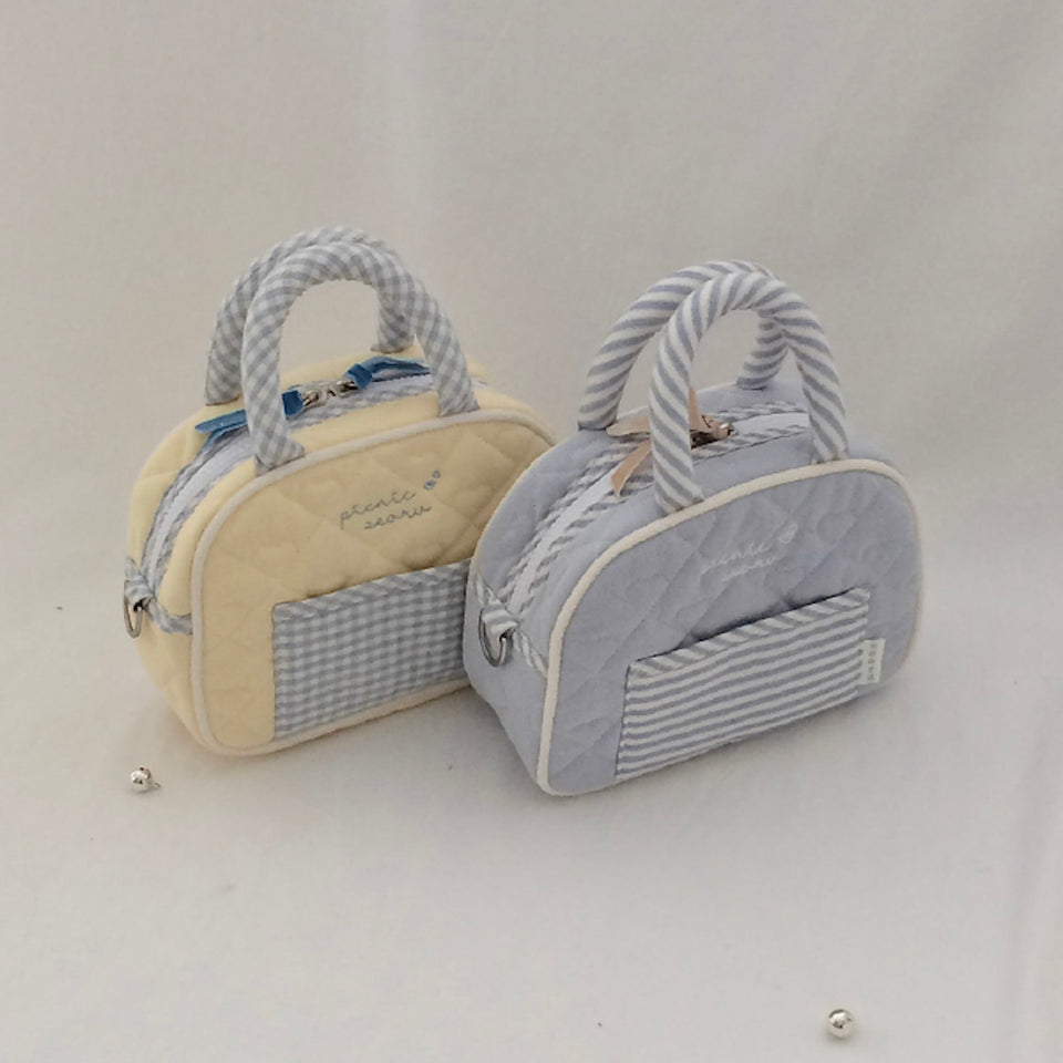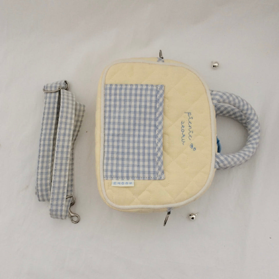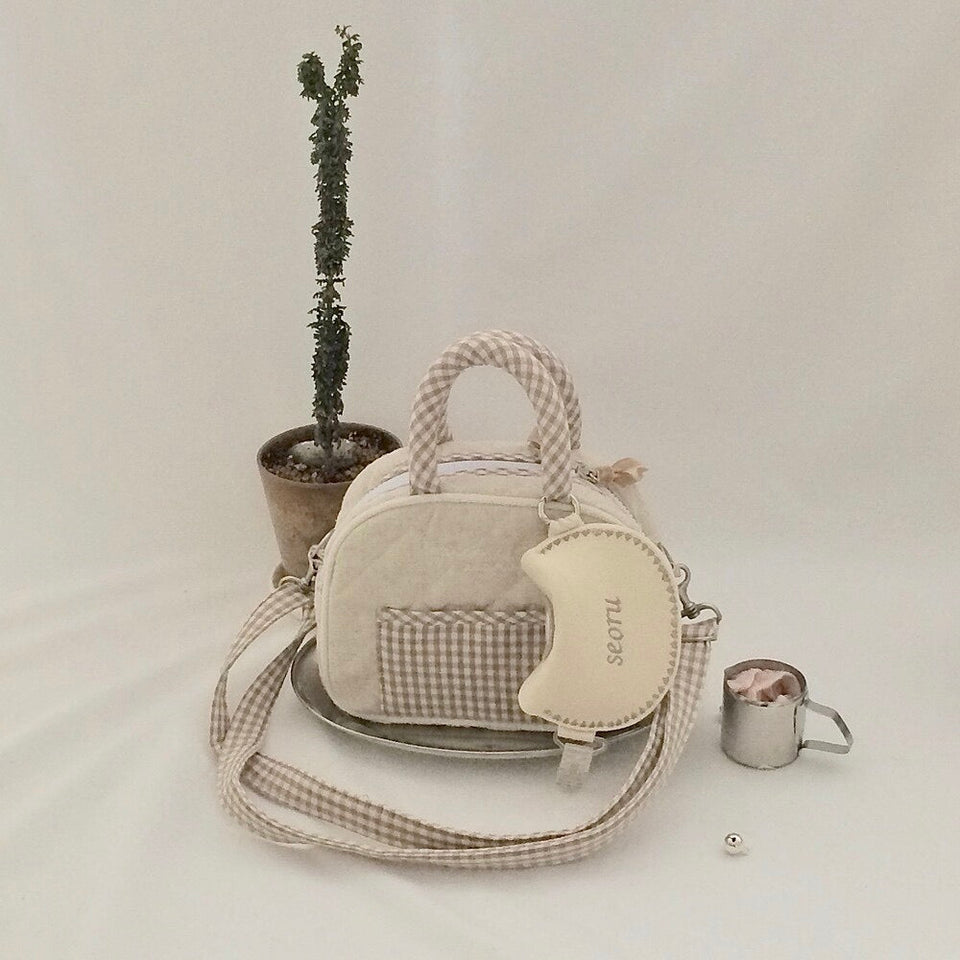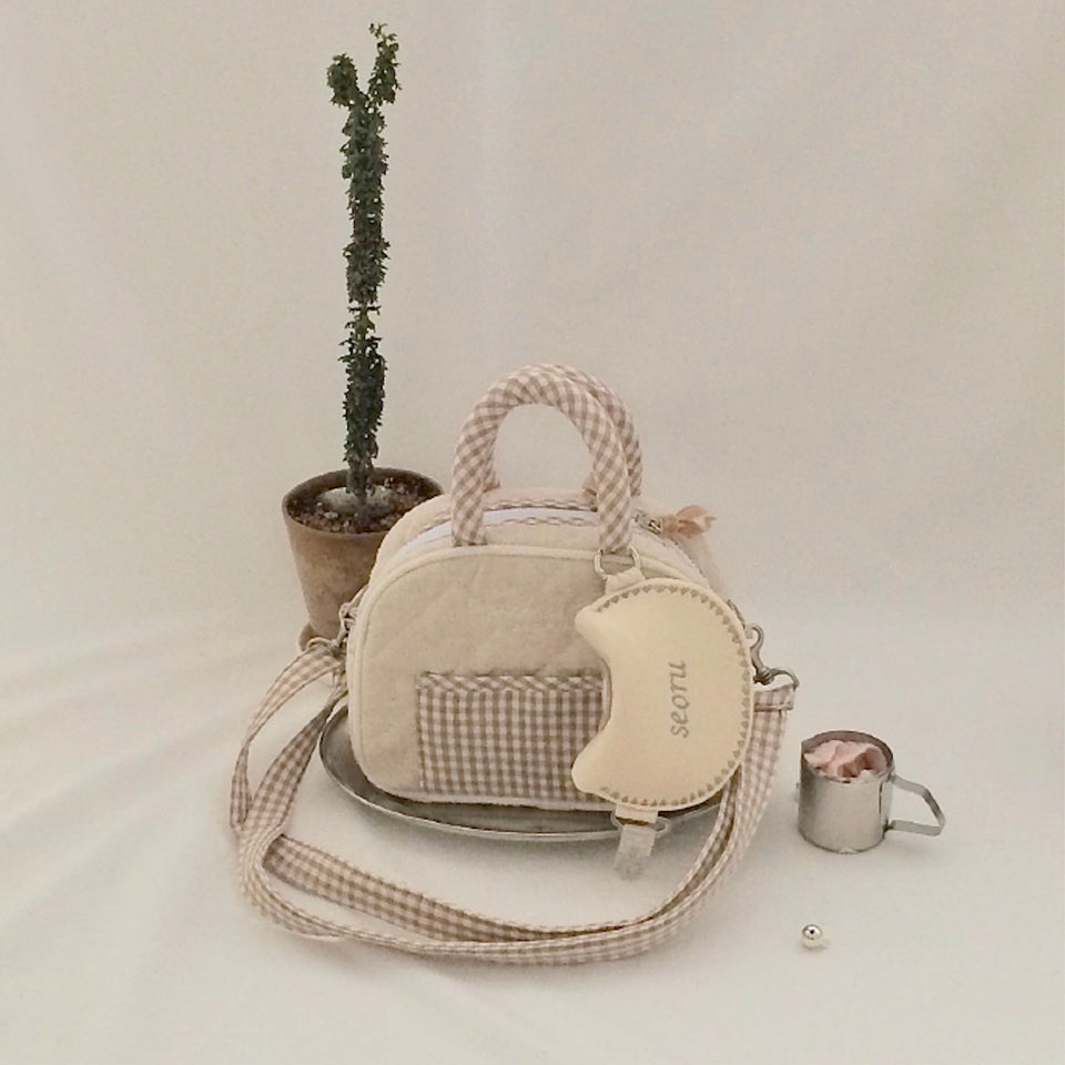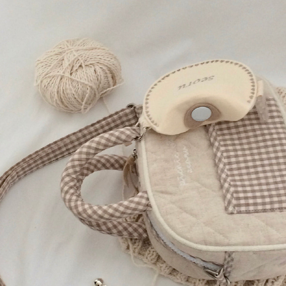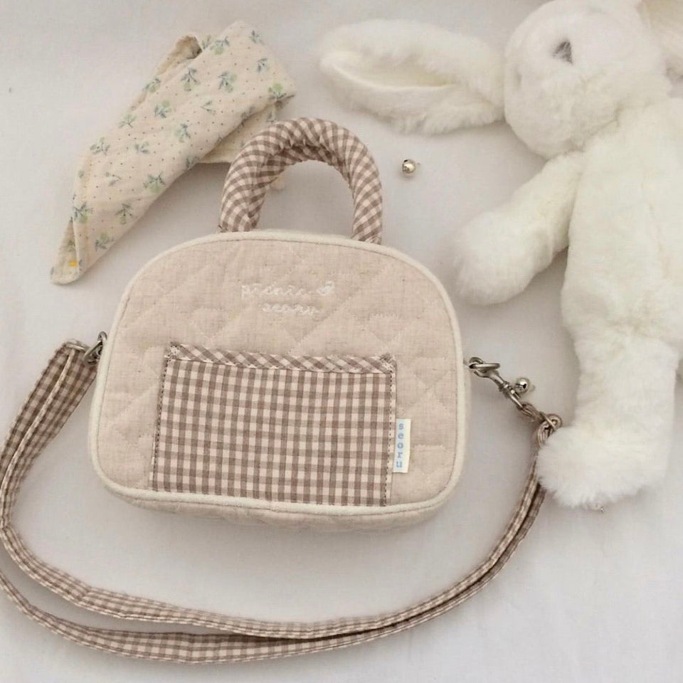コットン100%のseoruらしいヴィンテージキルティング生地にポケットやハンドル、ストラップにチェックやストライプをあわせたseoruらしいデザインのお散歩バッグ!