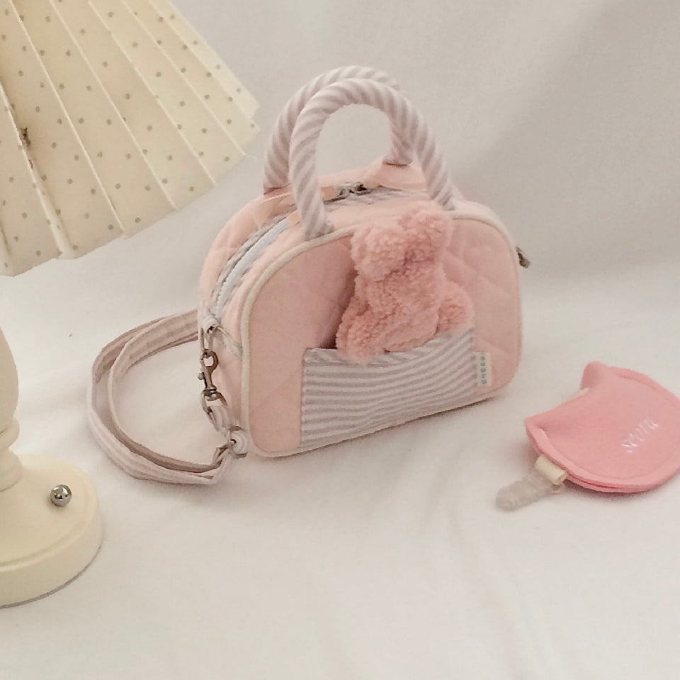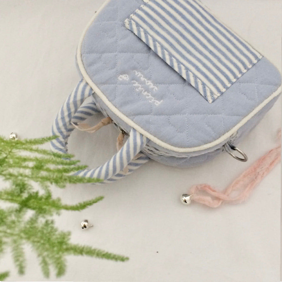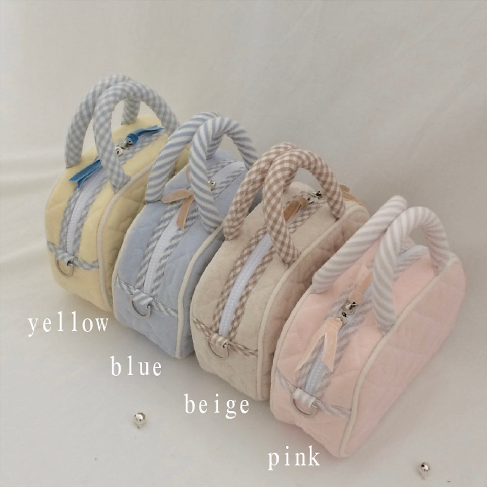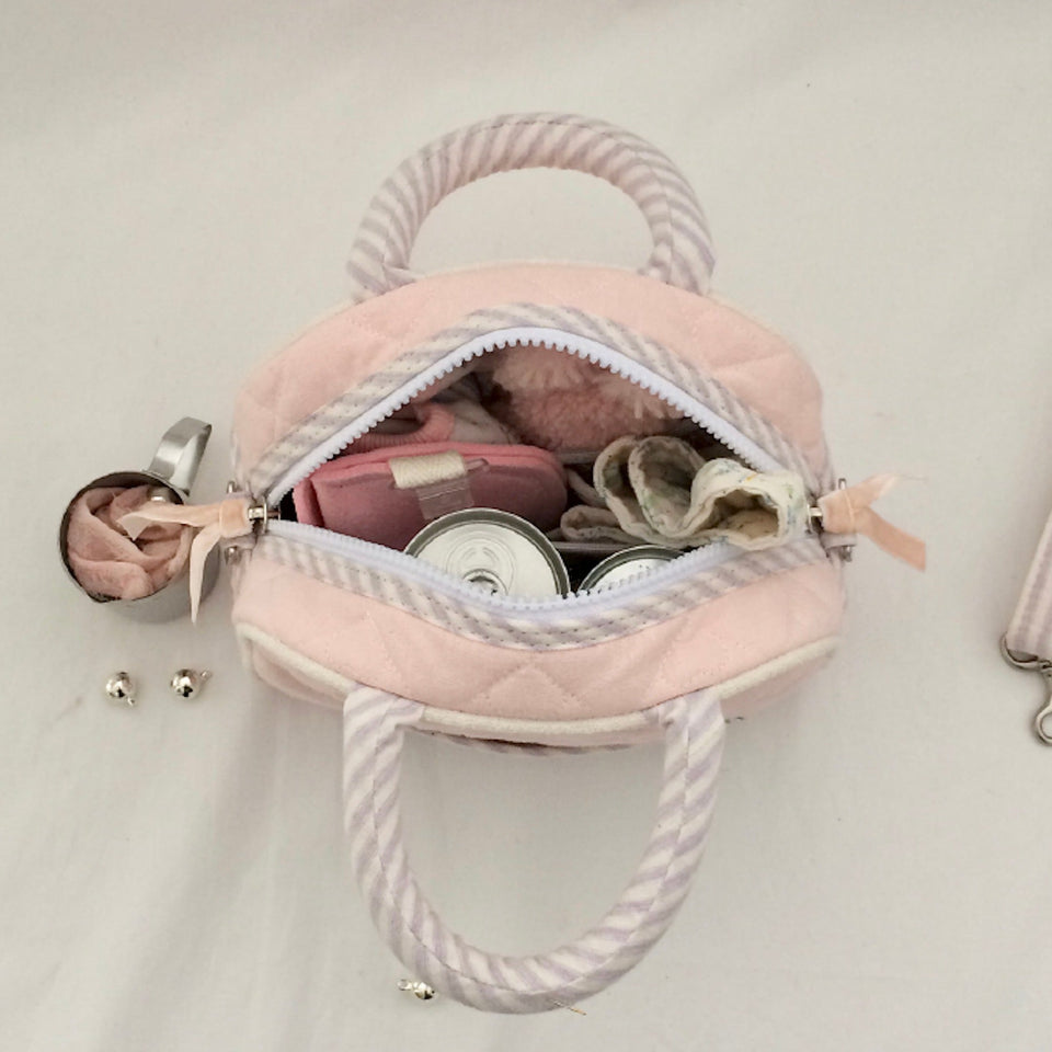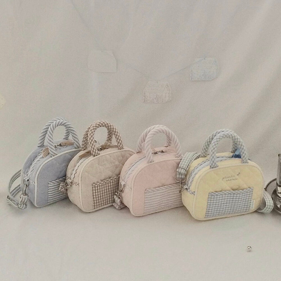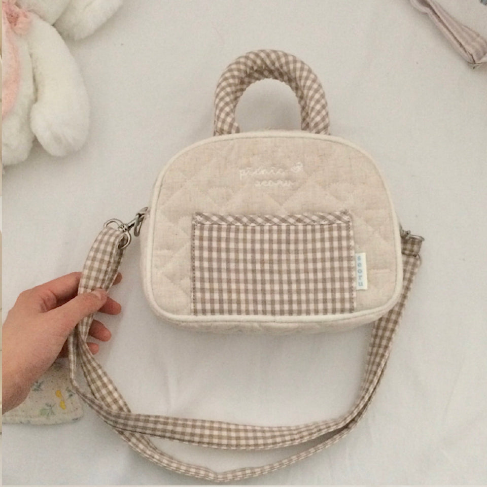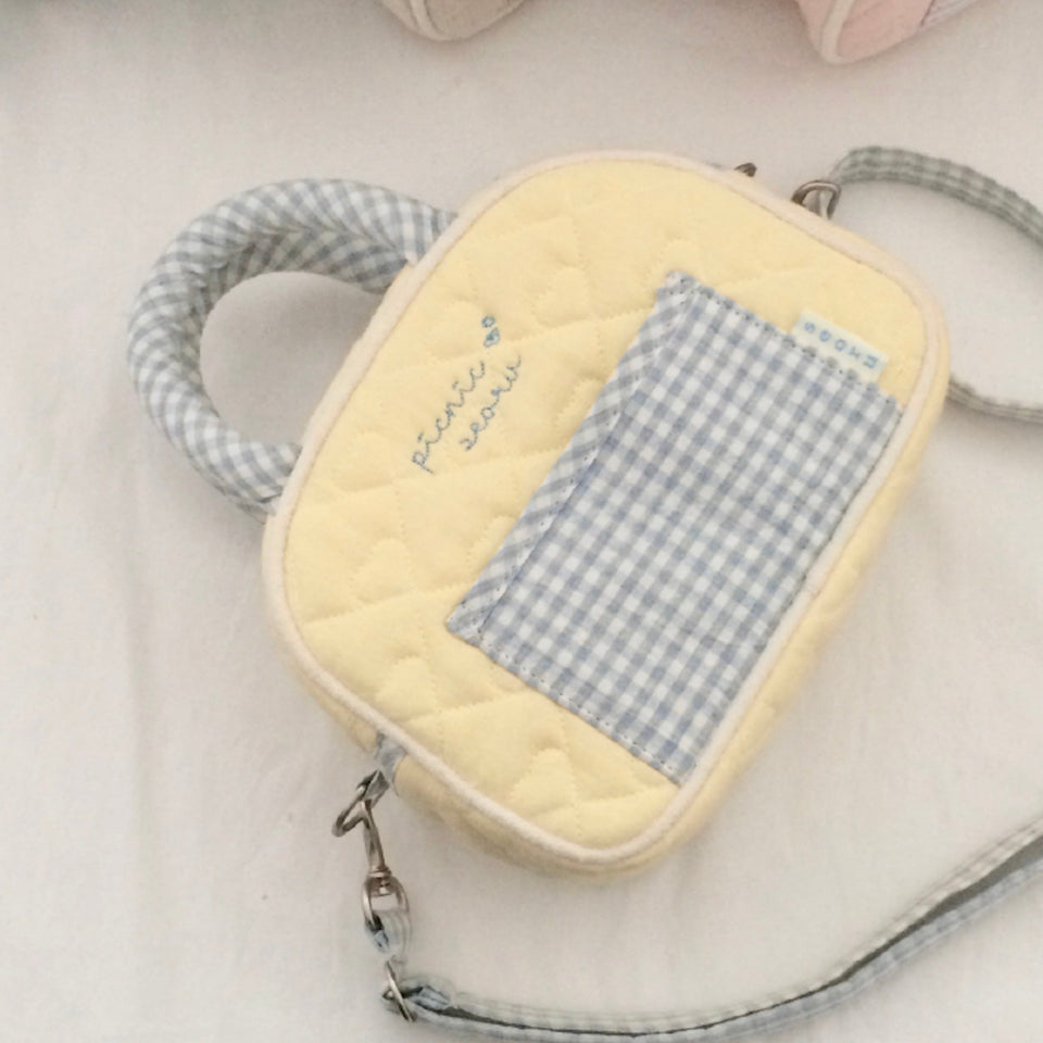 コットン100%のseoruらしいヴィンテージキルティング生地にポケットやハンドル、ストラップにチェックやストライプをあわせたseoruらしいデザインのお散歩バッグ!