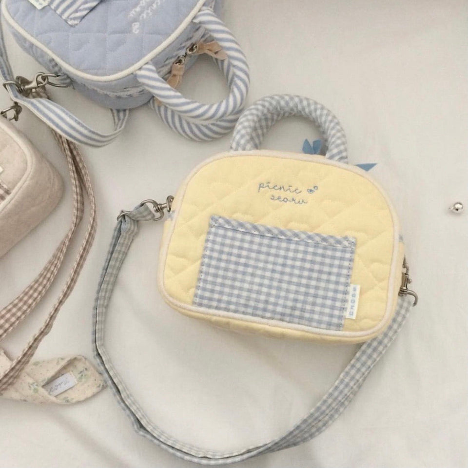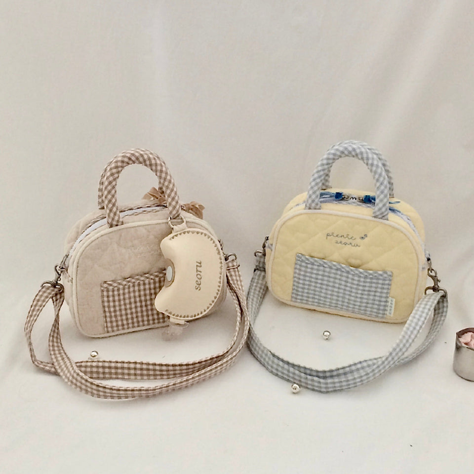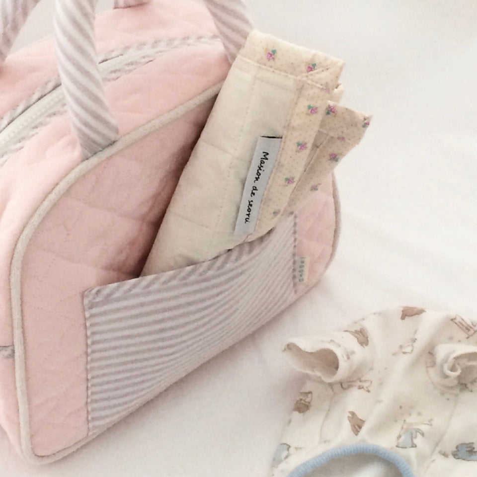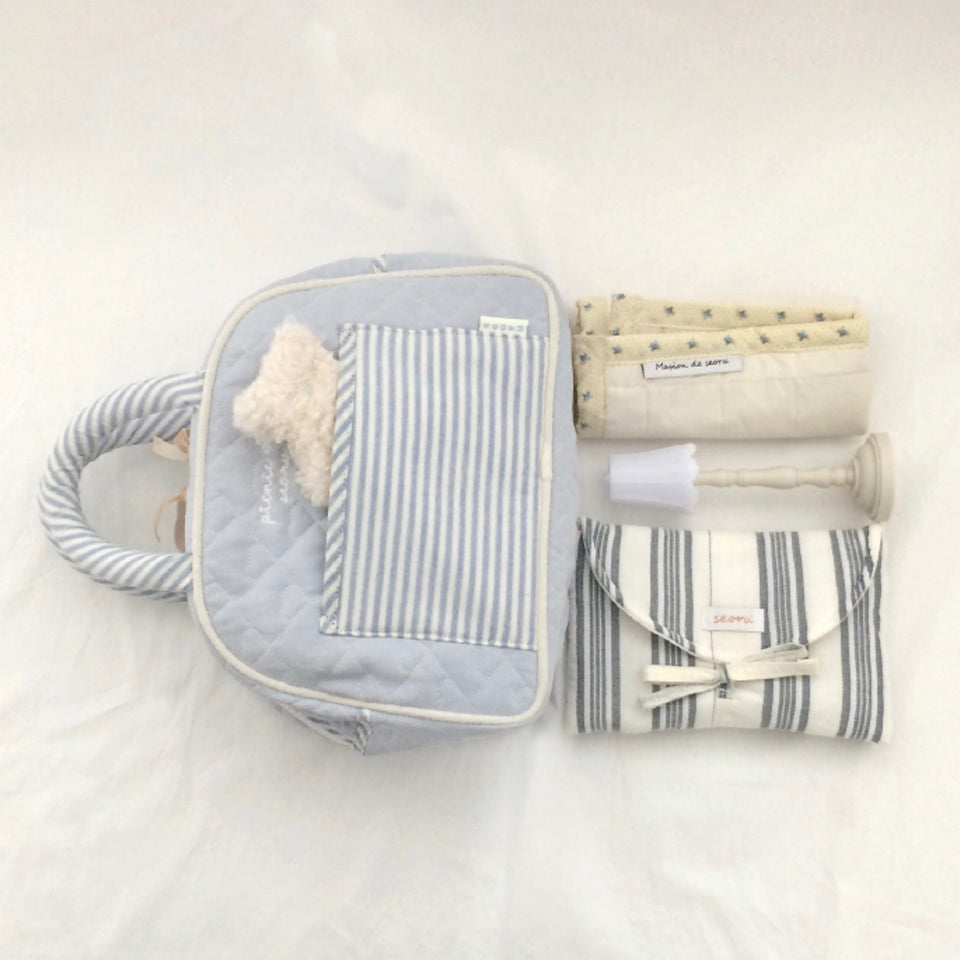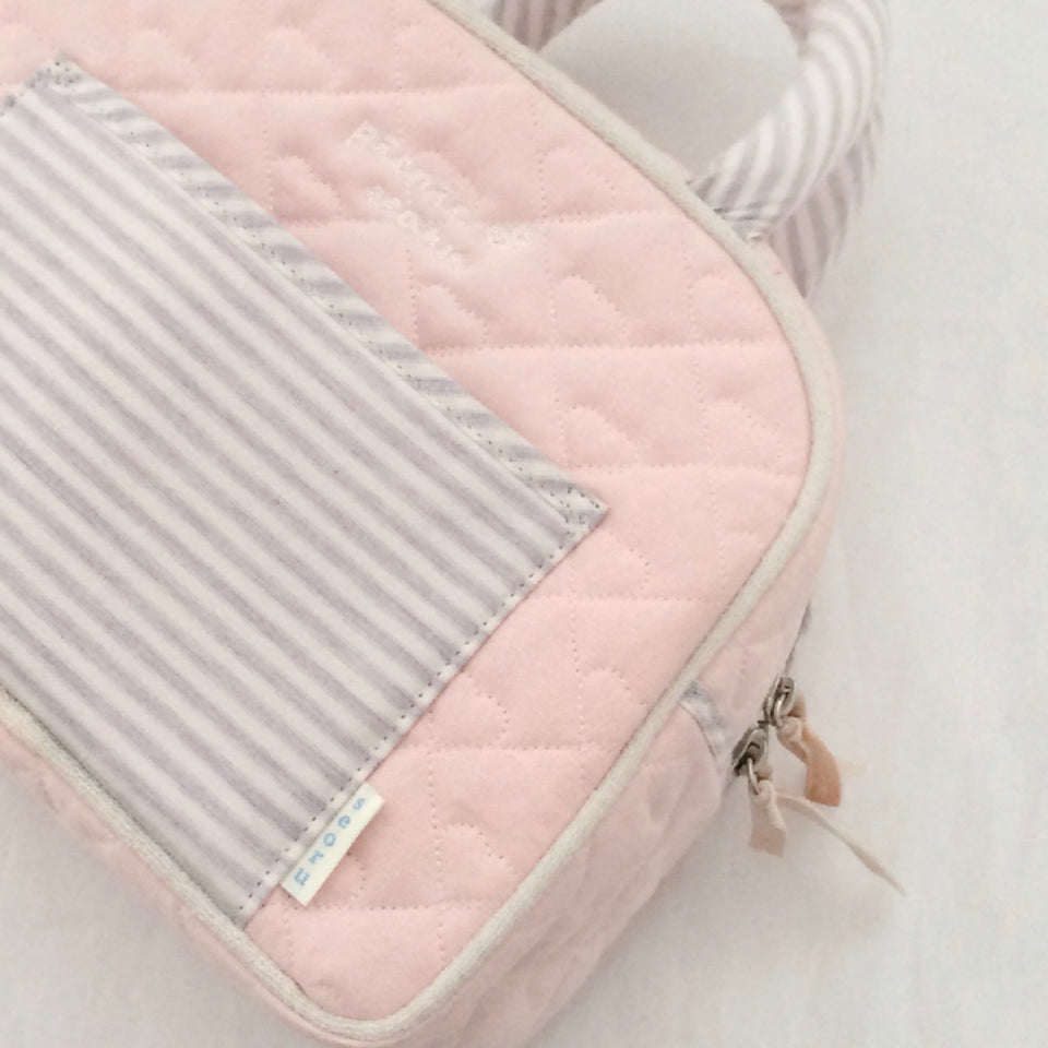 コットン100%のseoruらしいヴィンテージキルティング生地にポケットやハンドル、ストラップにチェックやストライプをあわせたseoruらしいデザインのお散歩バッグ!