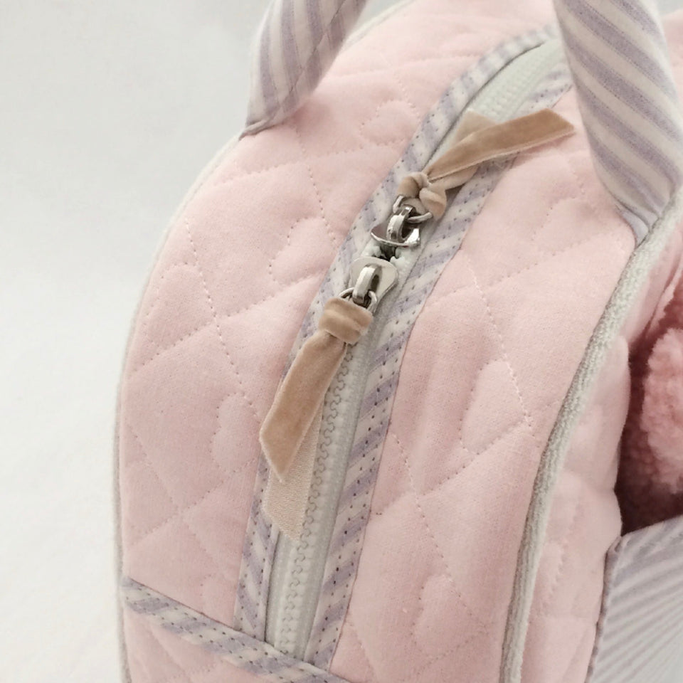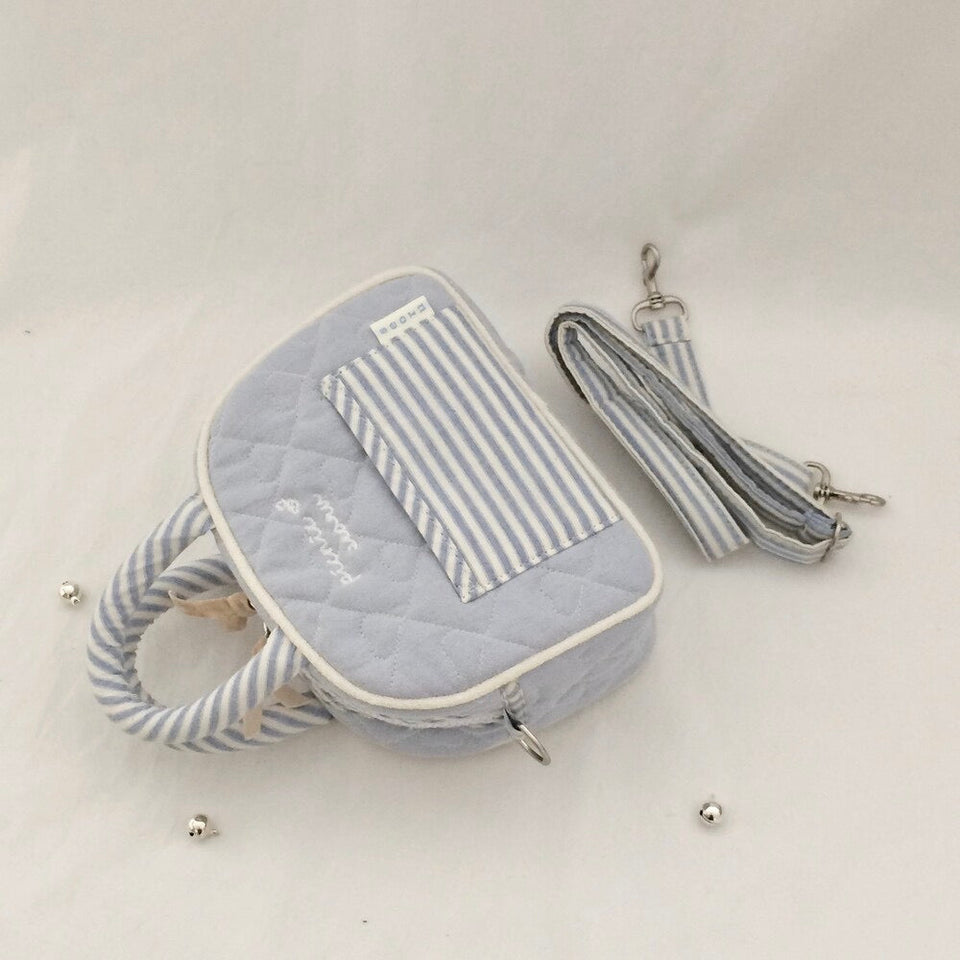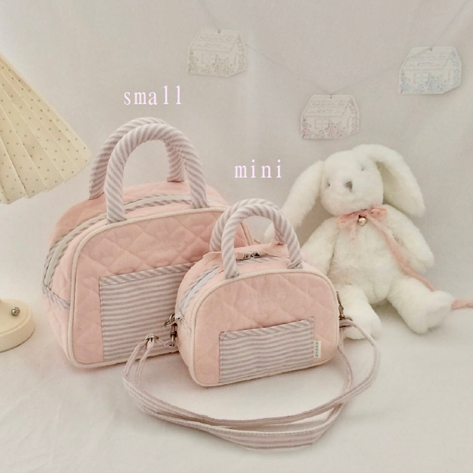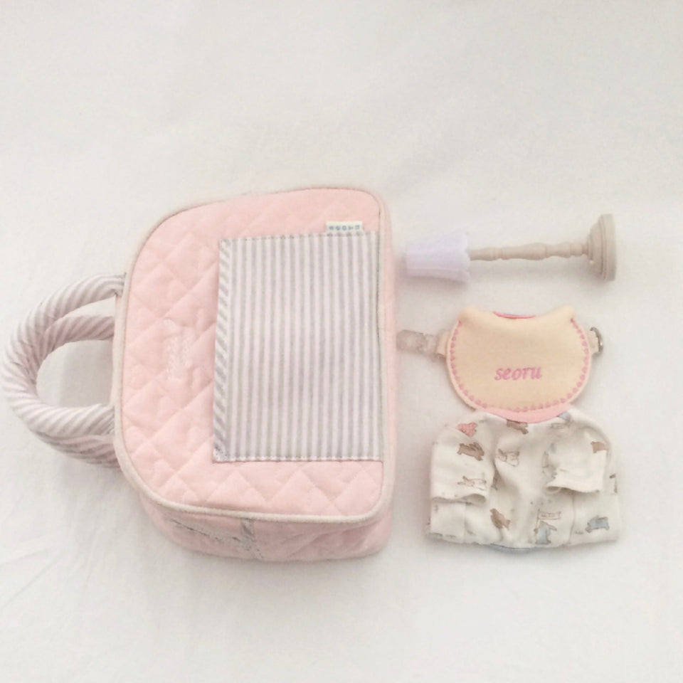 コットン100%のseoruらしいヴィンテージキルティング生地にポケットやハンドル、ストラップにチェックやストライプをあわせたseoruらしいデザインのお散歩バッグ!
